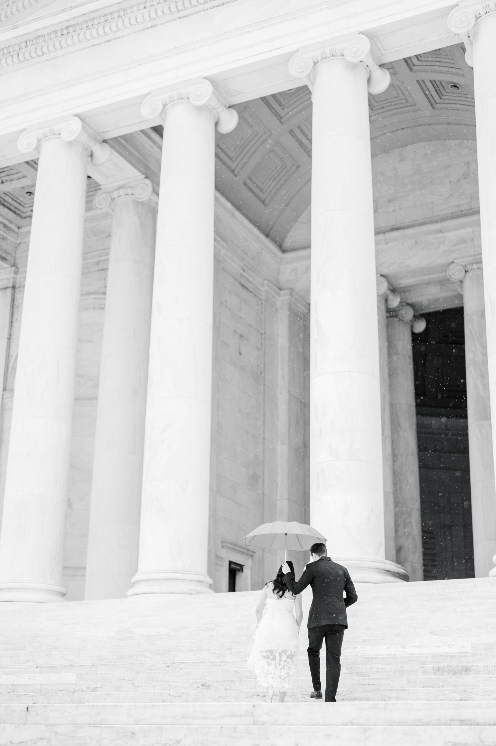 Next, we headed to the Jefferson Memorial, where the newlyweds were showered with congratulations and well-wishes from all the tourists they encountered along the way. This added an extra layer of sweetness to an already incredible day, as Sofía and Timmy basked in the glow of their newfound marital bliss. Their chemistry and genuine happiness were palpable, and I couldn’t help but feel honored to capture these precious moments through my lens.