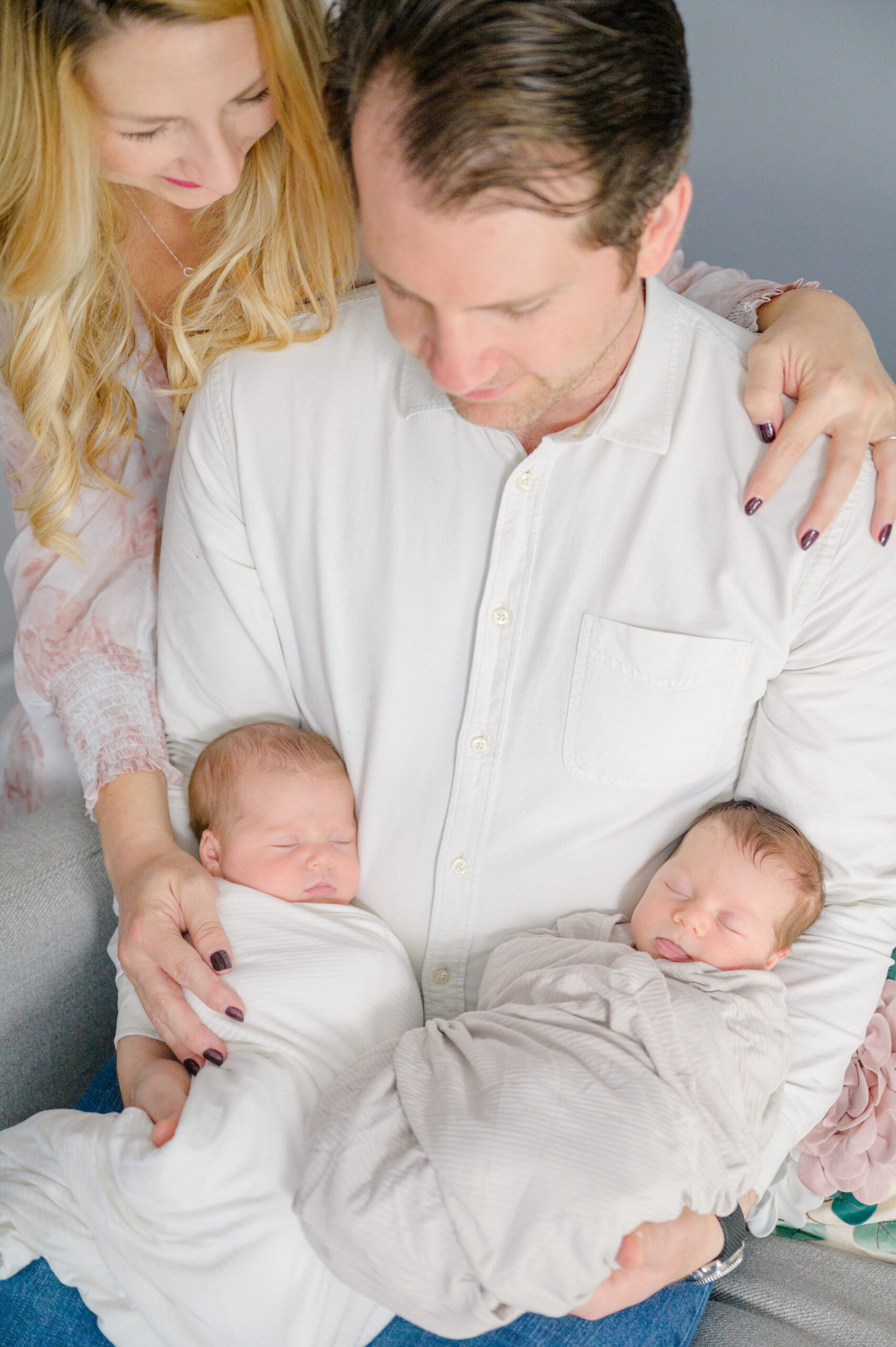 Stacy, proud mama of 3 beautiful kiddos, radiated with joy as she donned a beautiful dress from the CKP client closet. The newborn girls were wrapped in coordinating swaddles, ensuring they had their own unique touch within their final gallery. With their individuality celebrated, we embarked on capturing the essence of this growing family!