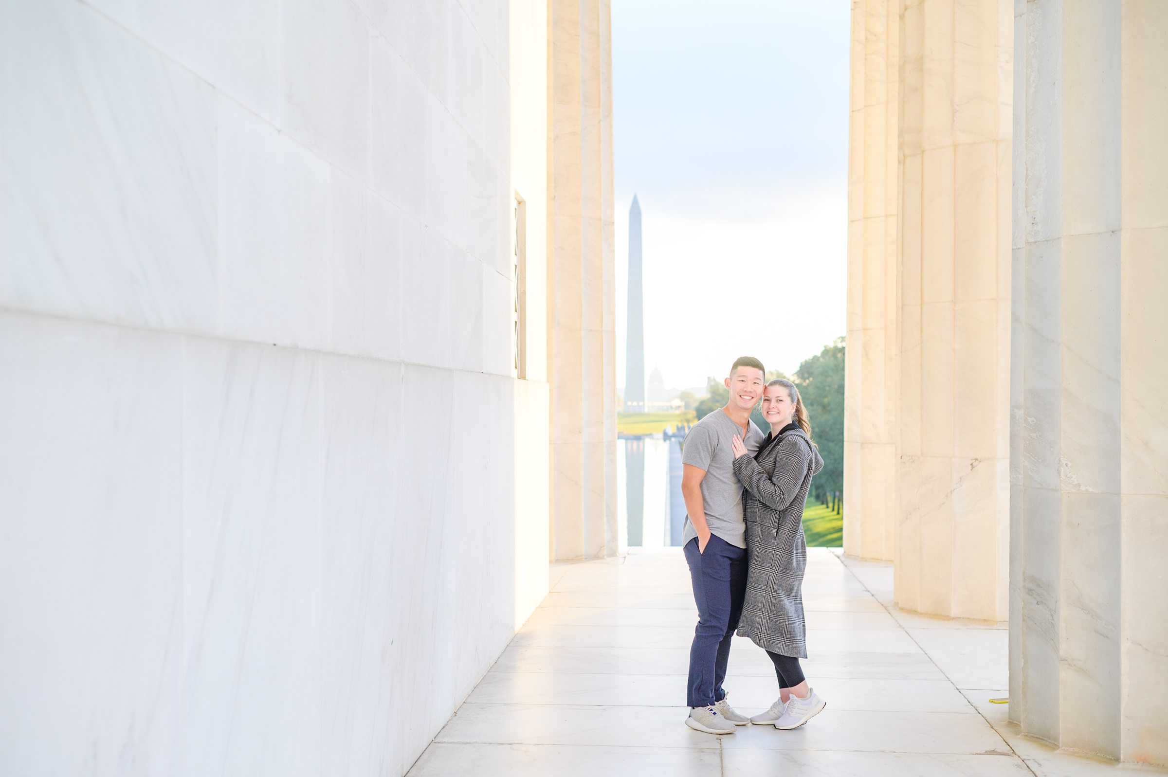 Leading up to their proposal, we actually had a ton of huge storms that caused a ton of flooding on the East Coast. I was a little worried we would have a gloomy or rainy morning (or would hit some flooding on our way to the monument!), ruining our plan to have the sunrise be a key factor to getting these two to Lincoln early without causing suspicion. Luckily though, things were SO meant to be! I got to Lincoln and realized that the clouds were just clear enough for us to get an early morning sunrise! From there, the sun actually started hiding behind a few clouds, making conditions PERFECT for exploring for portraits and photos with Lincoln from all angles! I hope you’re ready for some serious sweetness!