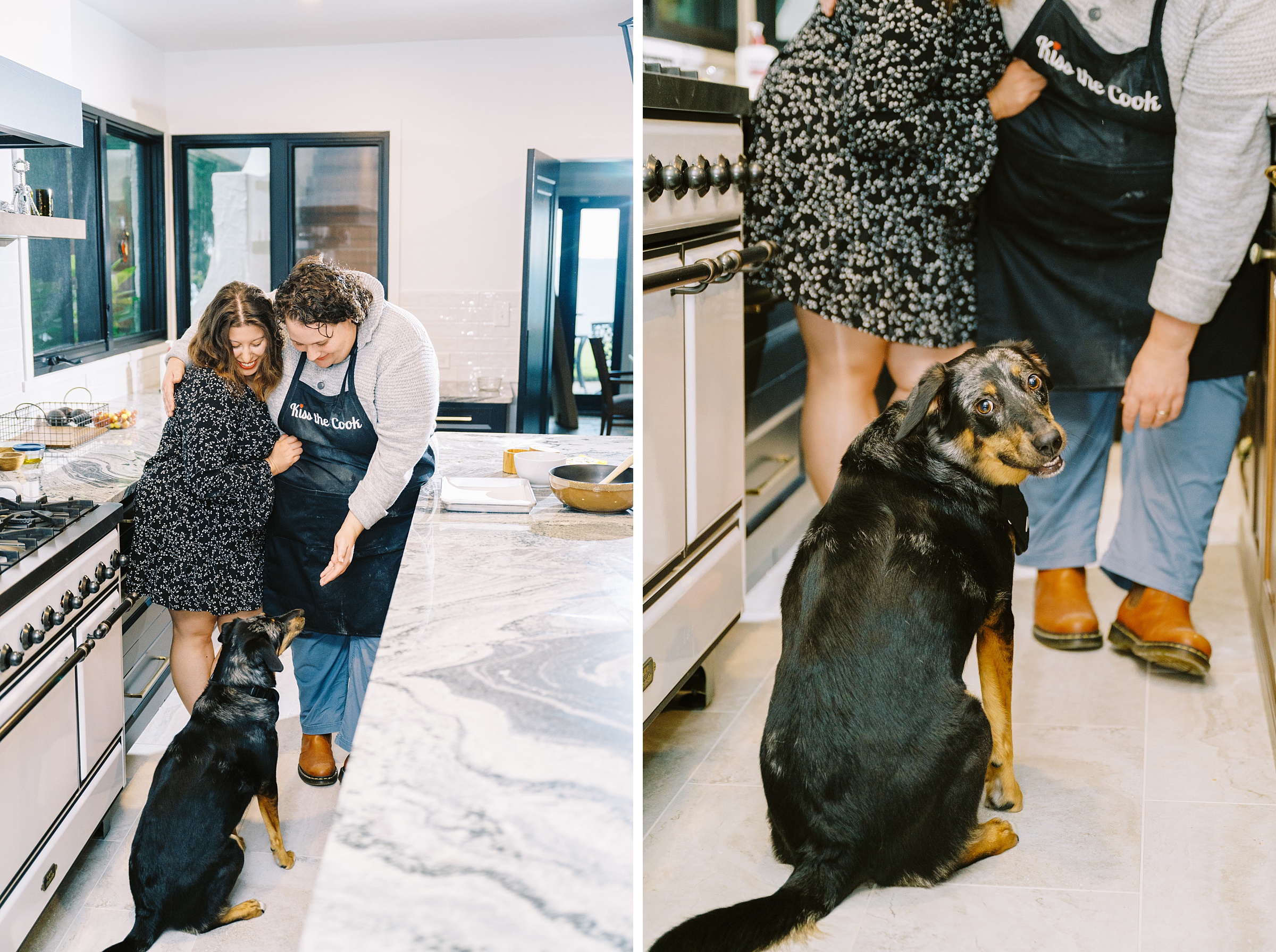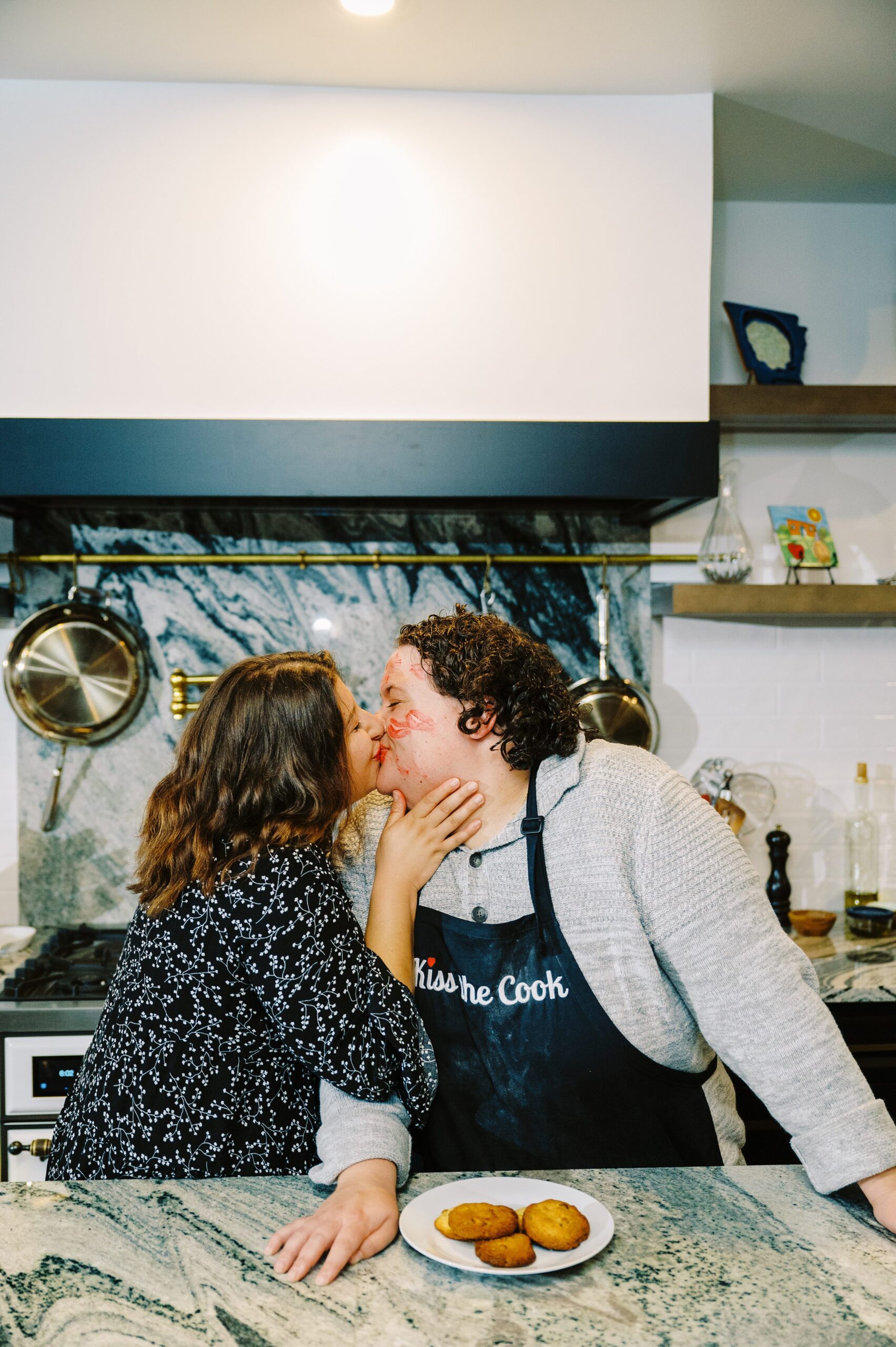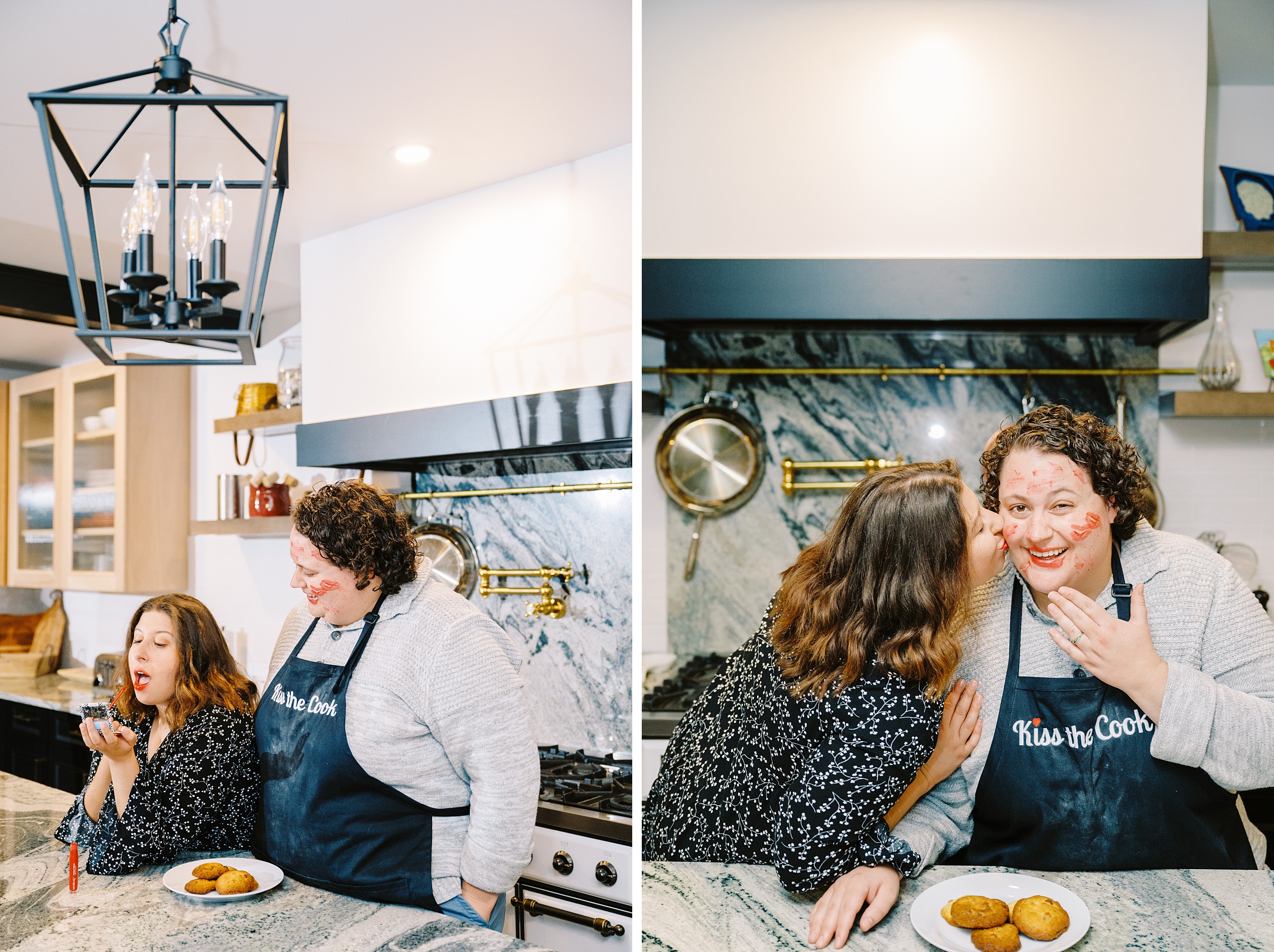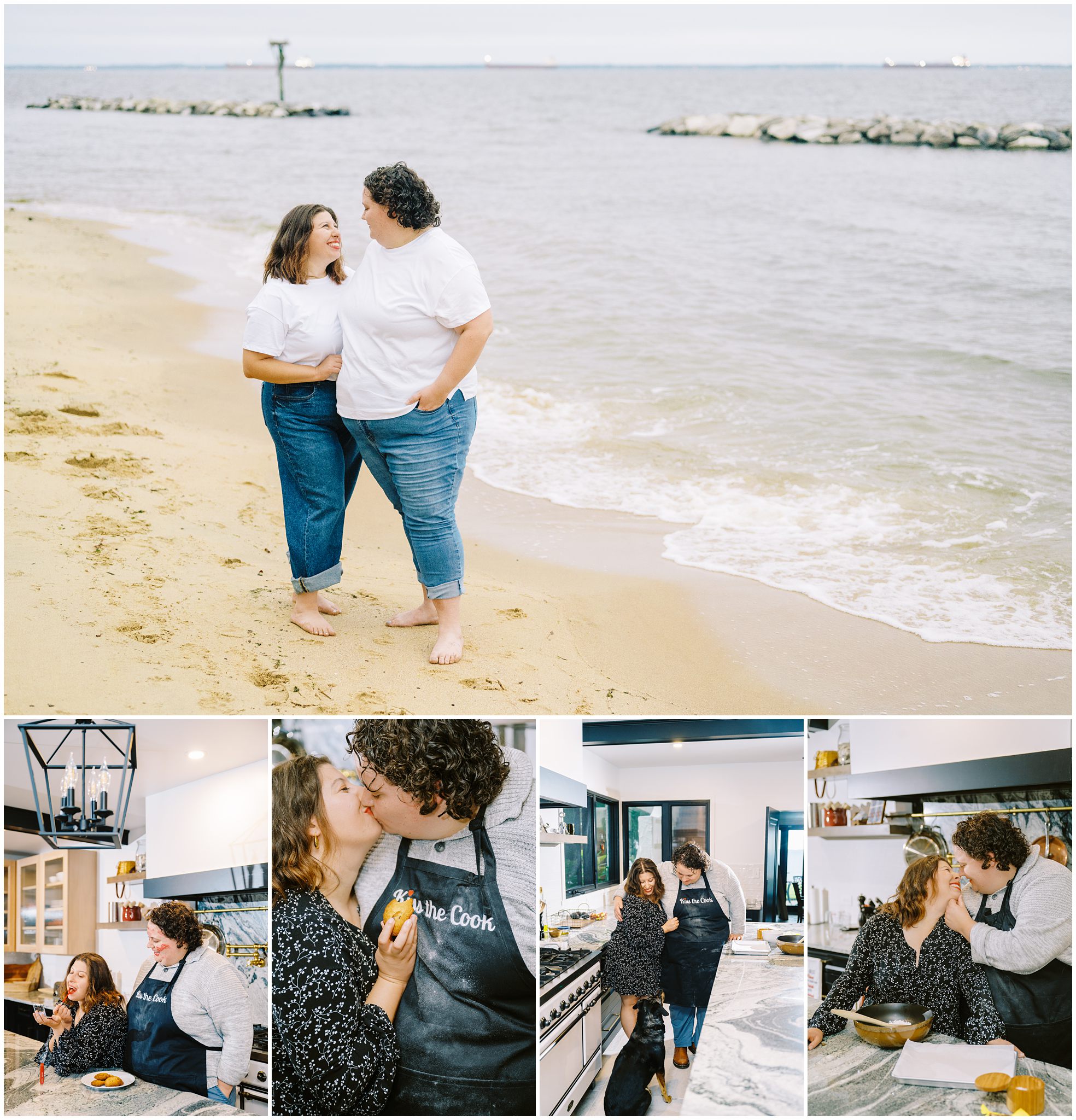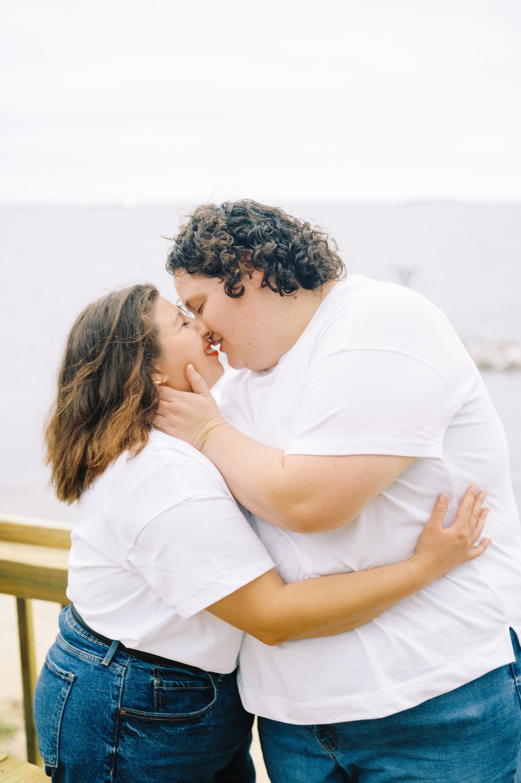 K and J came prepared with the sweetest ideas. We started in the kitchen with a “kiss the cook” moment while they baked cookies together. J wore red lipstick and kept sneaking little kisses onto K’s cheeks, and honestly, I could’ve photographed that scene all afternoon. Then we headed across the street to the bay after they changed into simple white tees and jeans, snuggled up with their pup, and leaned into the breezy shoreline vibes.