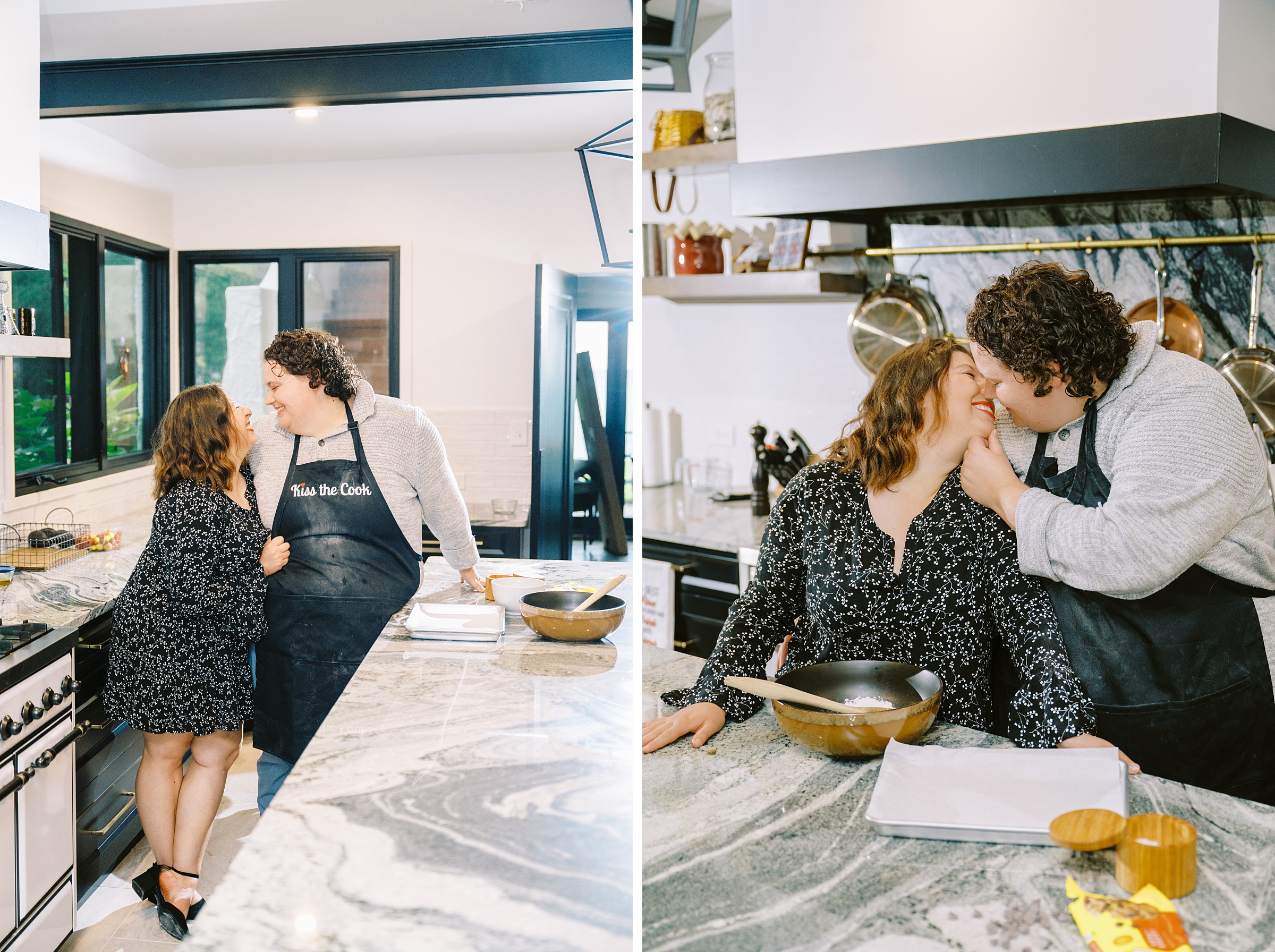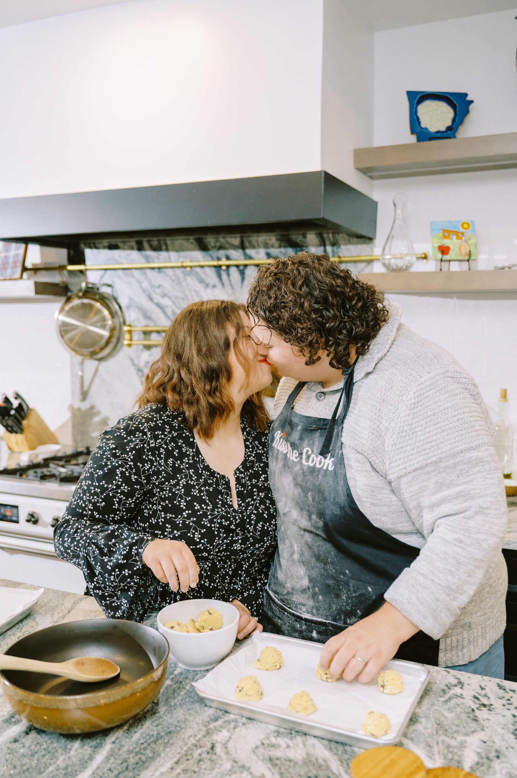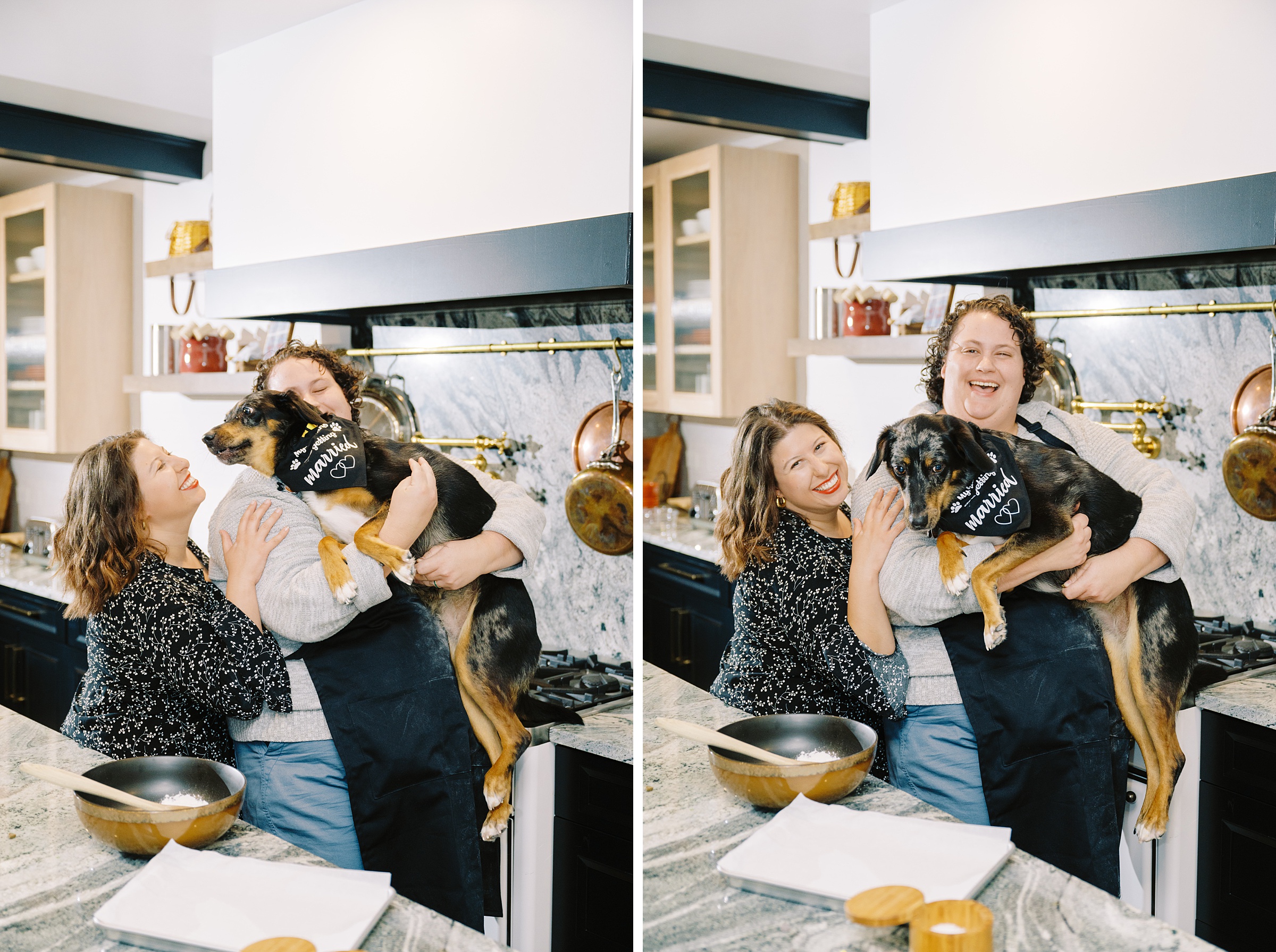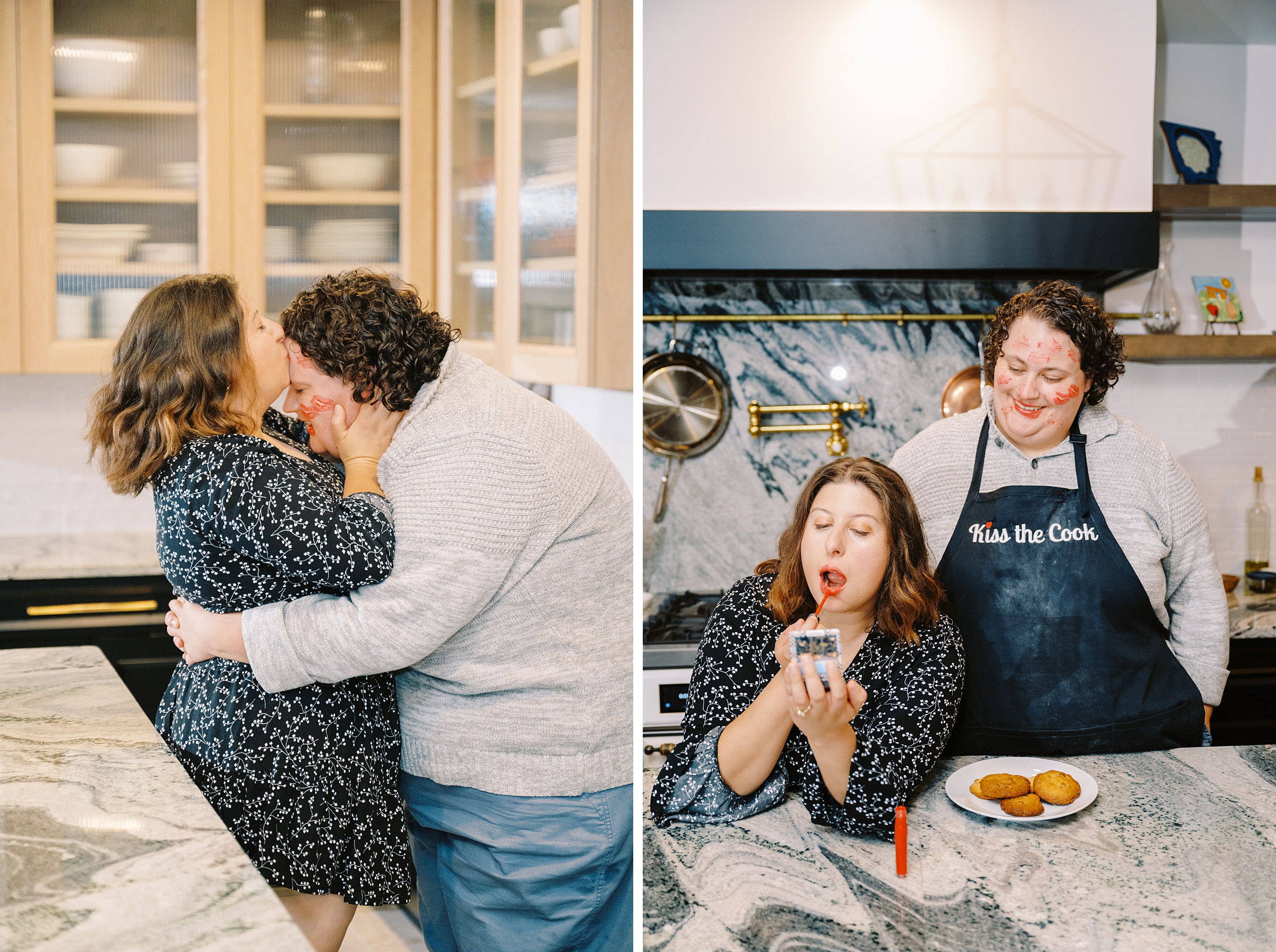K and J came prepared with the sweetest ideas. We started in the kitchen with a “kiss the cook” moment while they baked cookies together. J wore red lipstick and kept sneaking little kisses onto K’s cheeks, and honestly, I could’ve photographed that scene all afternoon. Then we headed across the street to the bay after they changed into simple white tees and jeans, snuggled up with their pup, and leaned into the breezy shoreline vibes.