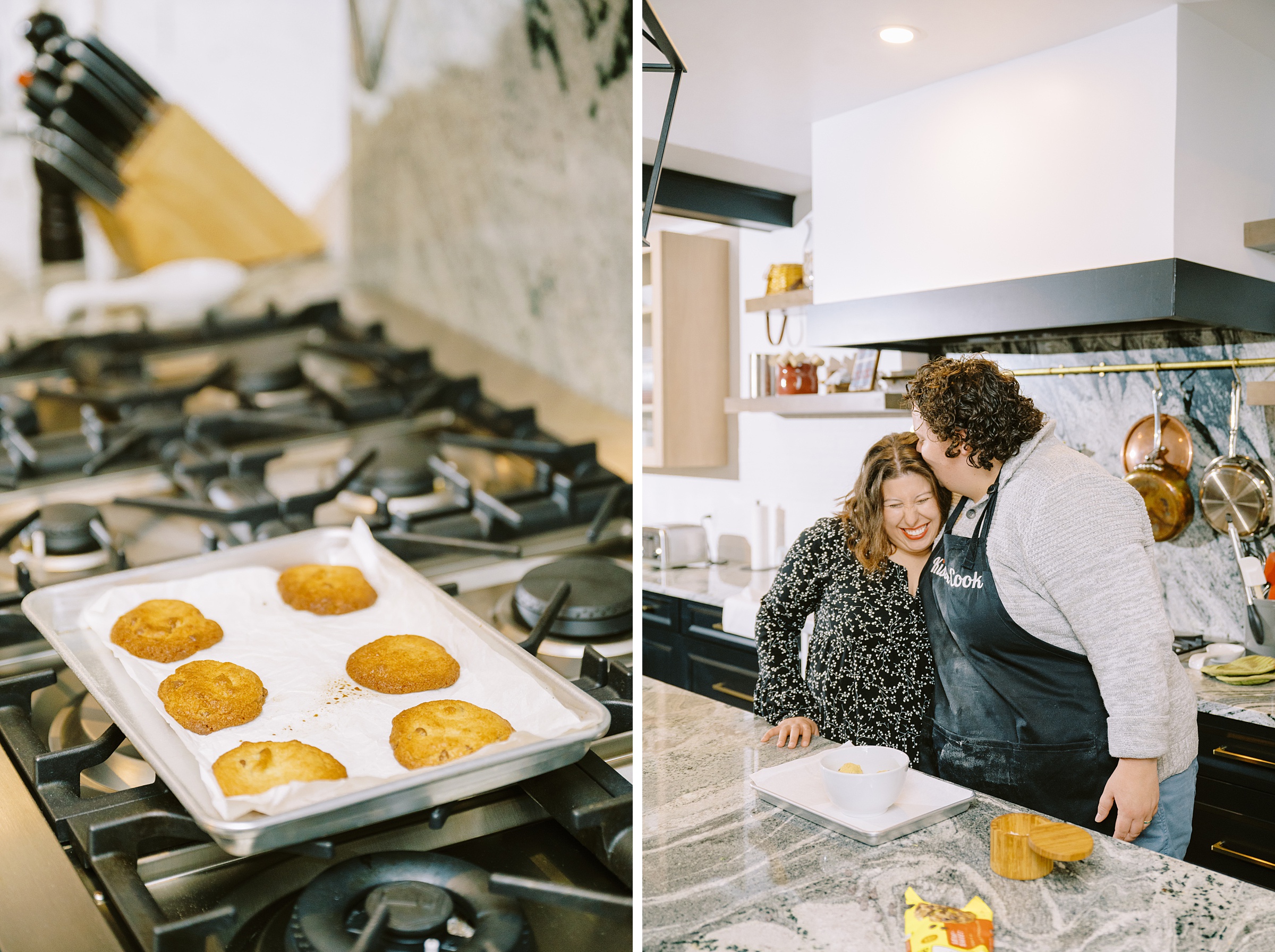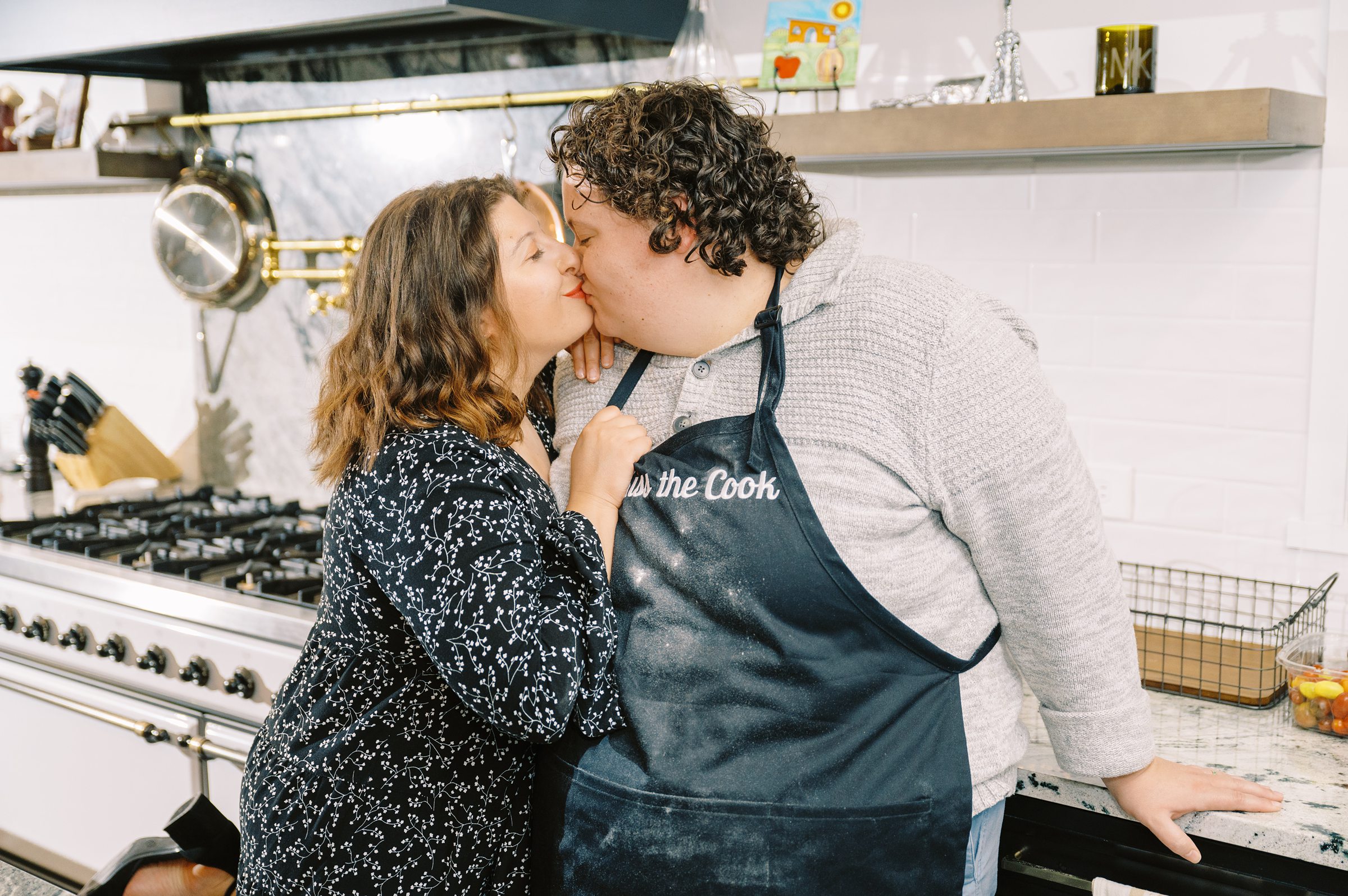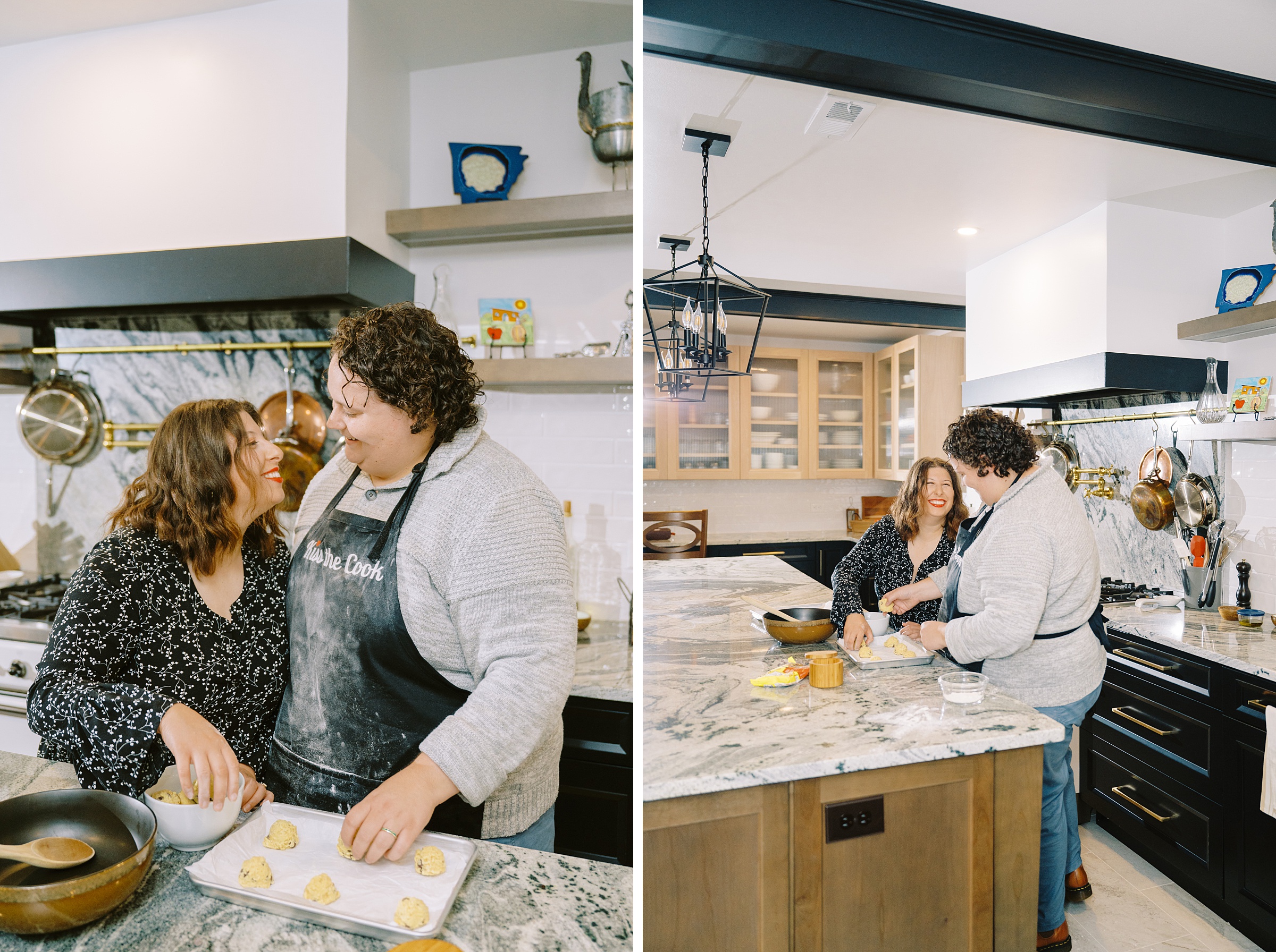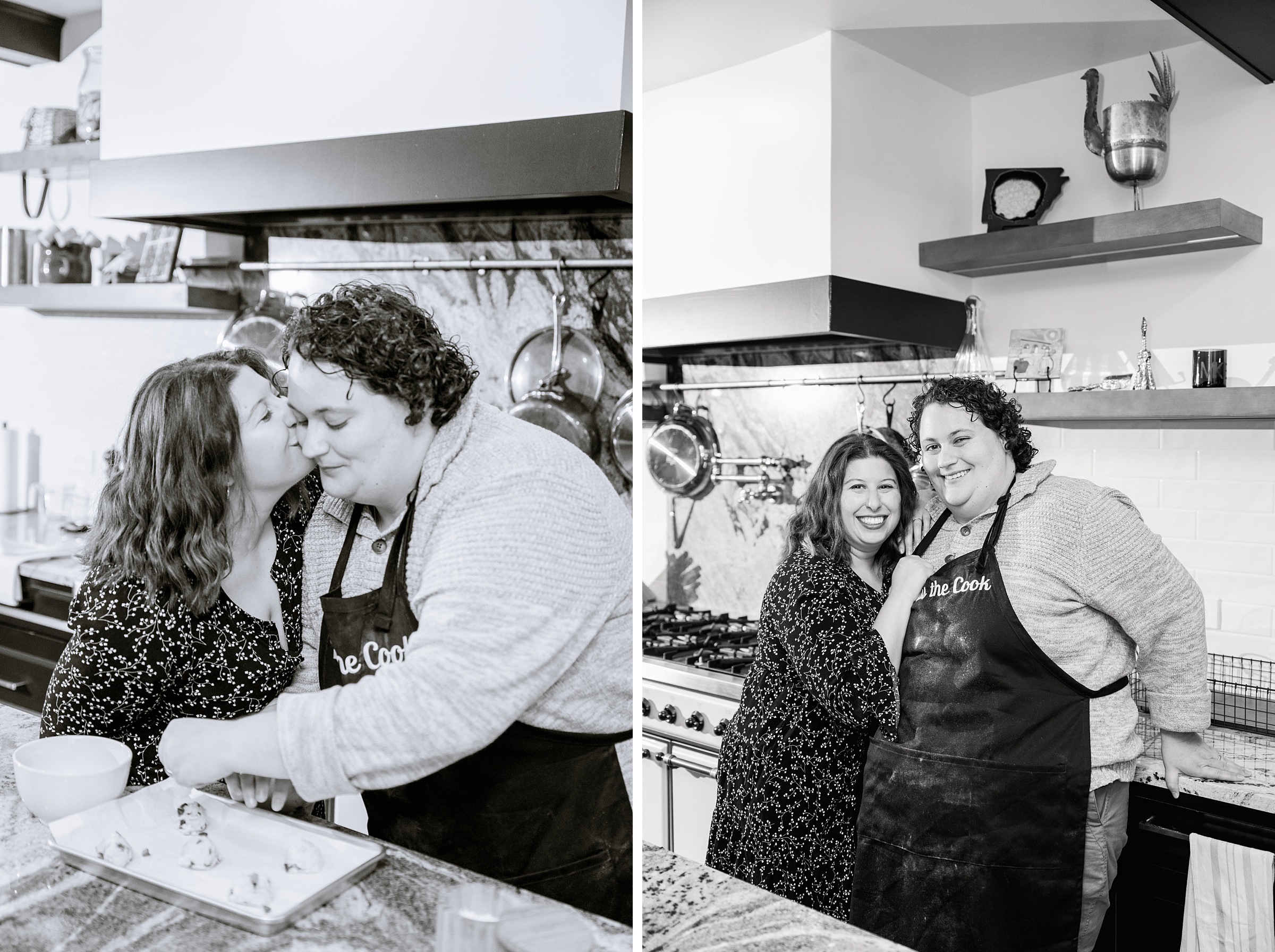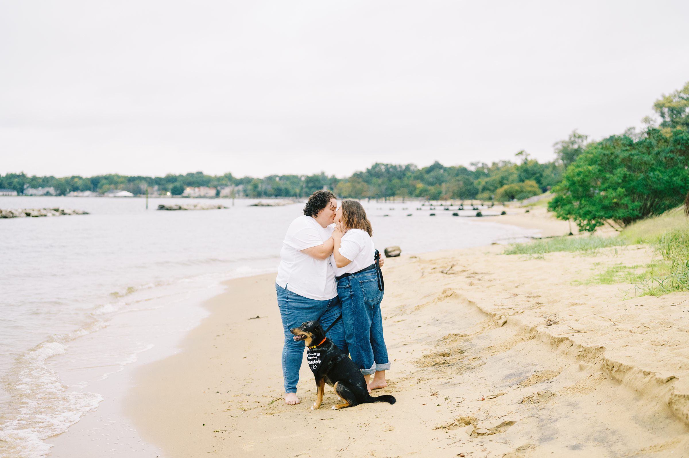 K and J came prepared with the sweetest ideas. We started in the kitchen with a “kiss the cook” moment while they baked cookies together. J wore red lipstick and kept sneaking little kisses onto K’s cheeks, and honestly, I could’ve photographed that scene all afternoon. Then we headed across the street to the bay after they changed into simple white tees and jeans, snuggled up with their pup, and leaned into the breezy shoreline vibes.