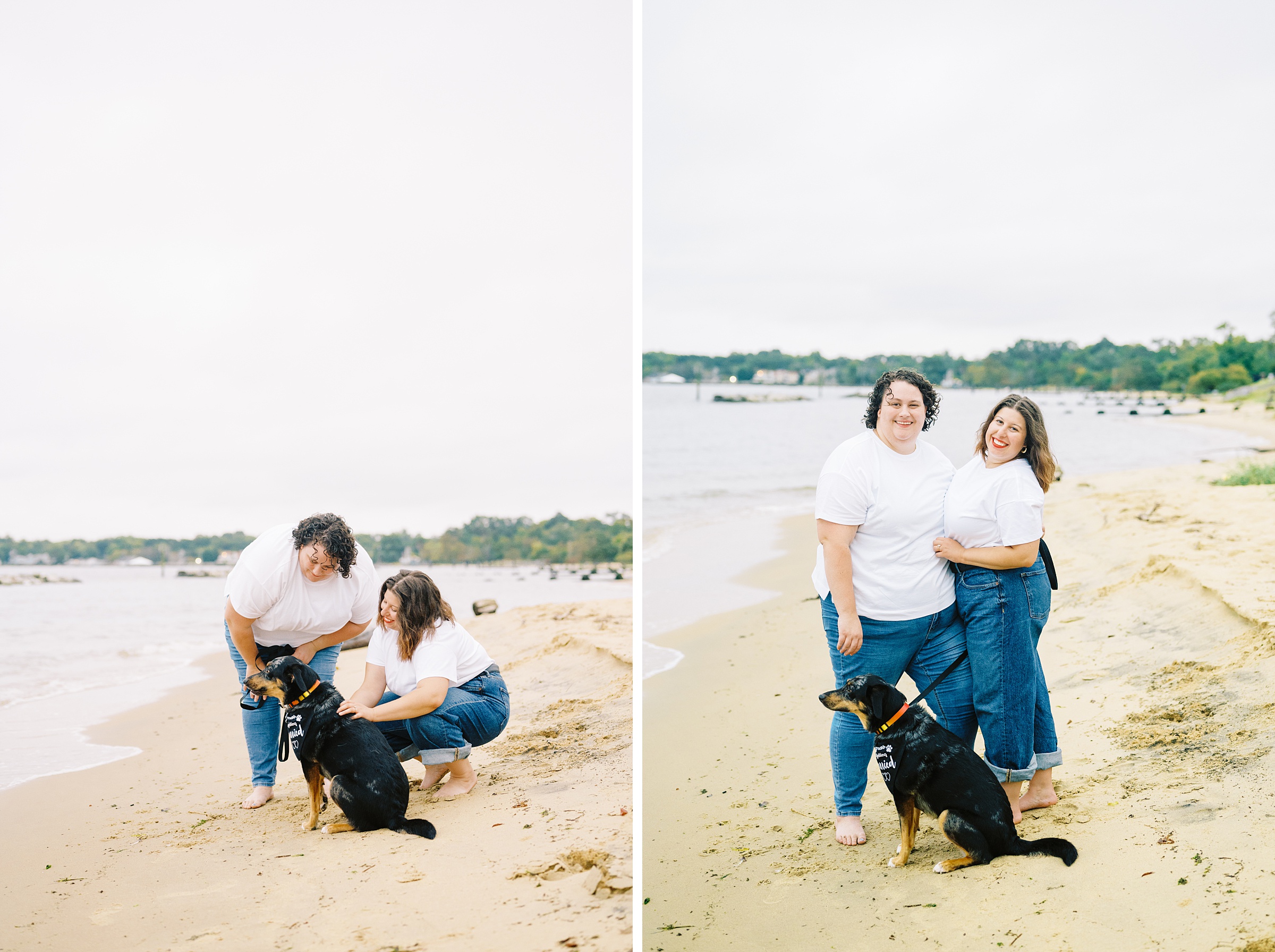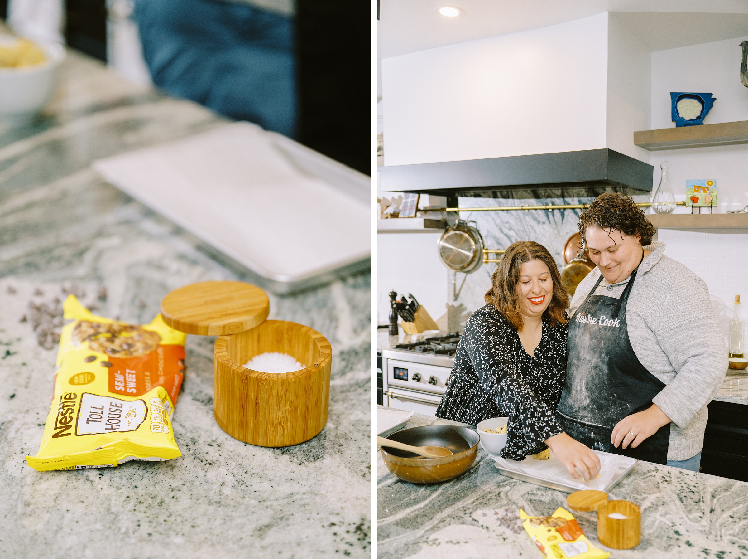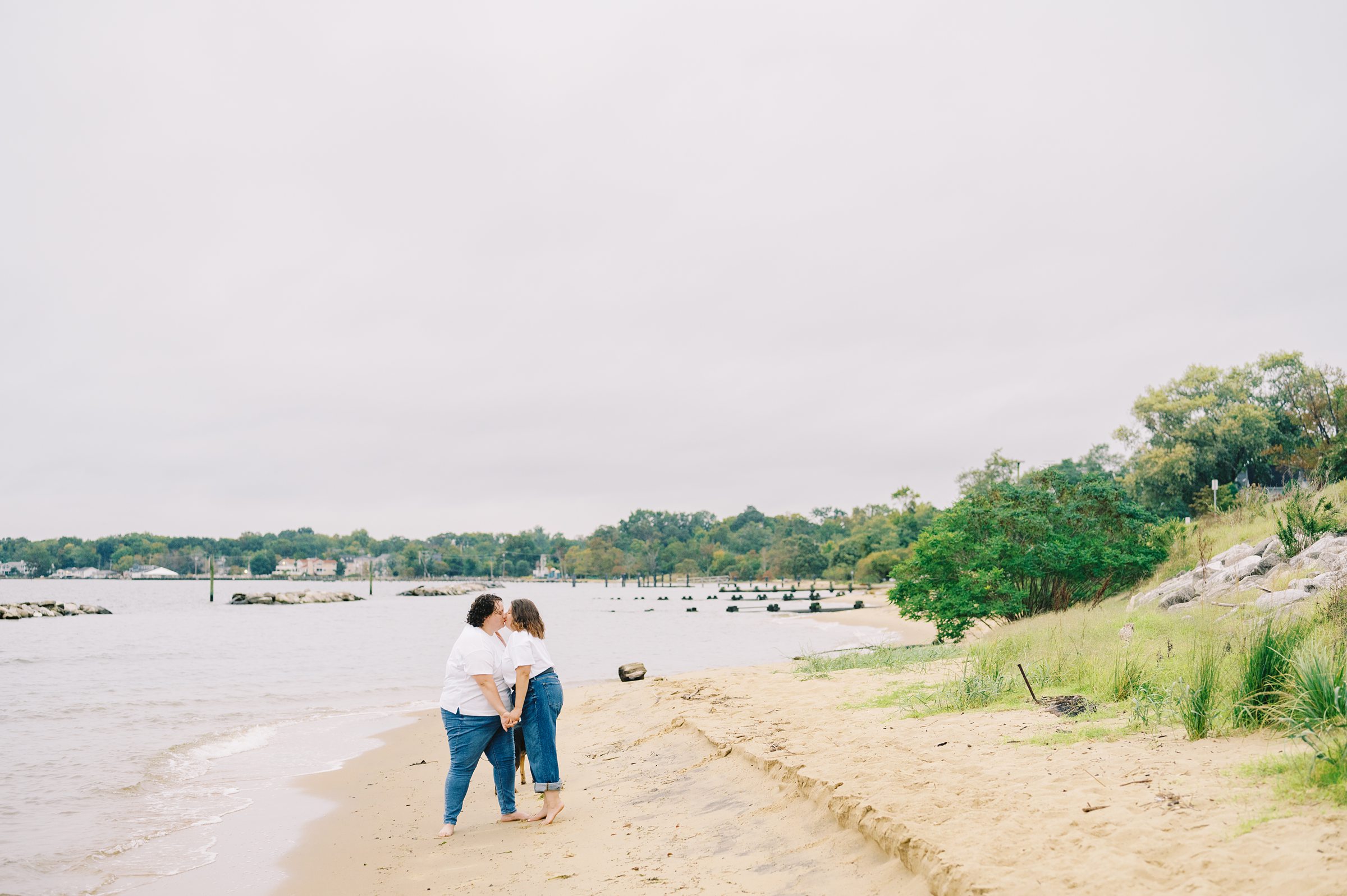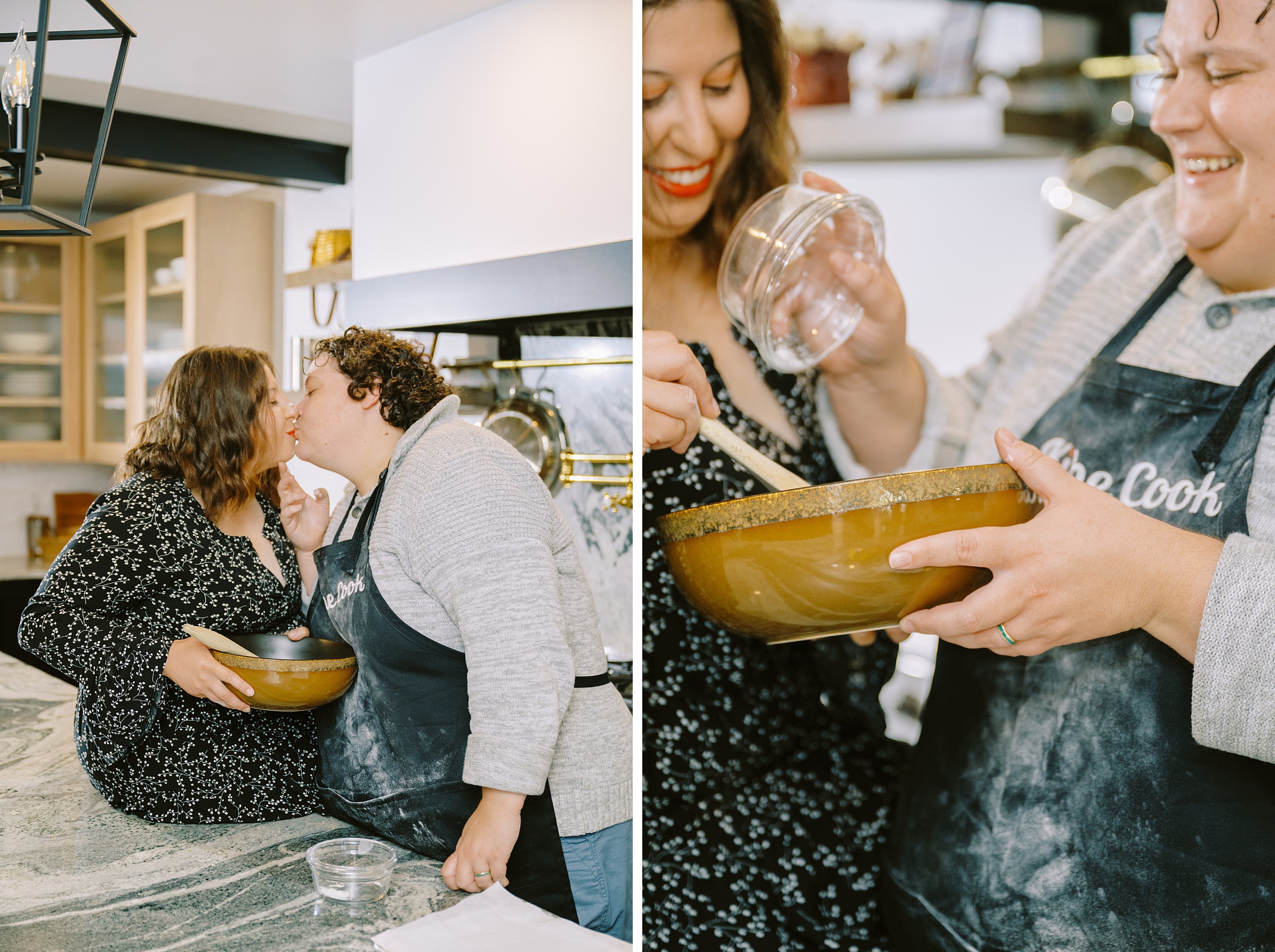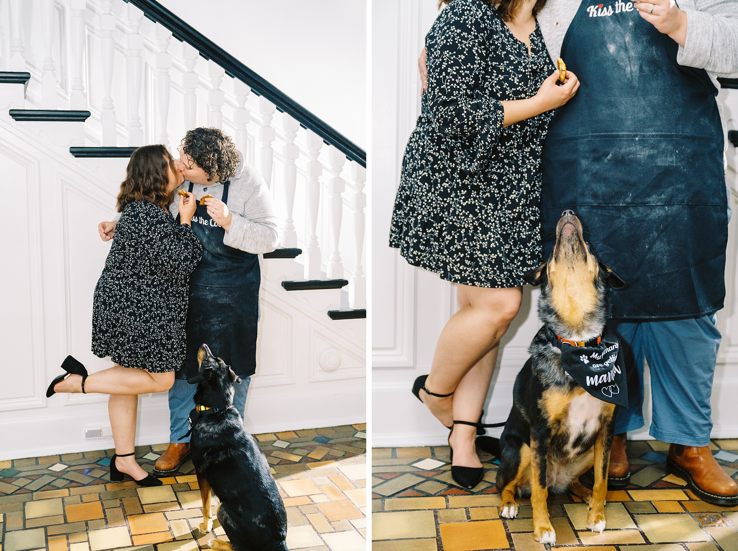 K and J came prepared with the sweetest ideas. We started in the kitchen with a “kiss the cook” moment while they baked cookies together. J wore red lipstick and kept sneaking little kisses onto K’s cheeks, and honestly, I could’ve photographed that scene all afternoon. Then we headed across the street to the bay after they changed into simple white tees and jeans, snuggled up with their pup, and leaned into the breezy shoreline vibes.