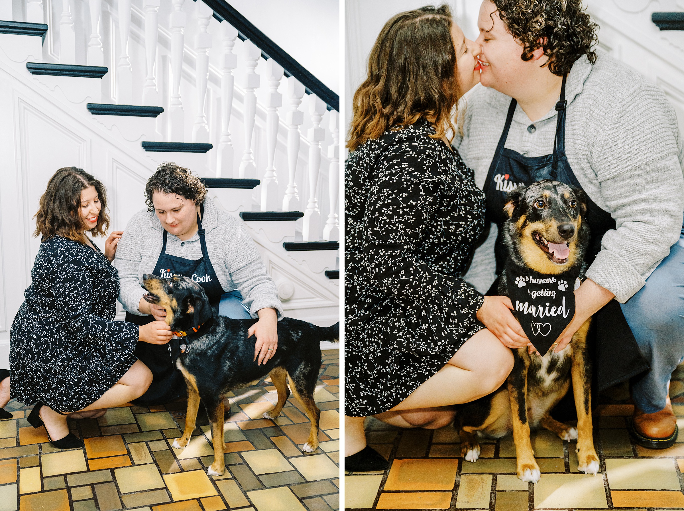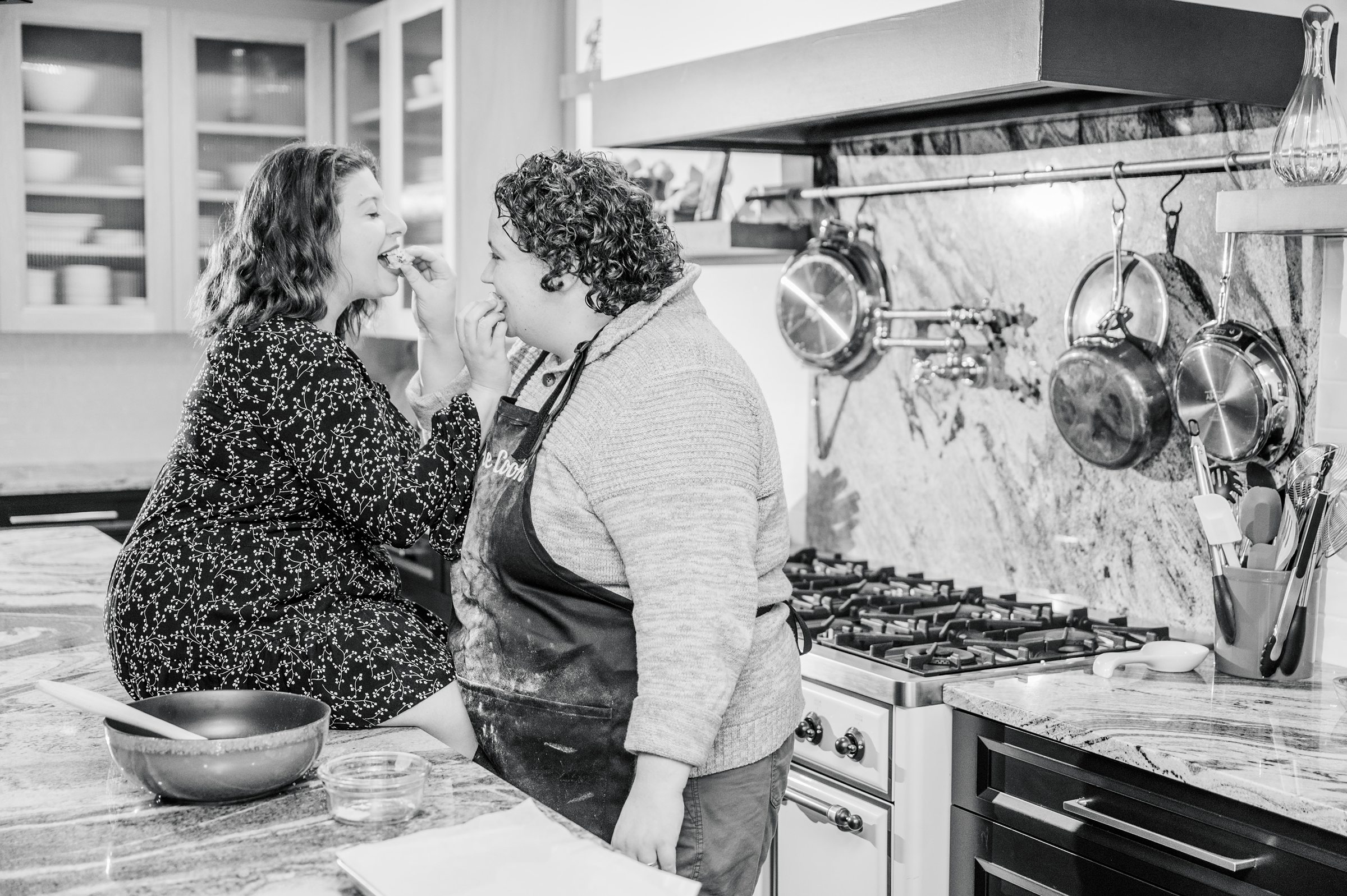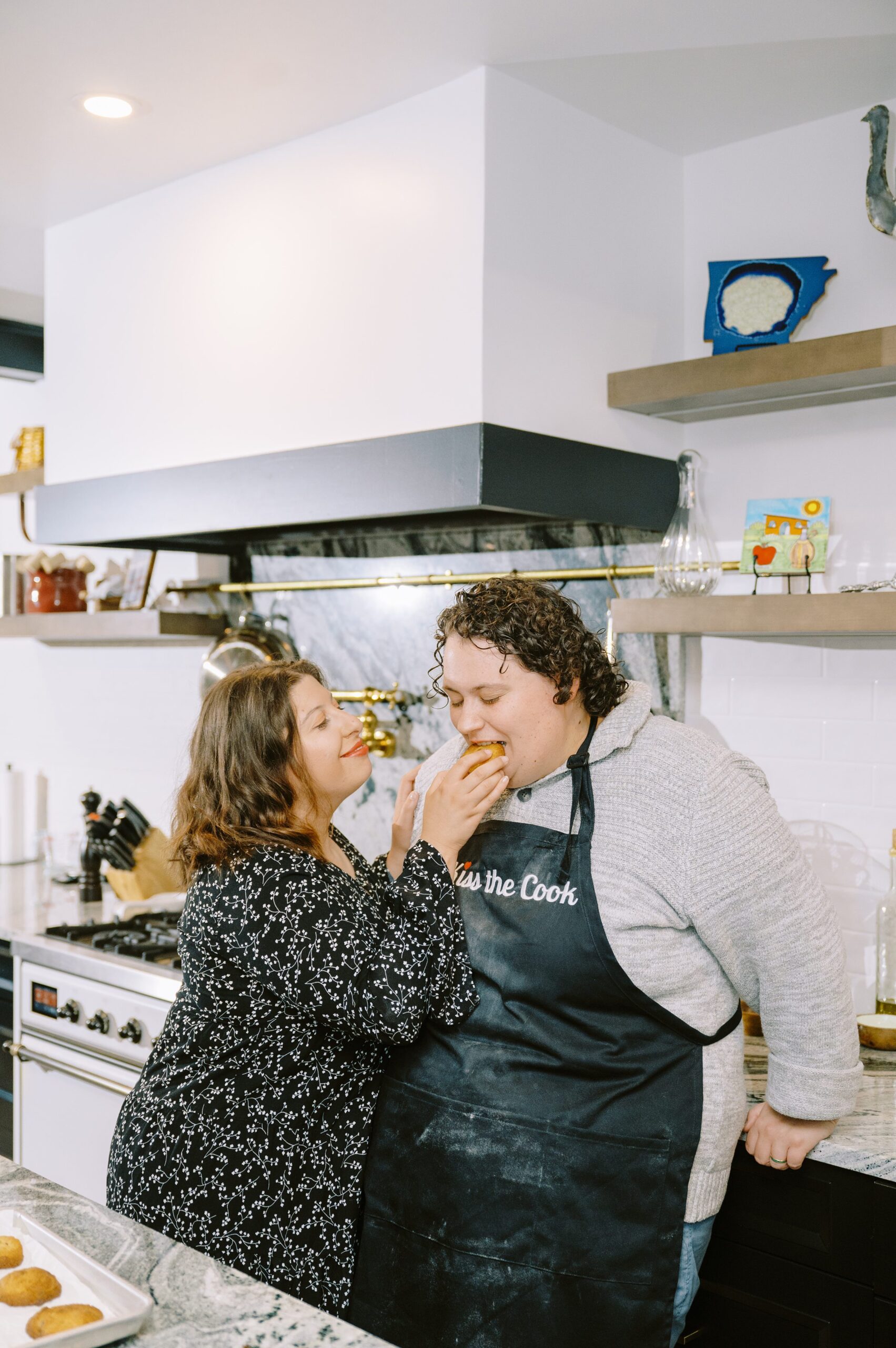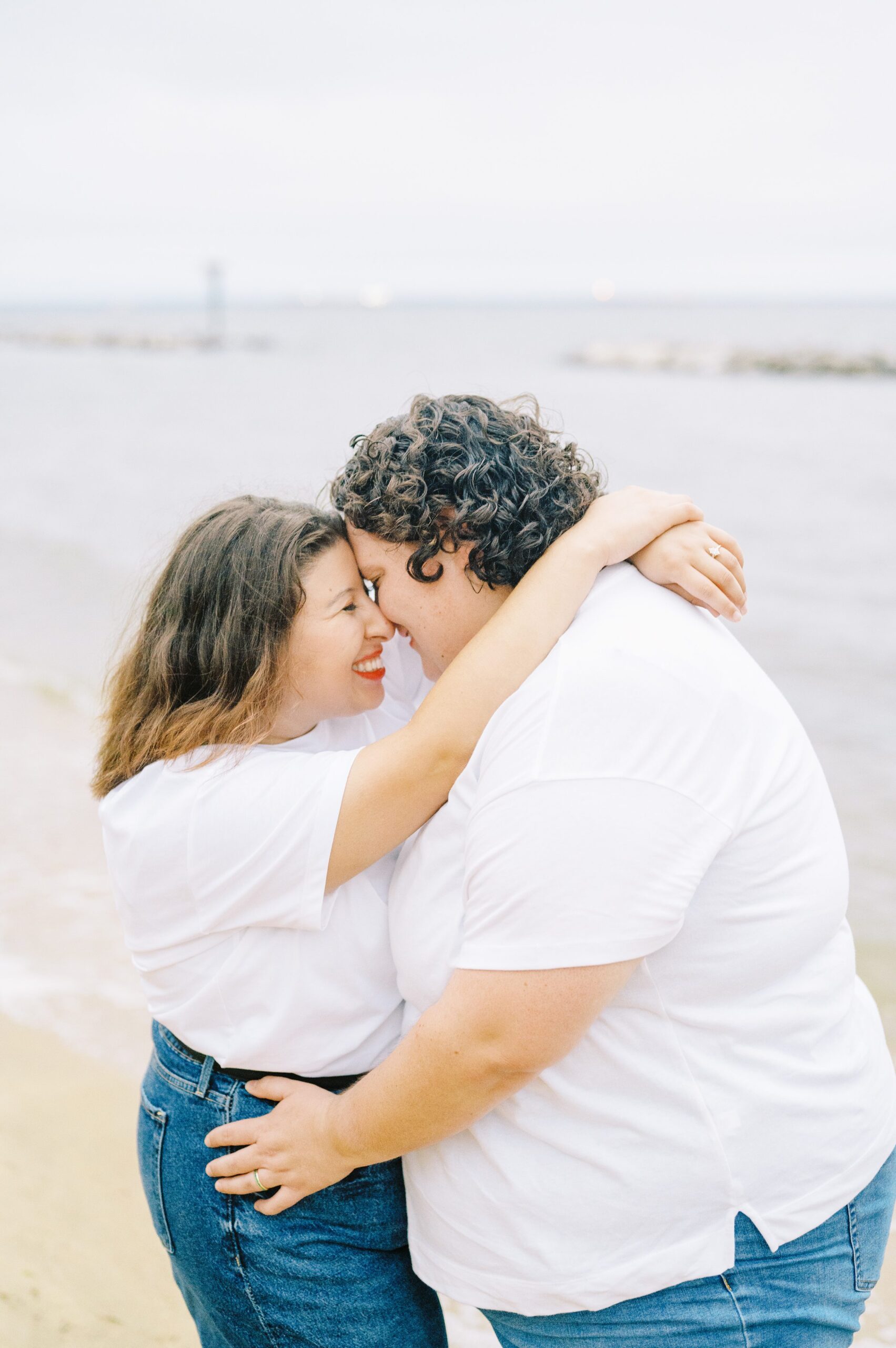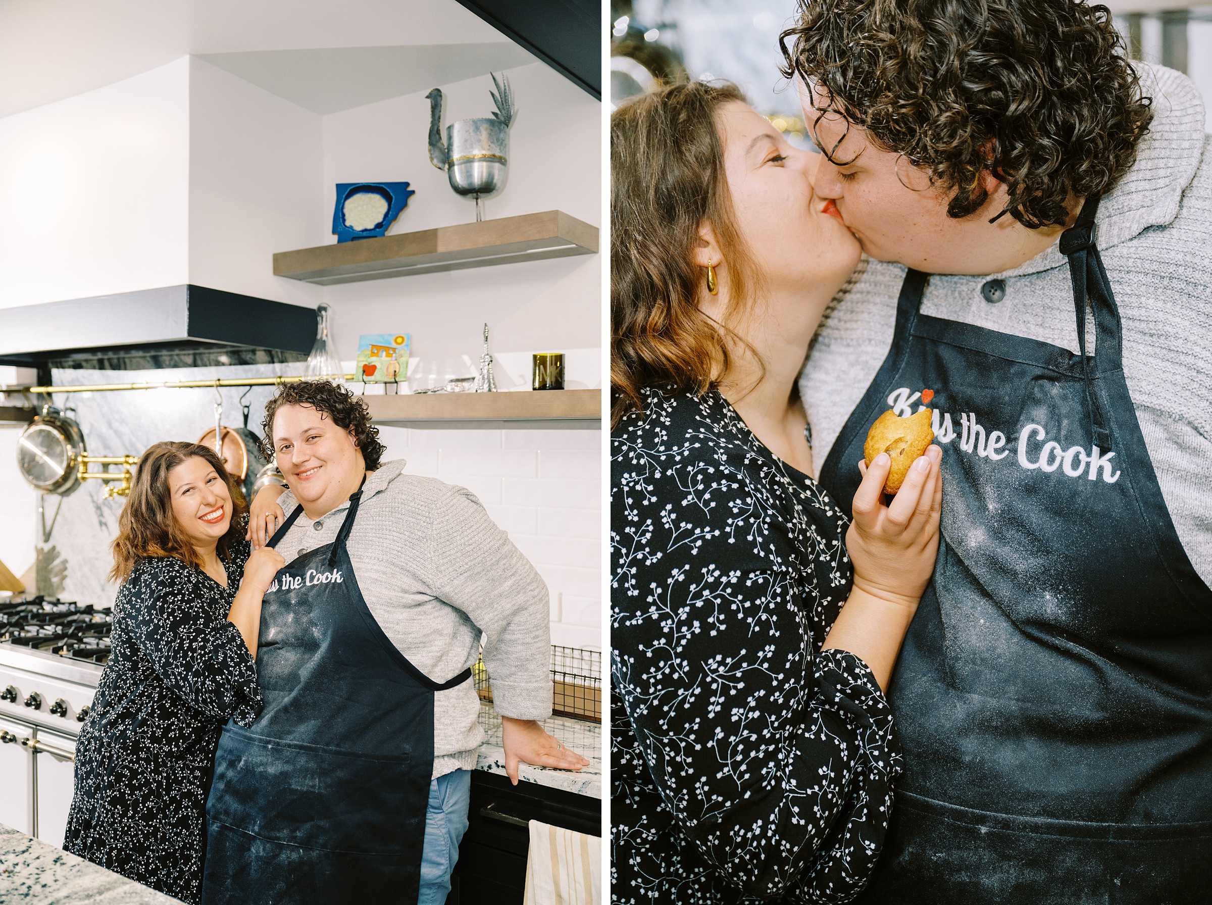 K and J came prepared with the sweetest ideas. We started in the kitchen with a “kiss the cook” moment while they baked cookies together. J wore red lipstick and kept sneaking little kisses onto K’s cheeks, and honestly, I could’ve photographed that scene all afternoon. Then we headed across the street to the bay after they changed into simple white tees and jeans, snuggled up with their pup, and leaned into the breezy shoreline vibes.