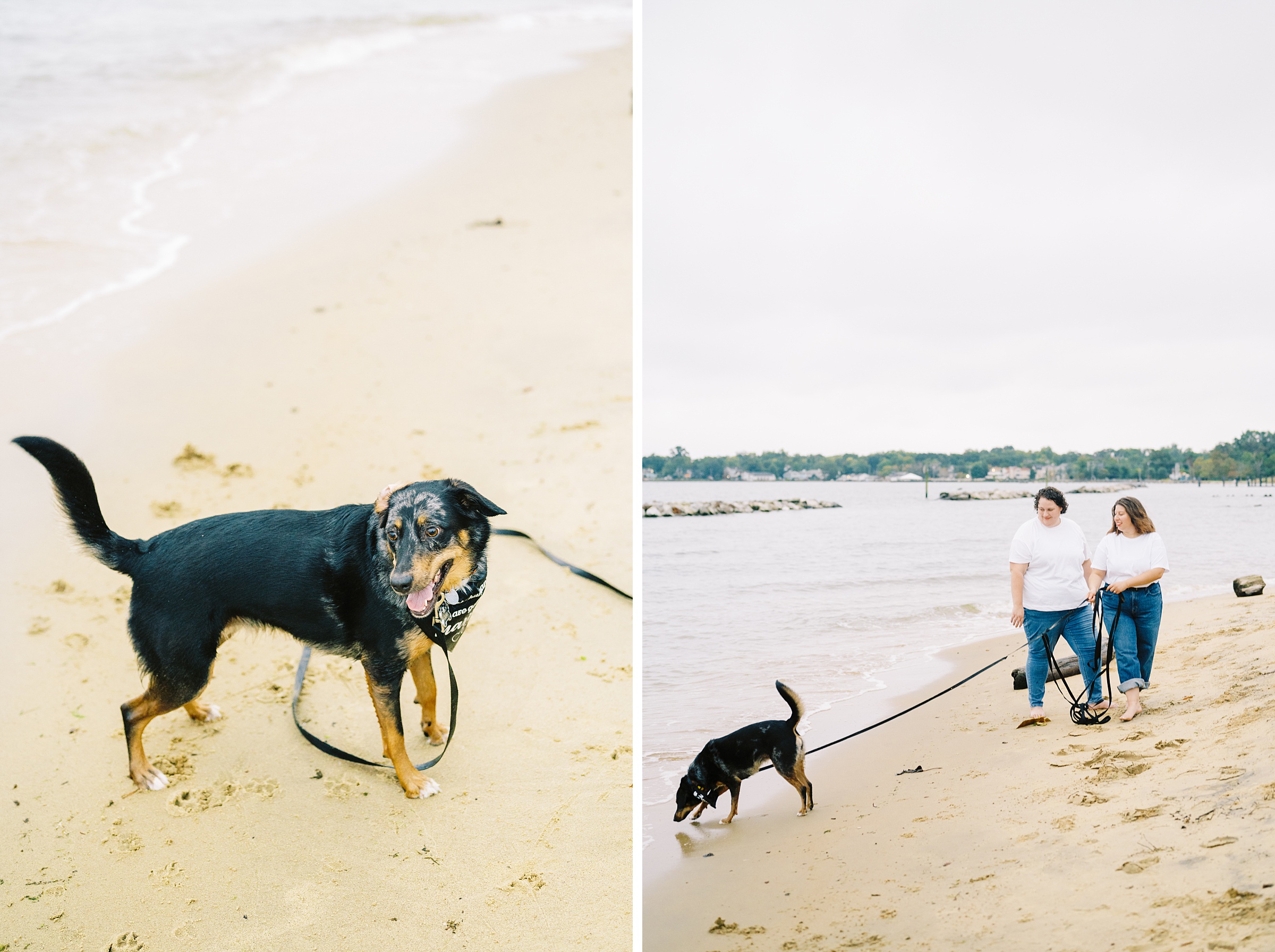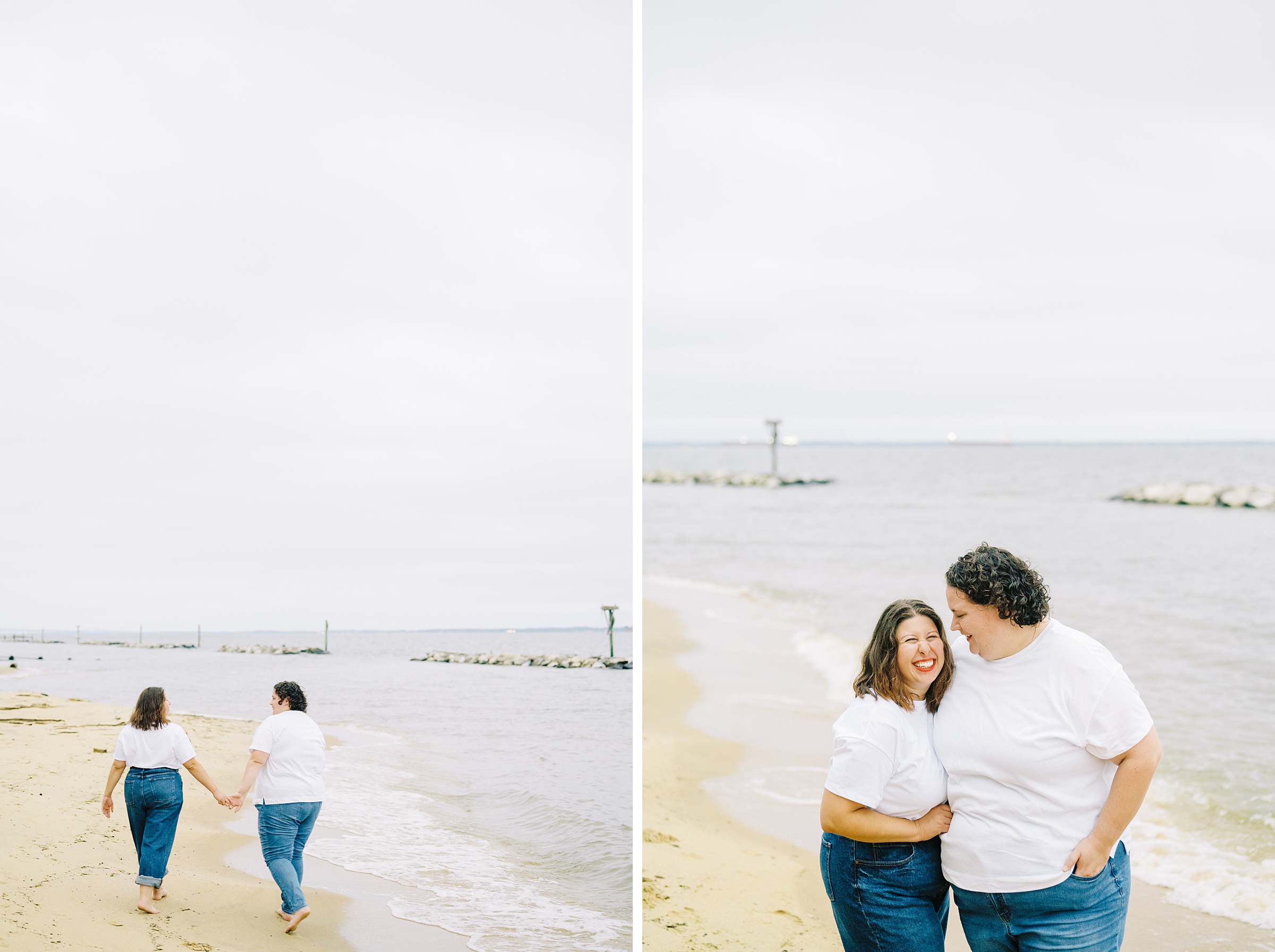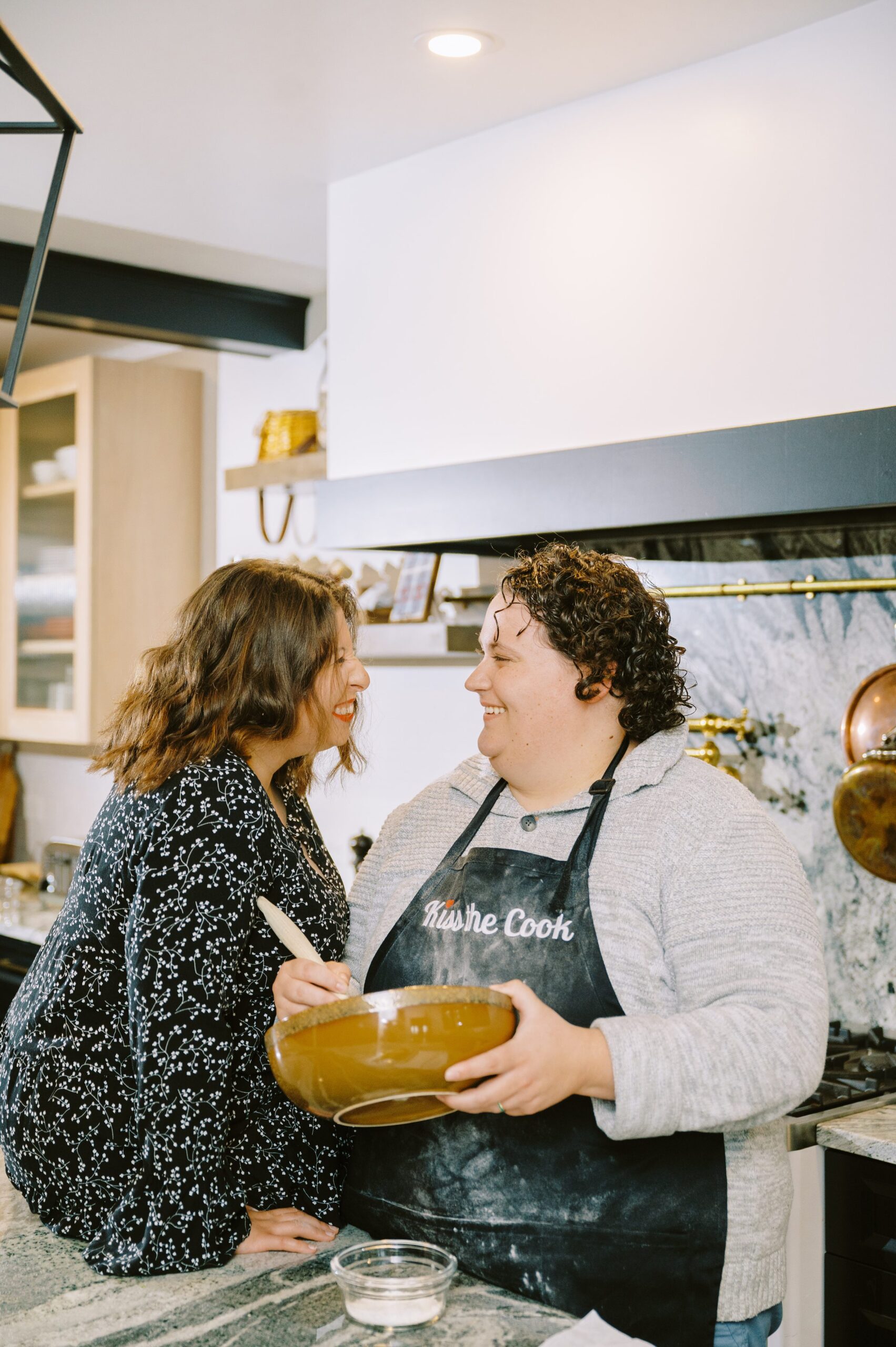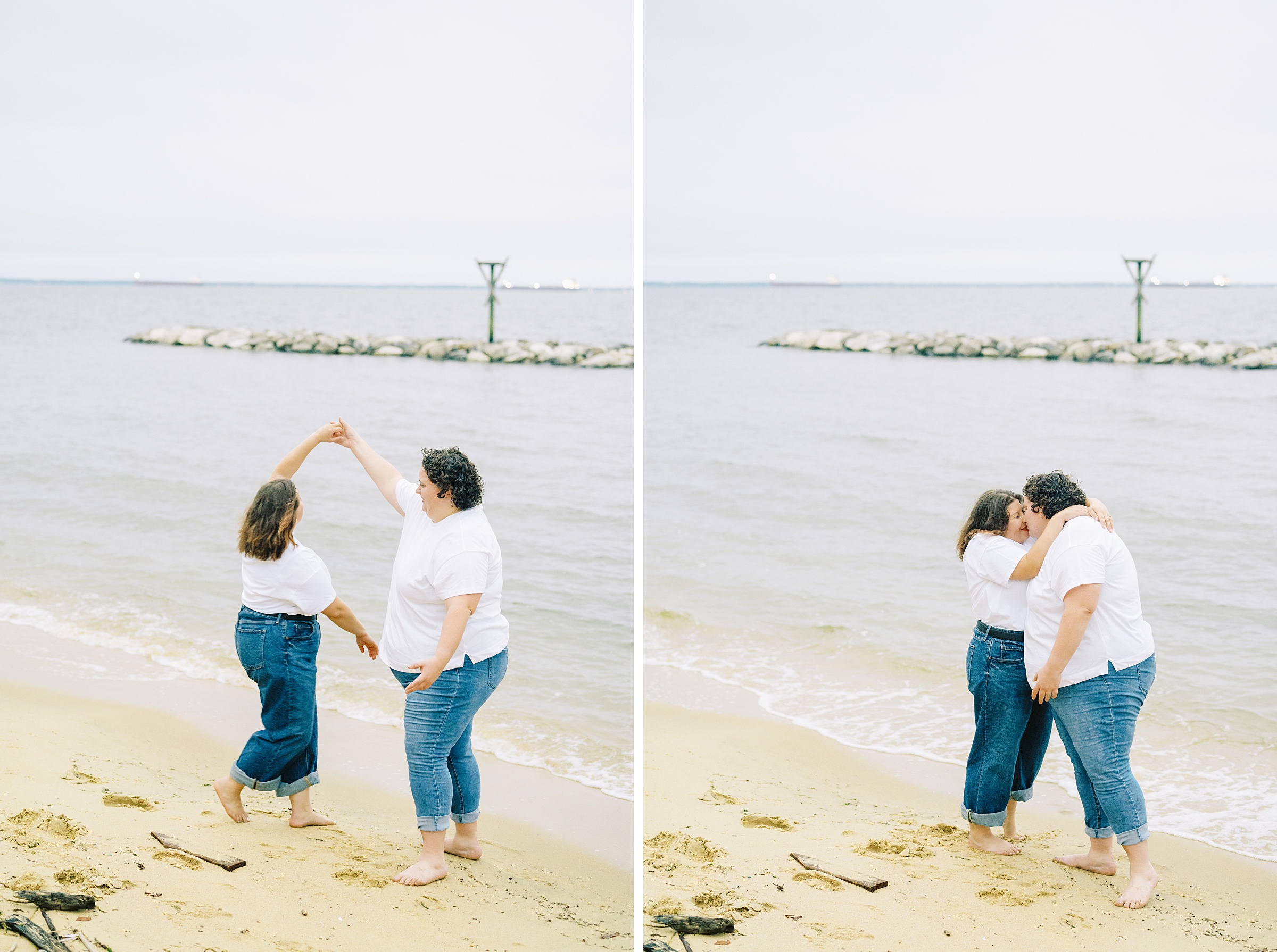 K and J came prepared with the sweetest ideas. We started in the kitchen with a “kiss the cook” moment while they baked cookies together. J wore red lipstick and kept sneaking little kisses onto K’s cheeks, and honestly, I could’ve photographed that scene all afternoon. Then we headed across the street to the bay after they changed into simple white tees and jeans, snuggled up with their pup, and leaned into the breezy shoreline vibes.