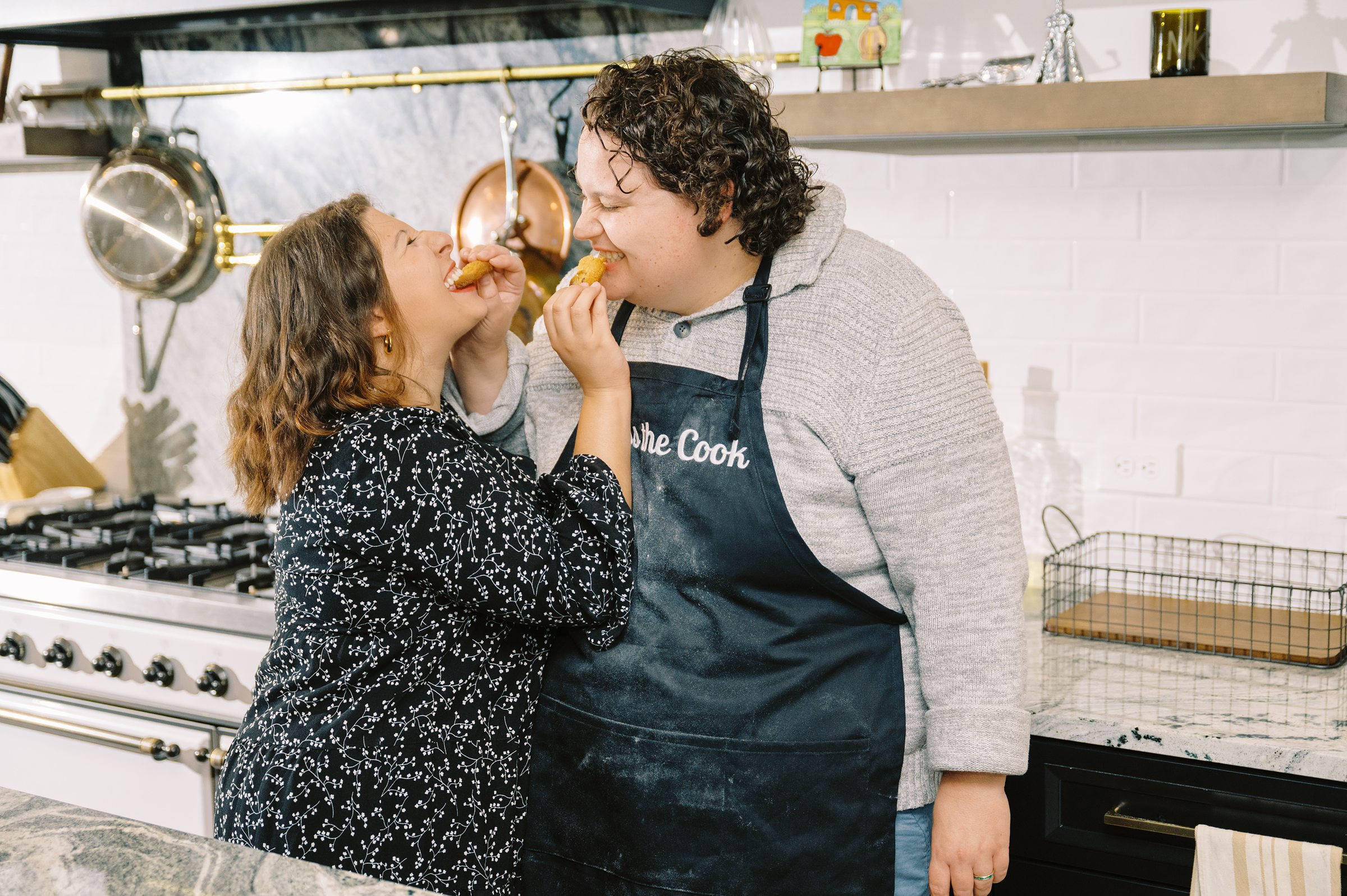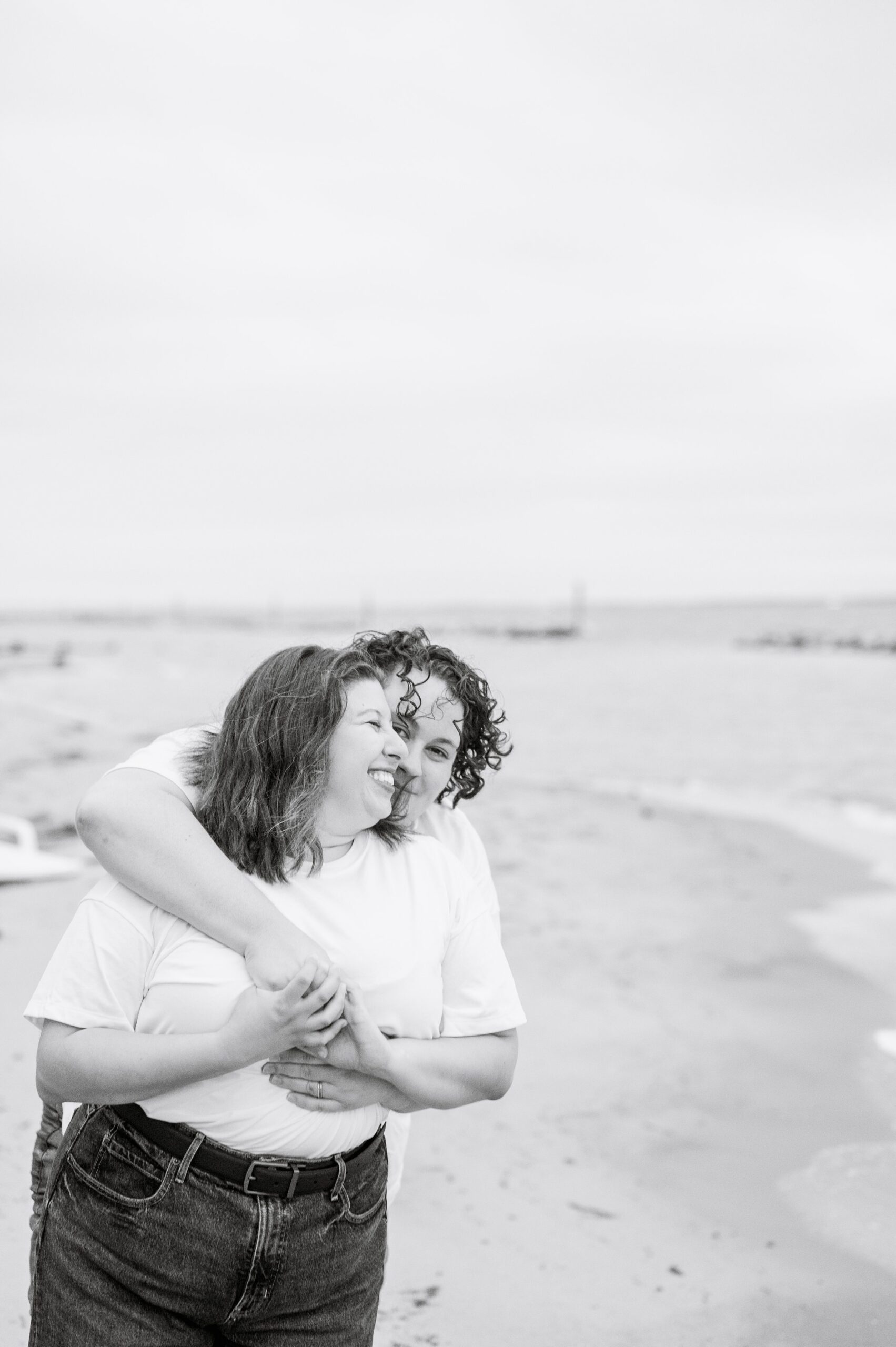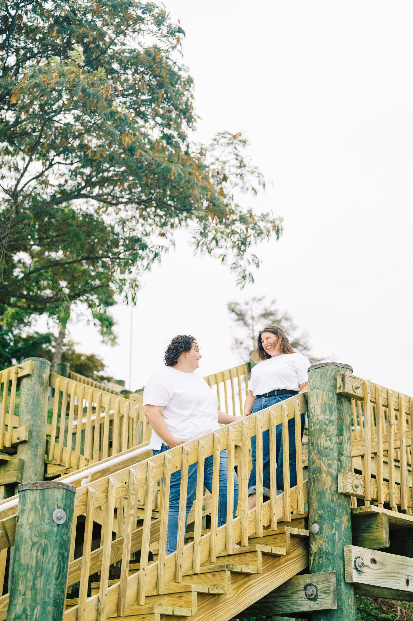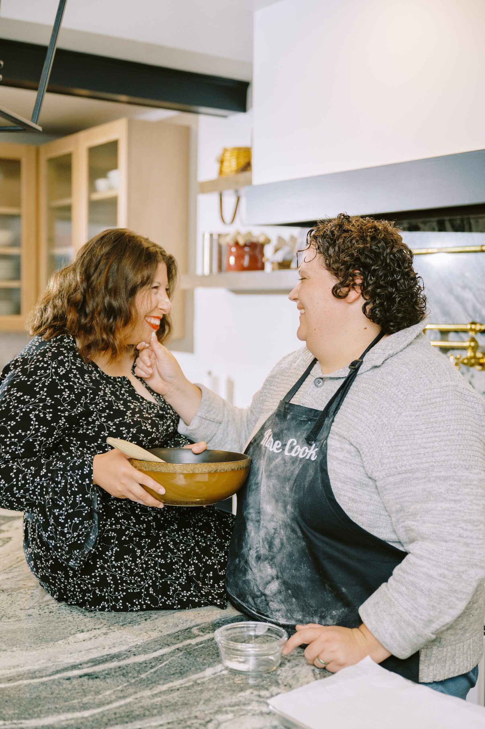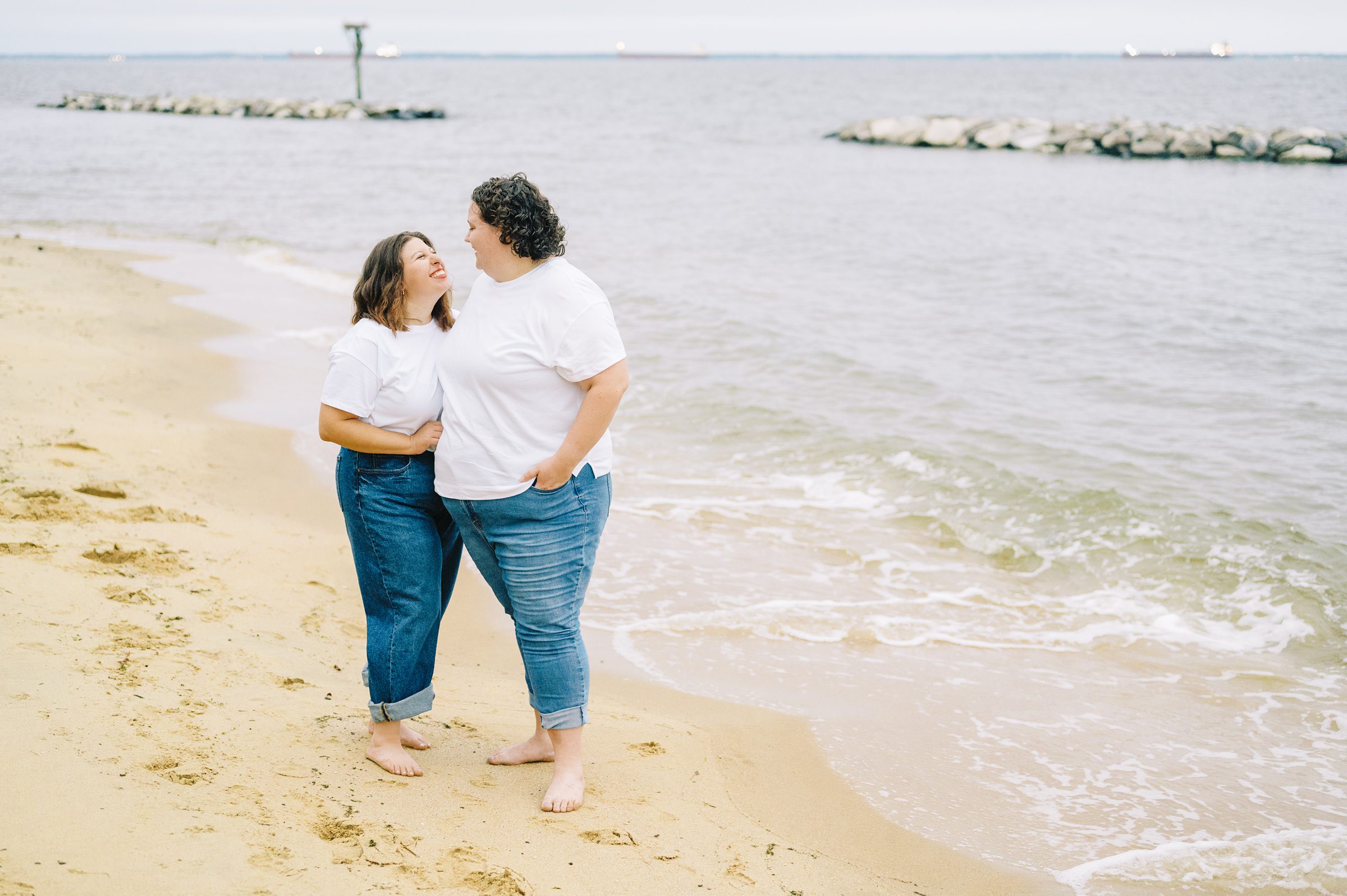 K and J came prepared with the sweetest ideas. We started in the kitchen with a “kiss the cook” moment while they baked cookies together. J wore red lipstick and kept sneaking little kisses onto K’s cheeks, and honestly, I could’ve photographed that scene all afternoon. Then we headed across the street to the bay after they changed into simple white tees and jeans, snuggled up with their pup, and leaned into the breezy shoreline vibes.