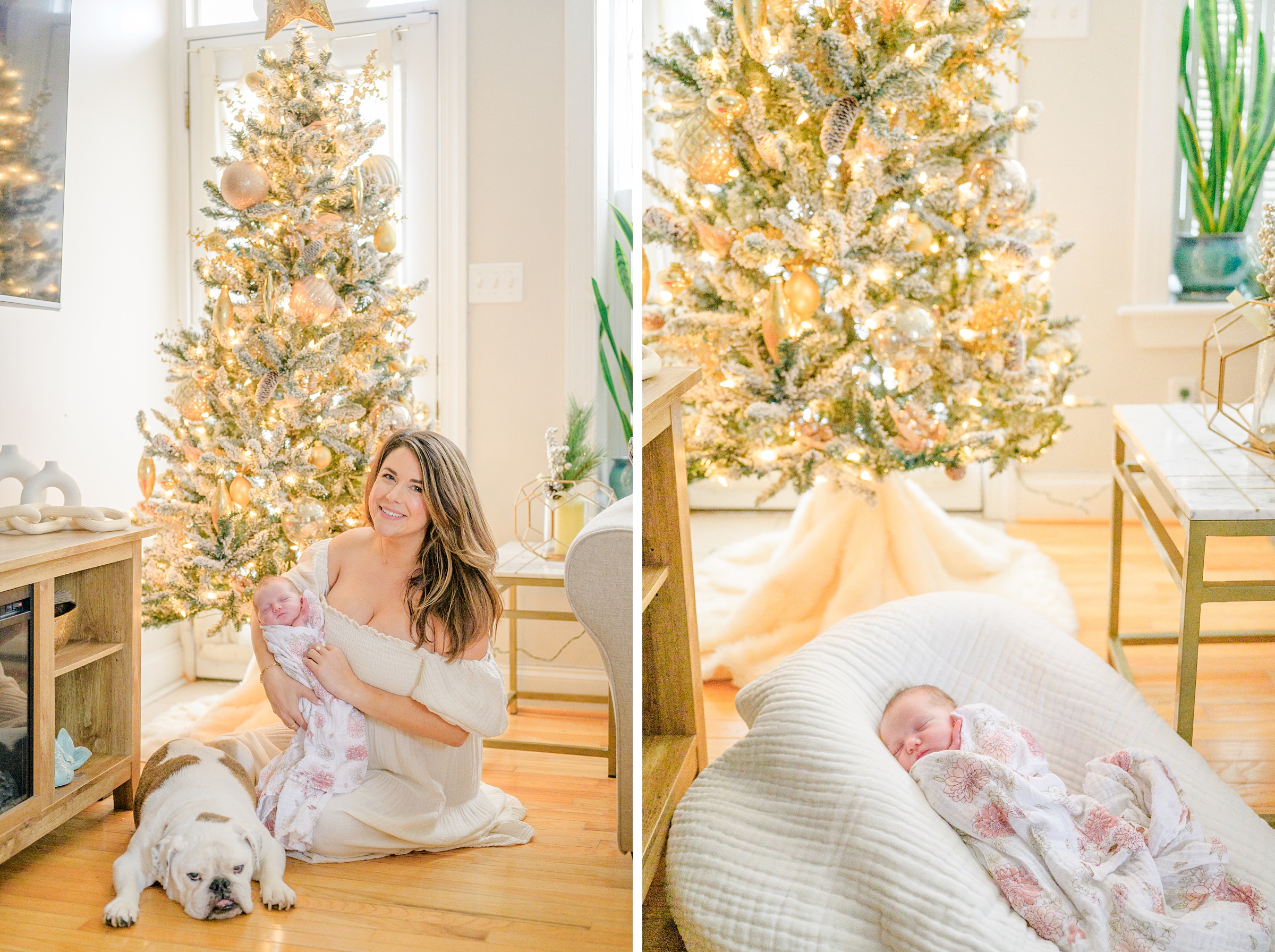 I spent the holidays in Baltimore with my own family, so the timing worked out perfectly to meet up with Lindsey, her pup Molly, and baby L at their home just a few days after Christmas. Our morning together was filled with the sweetest moments—baby L was the perfect little angel, all snuggly and sleepy, snoozing her way through her newborn session like a pro.
