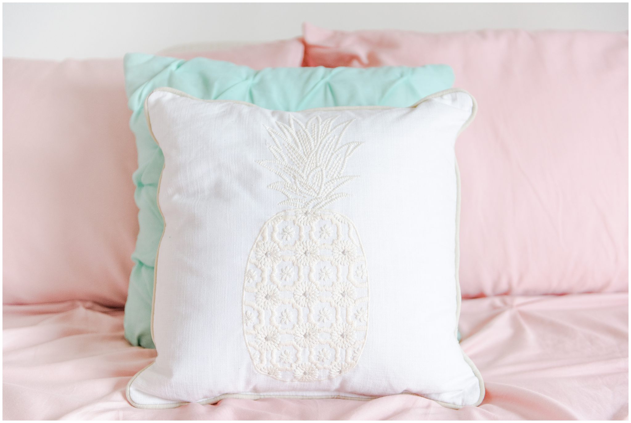Funny story about that blue pillow… I bought it years ago and almost threw it away when I ordered my new bedding! Something told me to keep it though, and I’m so glad I did! I love the little pop of blue amongst all of the pink! My next project will be updating some of these pillows! I’m picturing a few more big, comfy pillows in tones of white, cream, teal & pink!