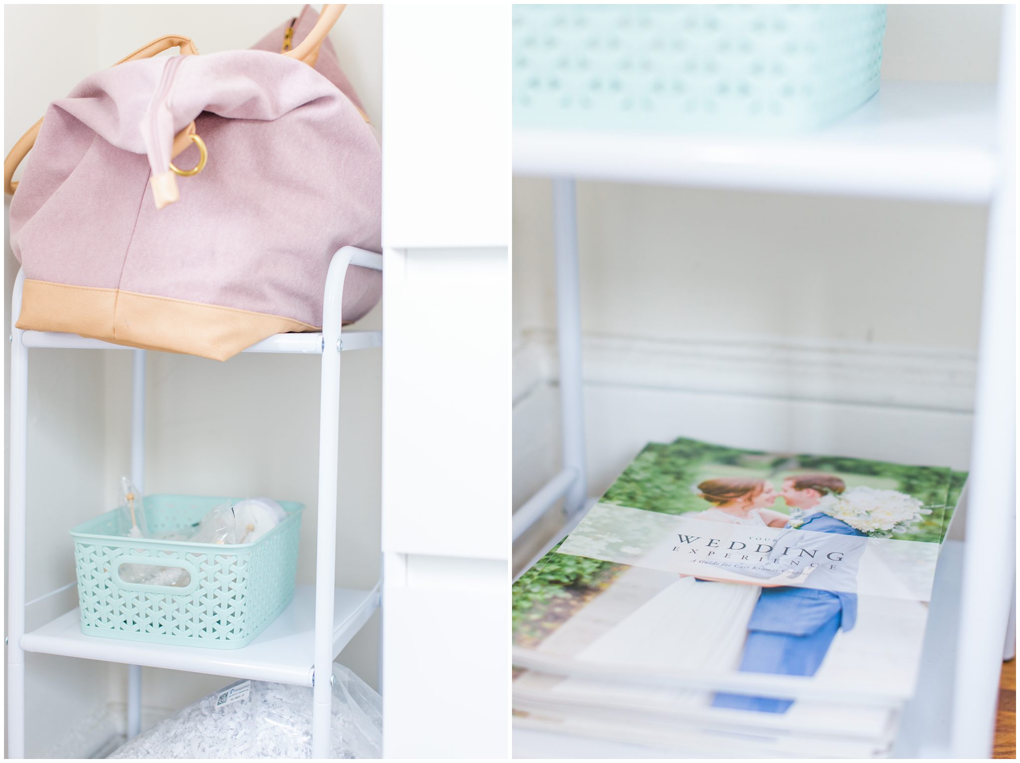 I love this new corner of mine! I got these little shelves to hold my bridal guides and other wedding gifting goodies! That giant bag on the top shelf goes with me to every wedding!