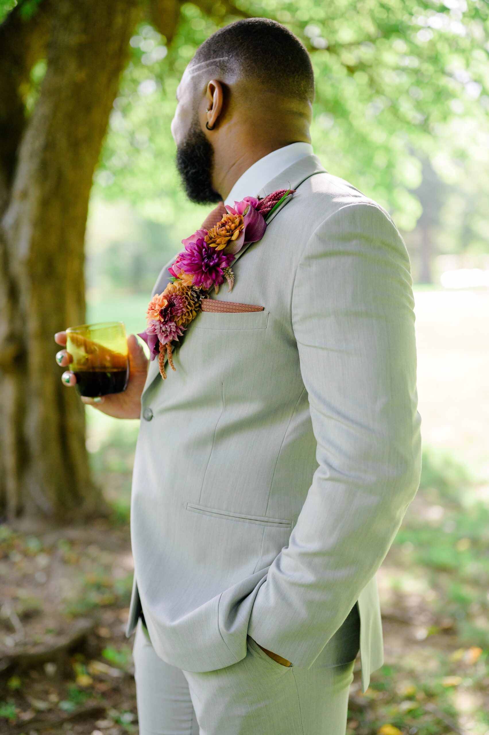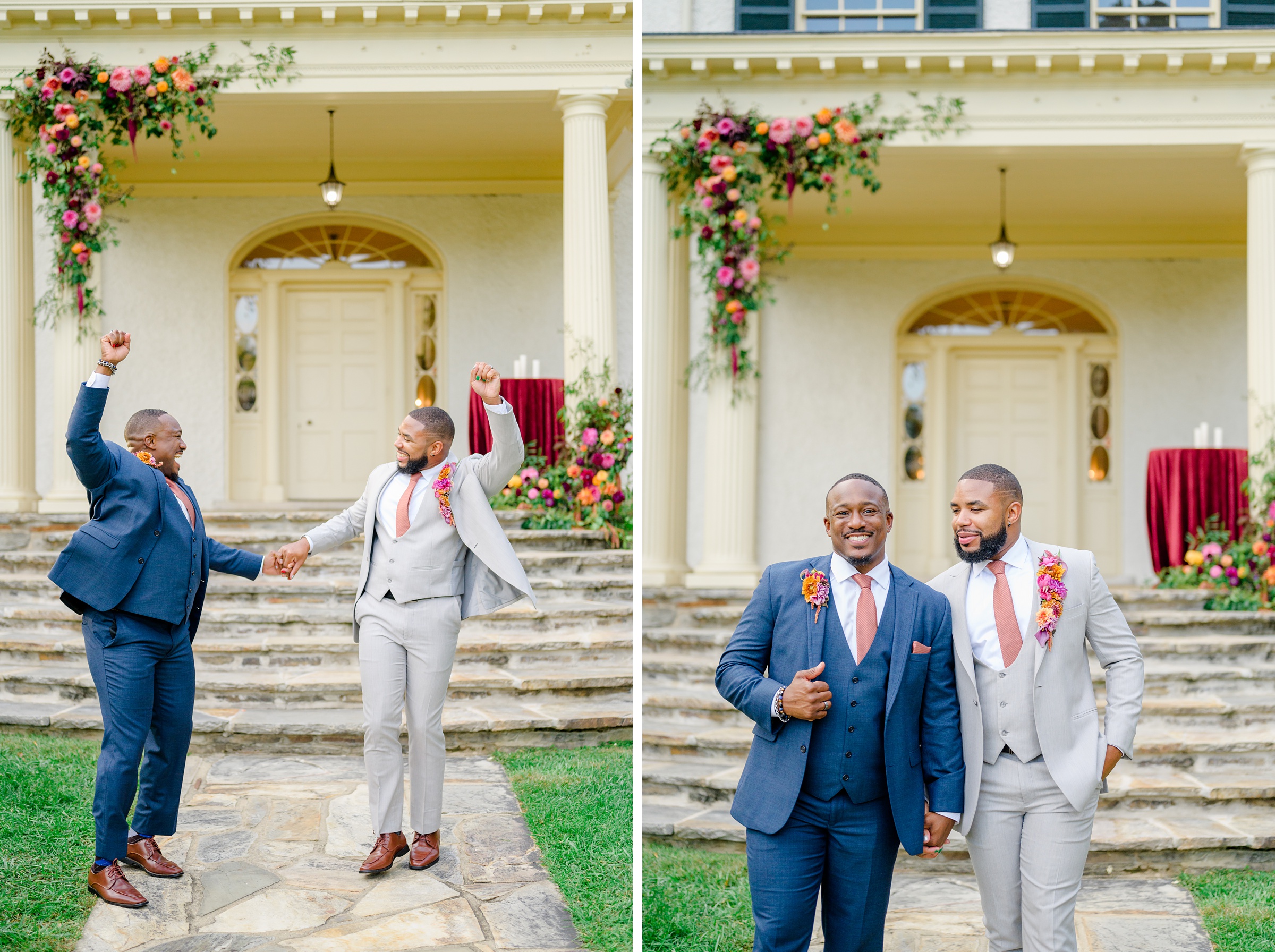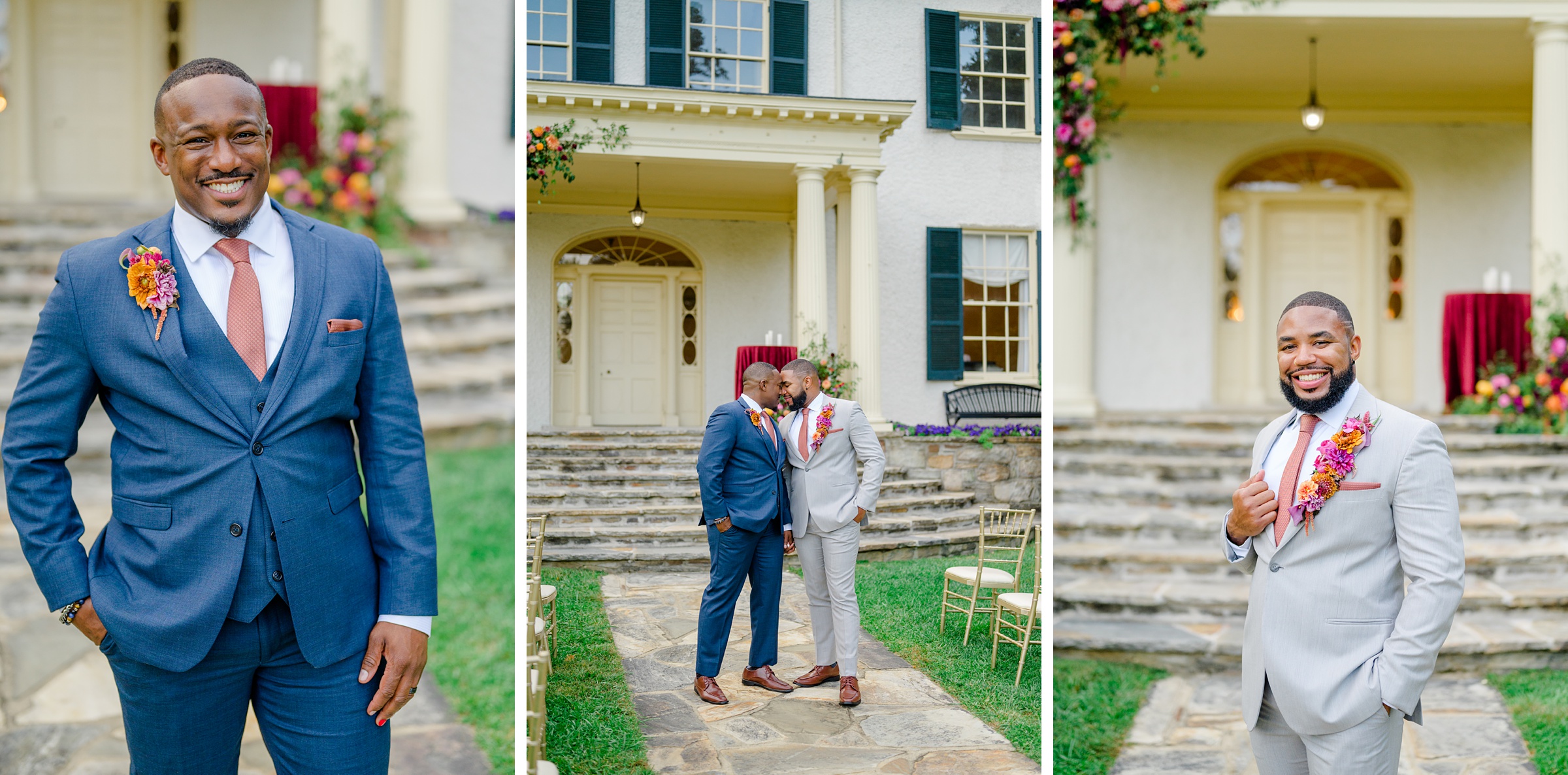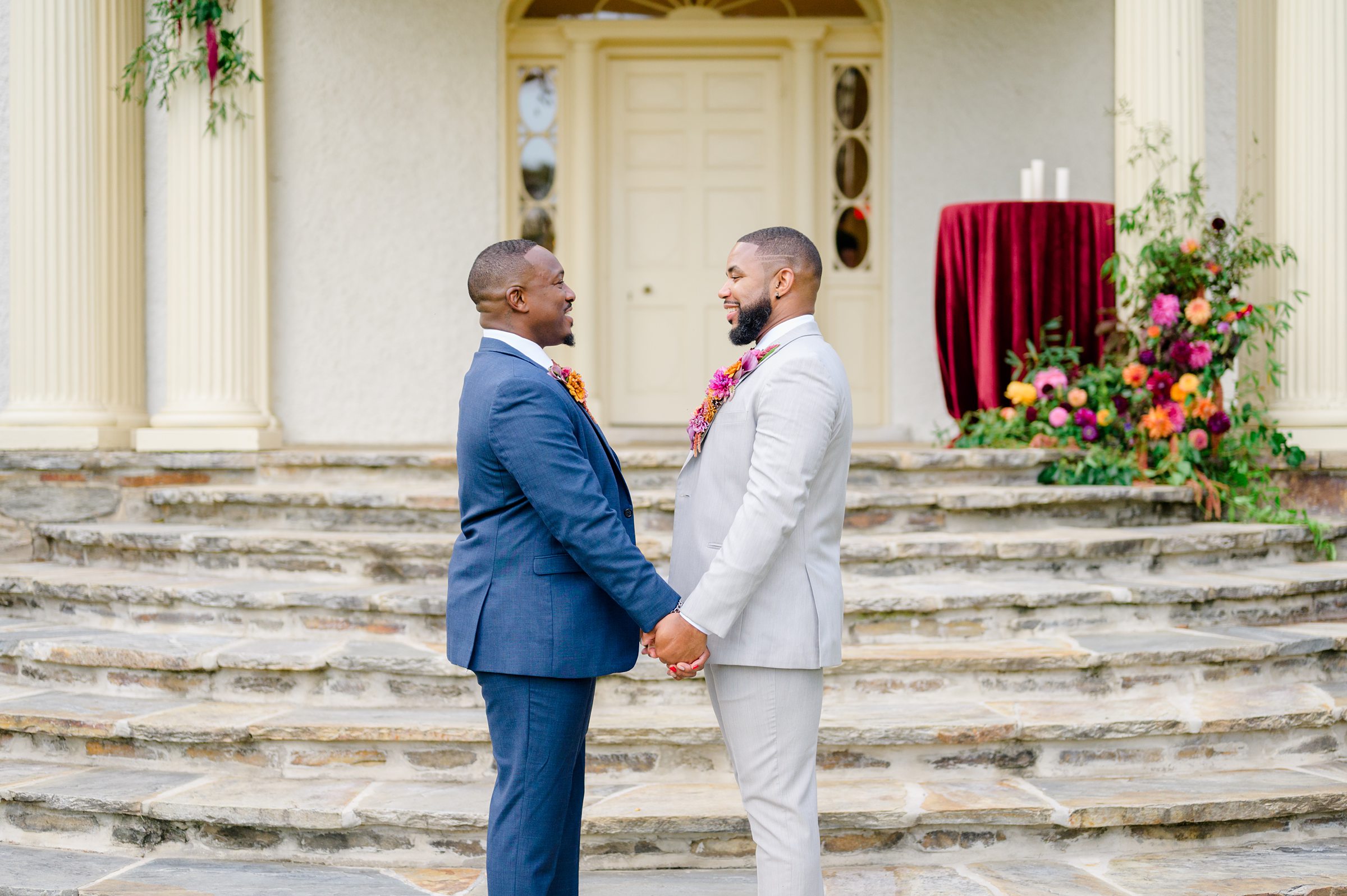 - Floral Accents: Each groom wore a unique floral accent— one with a boutonniere and the other with a floral lapel. These were positioned on the sides of their suit facing the ‘crowd’ during the ceremony, adding a thoughtful touch to ensure both accessories would be on display throughout the “wedding.”