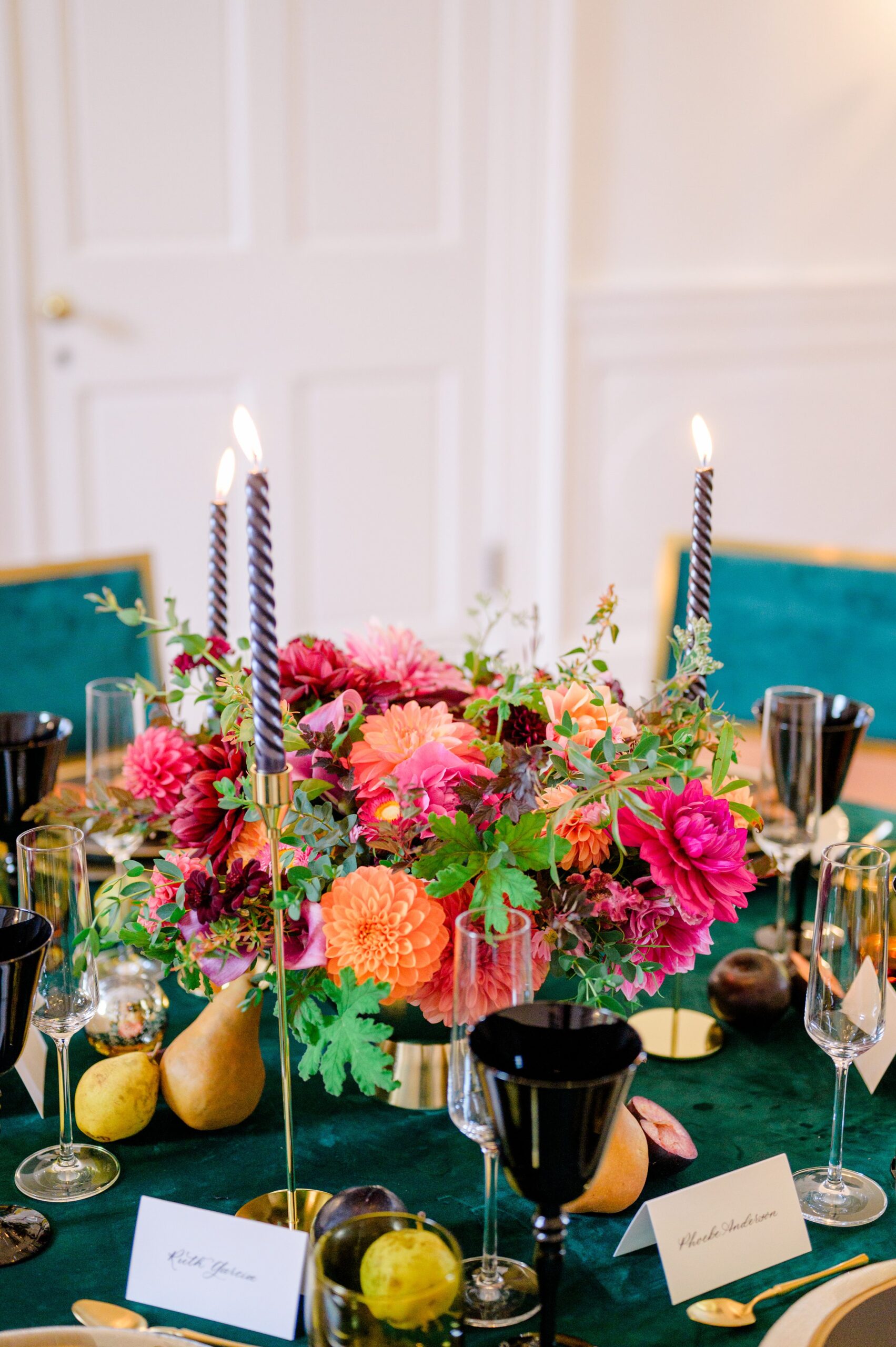 - Jewel Tone Color Palette: The rich colors combined with stone fruit and dahlias created a breathtaking visual ensemble that was elevated, sophisticated, and so very unique!