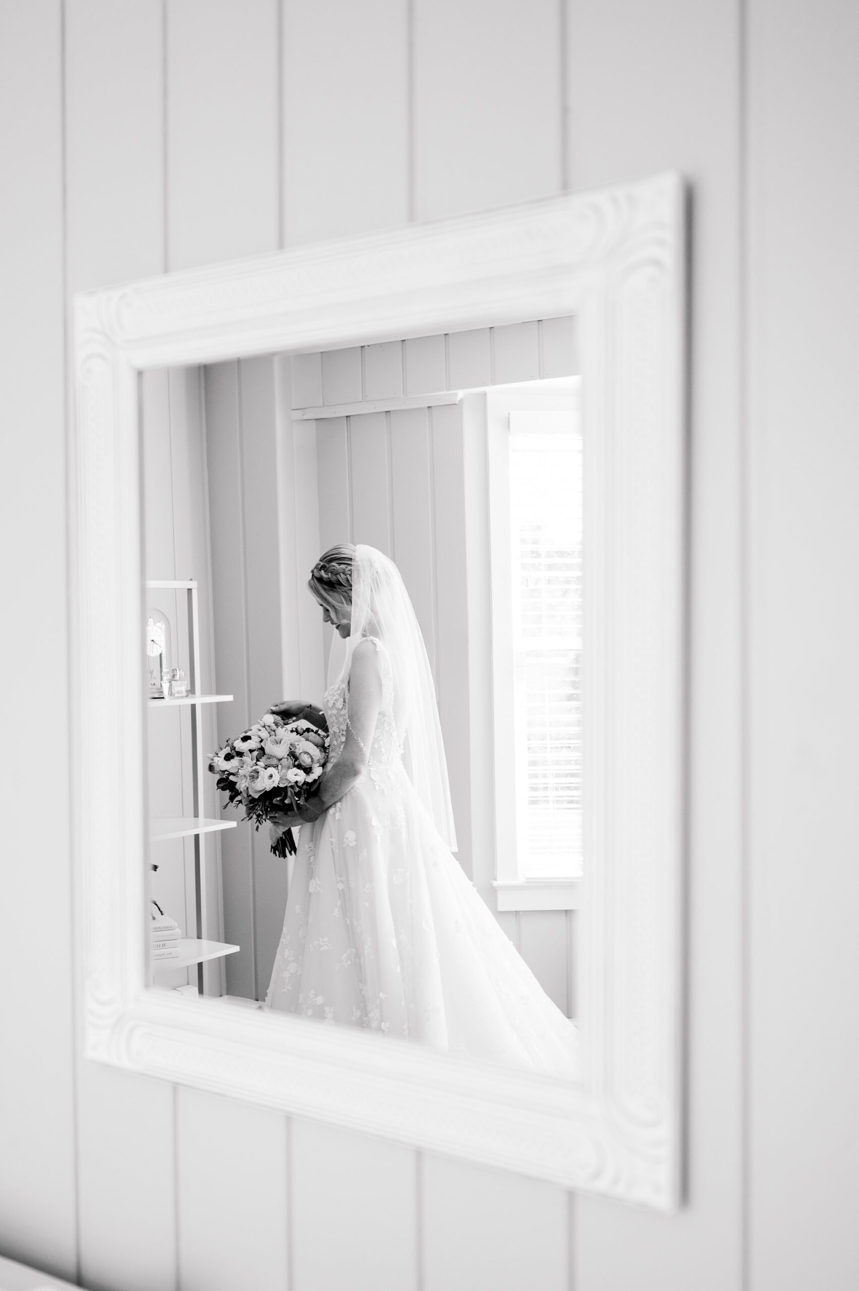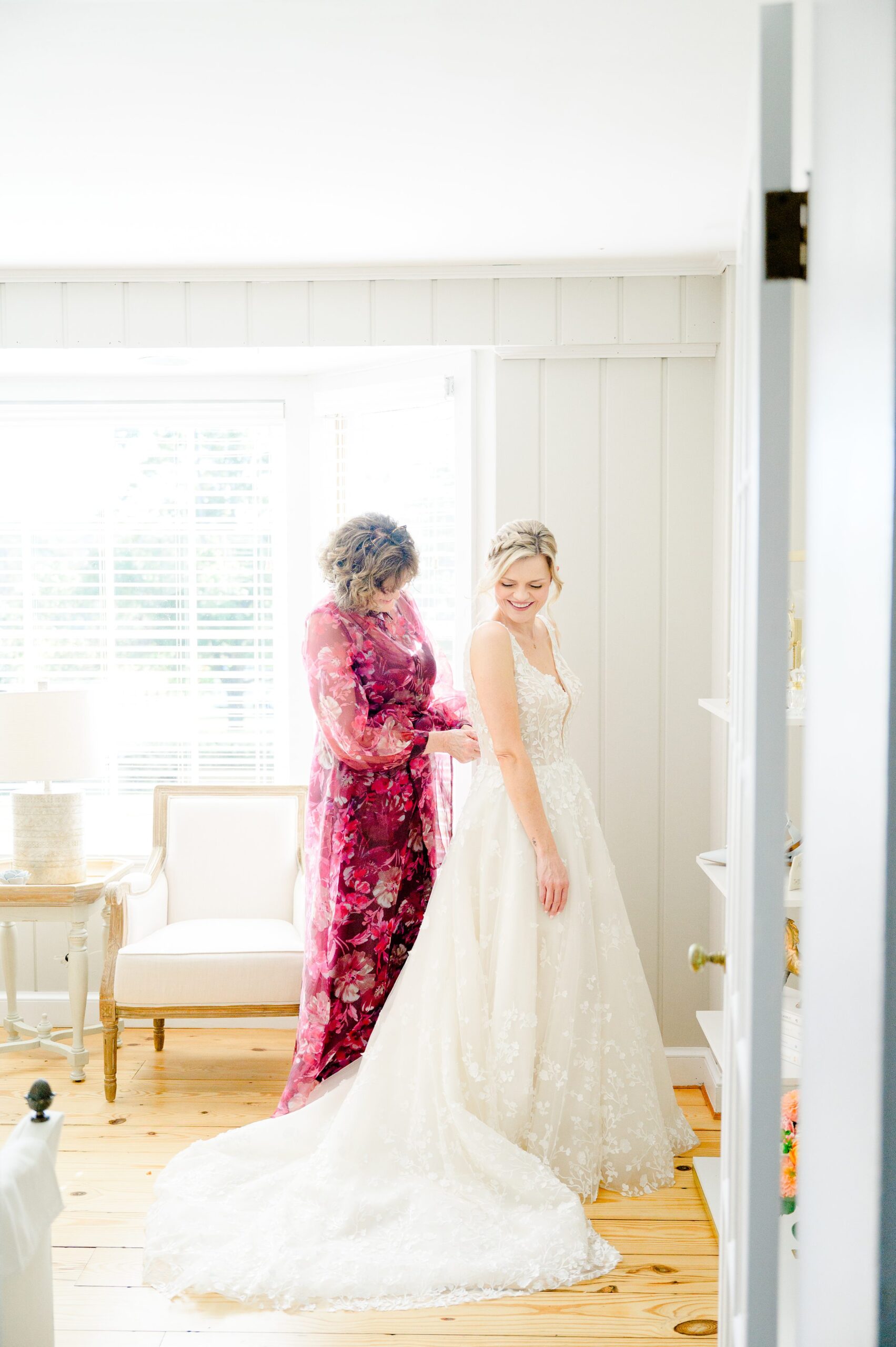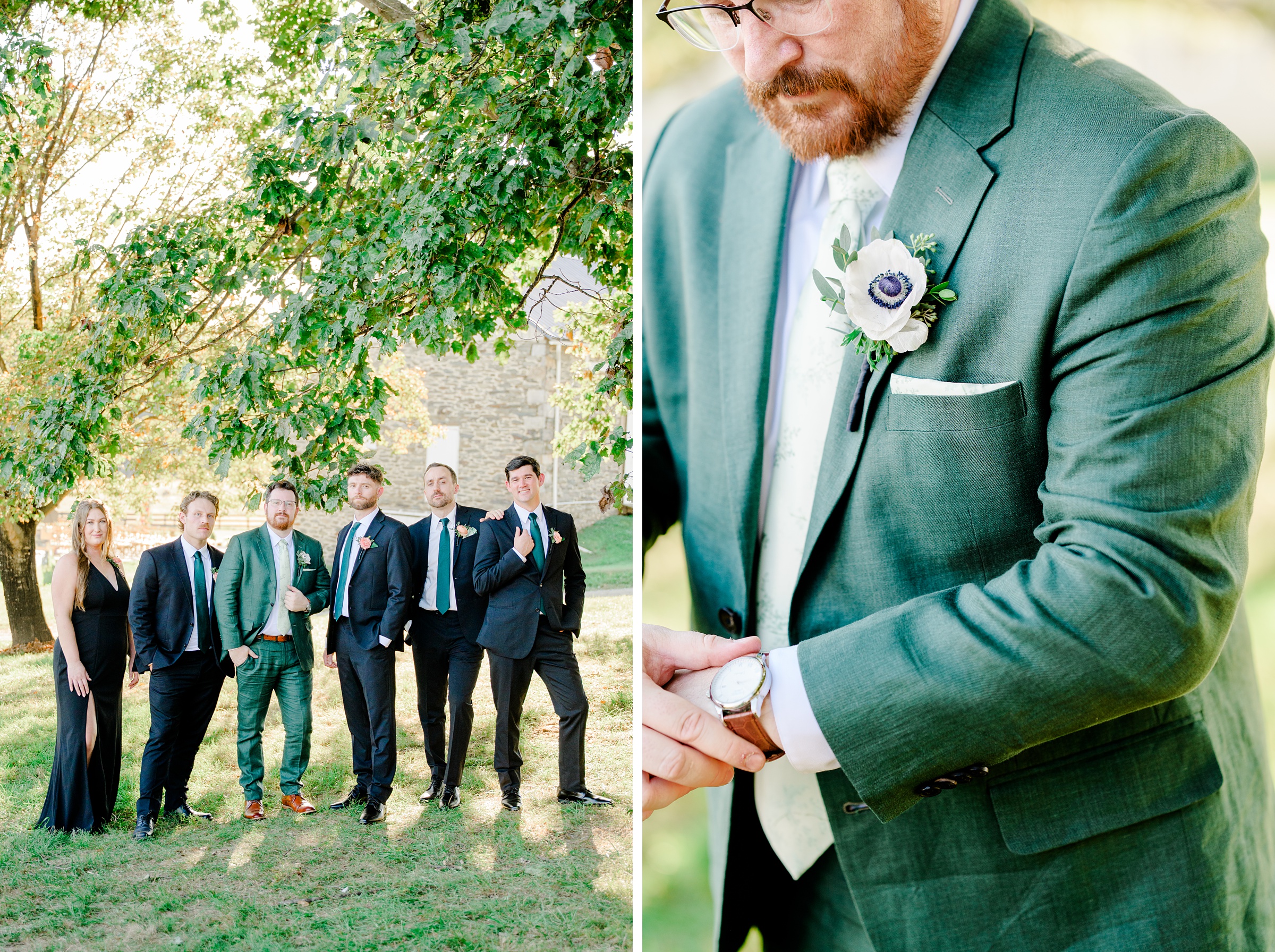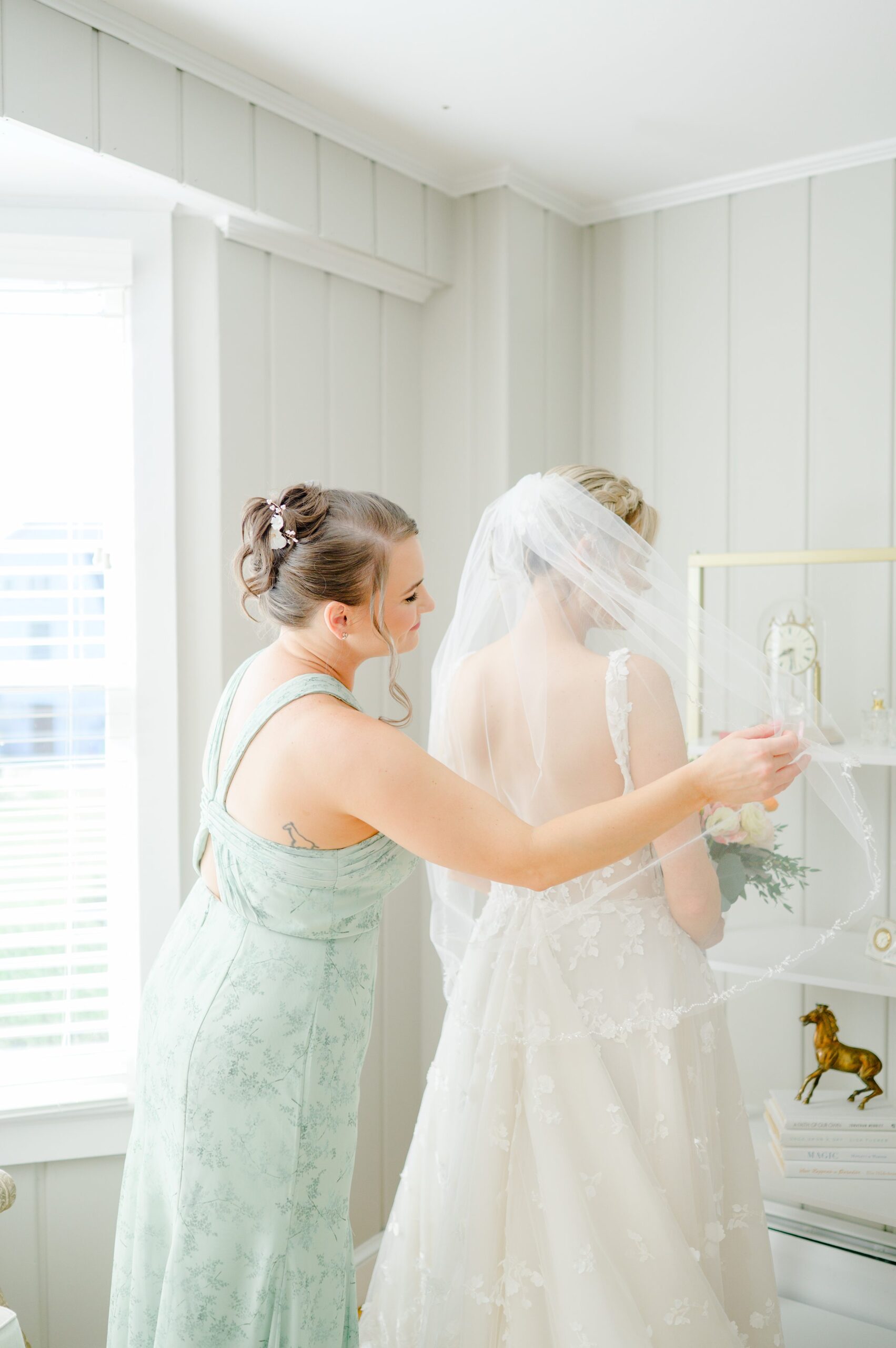 Before long, Madeline slipped into her gown with help from her mom and matron of honor, finishing her look with a delicate veil. Meanwhile, Sam was with Tom and his groomsmen in the reception barn, full of anticipation as everyone prepped for the day ahead!