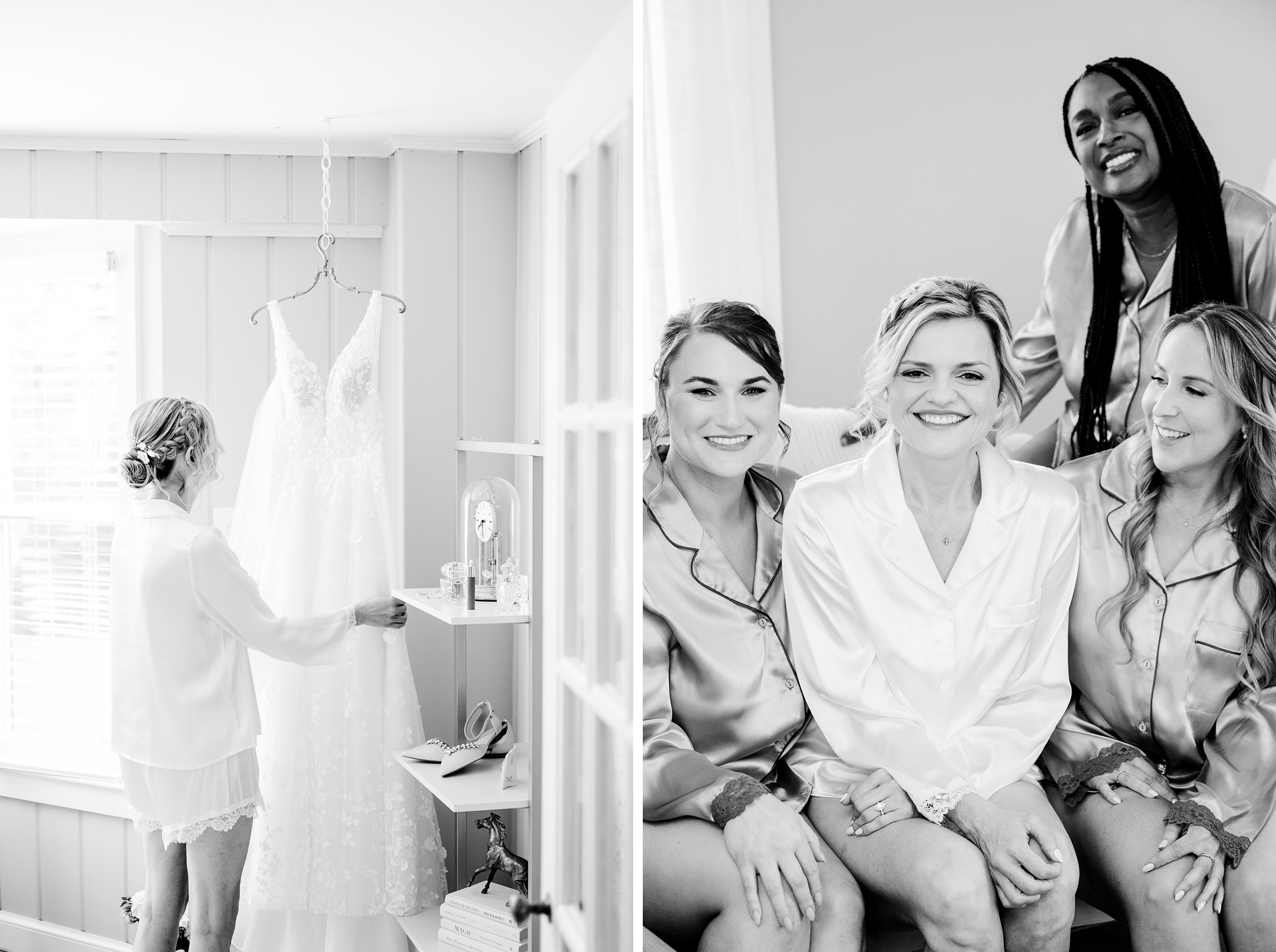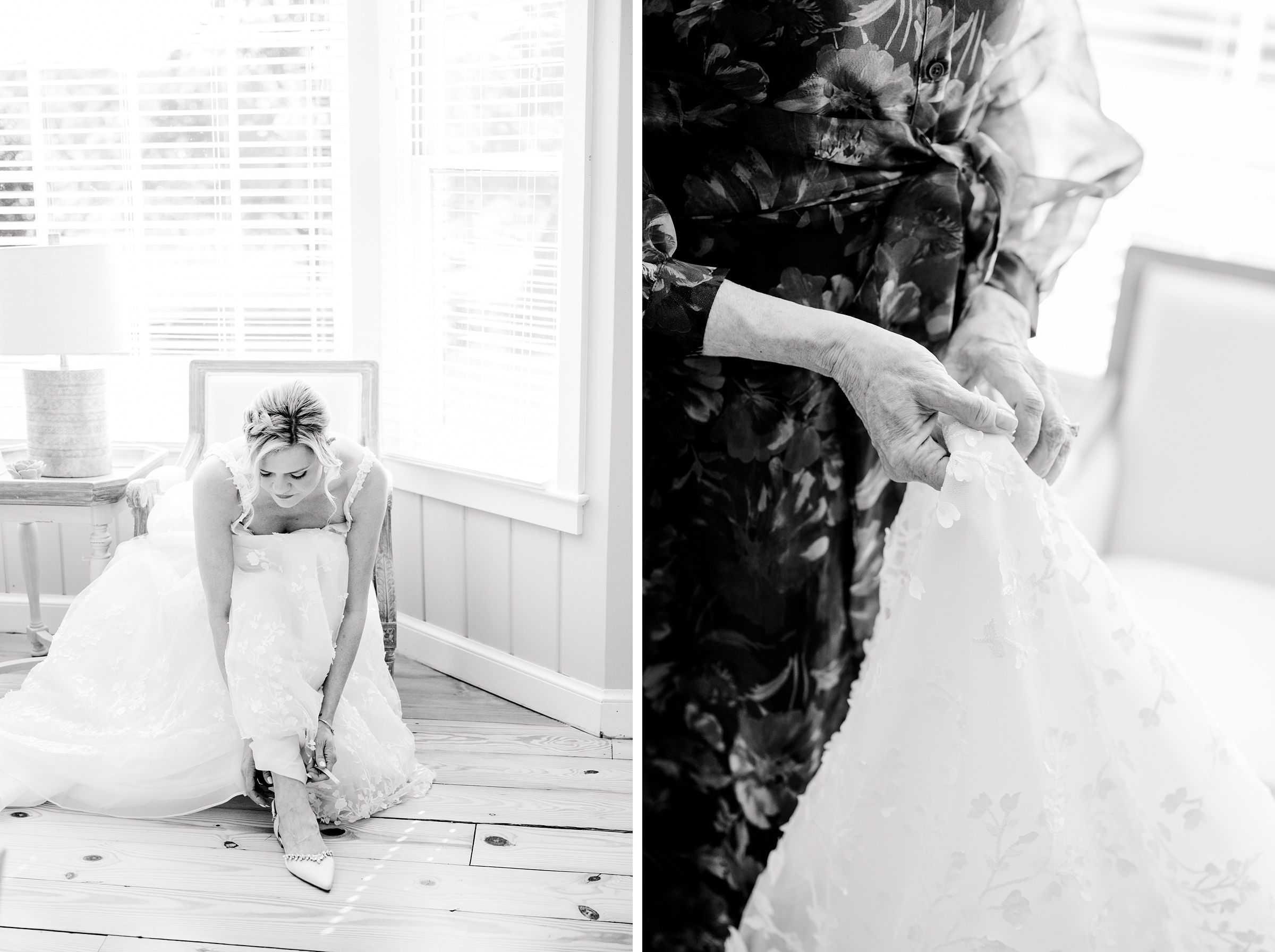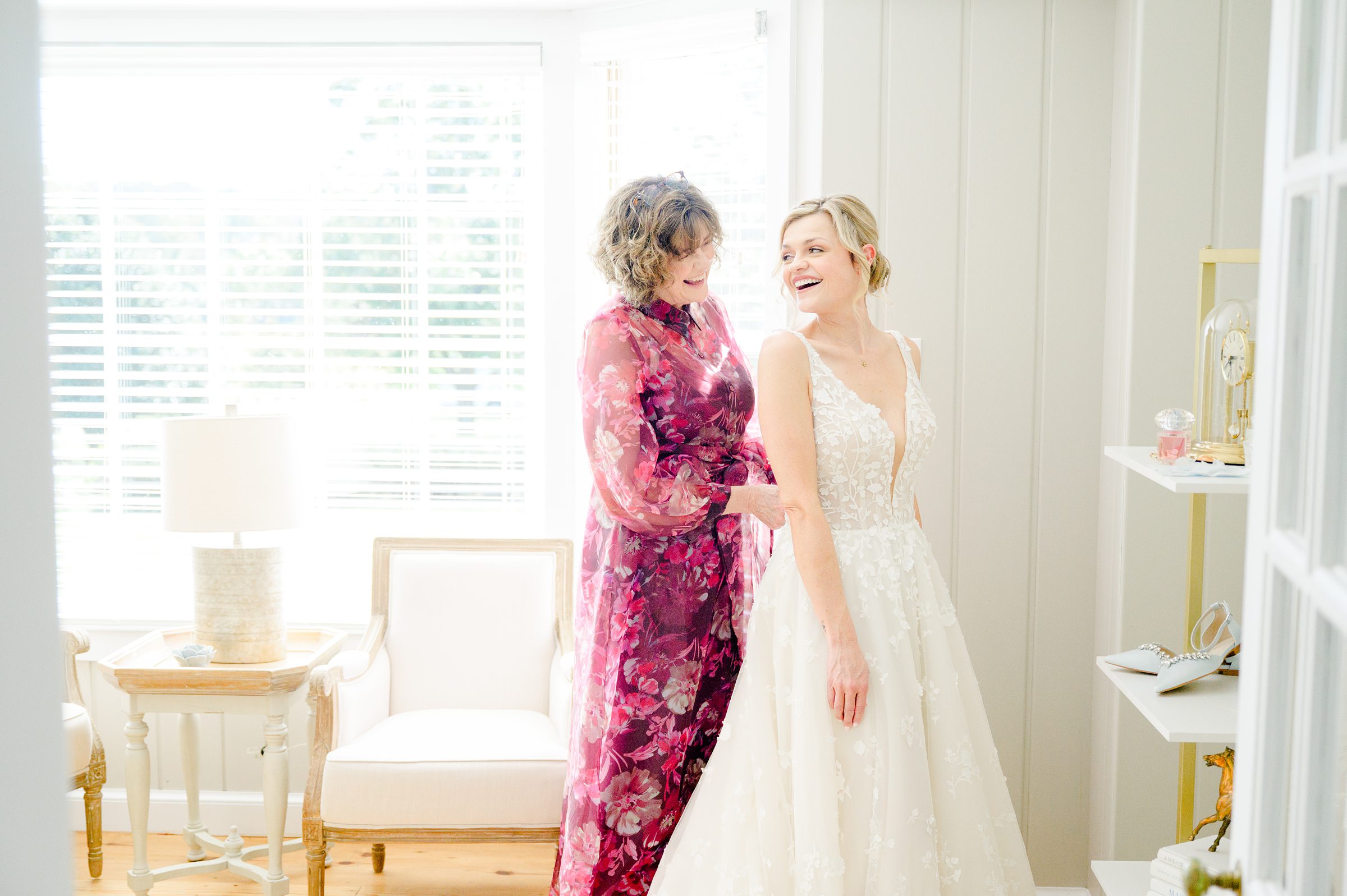 Before long, Madeline slipped into her gown with help from her mom and matron of honor, finishing her look with a delicate veil. Meanwhile, Sam was with Tom and his groomsmen in the reception barn, full of anticipation as everyone prepped for the day ahead!