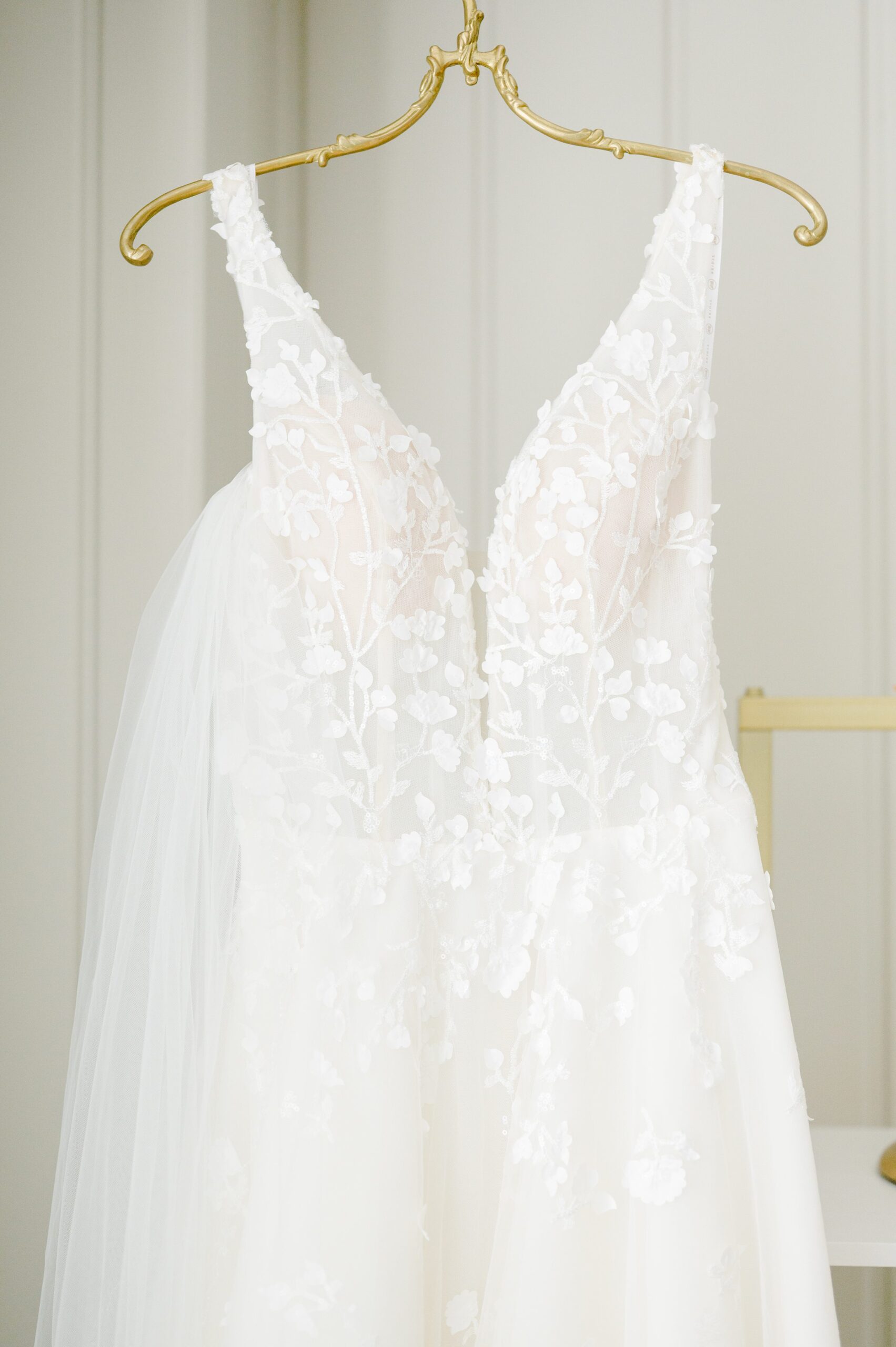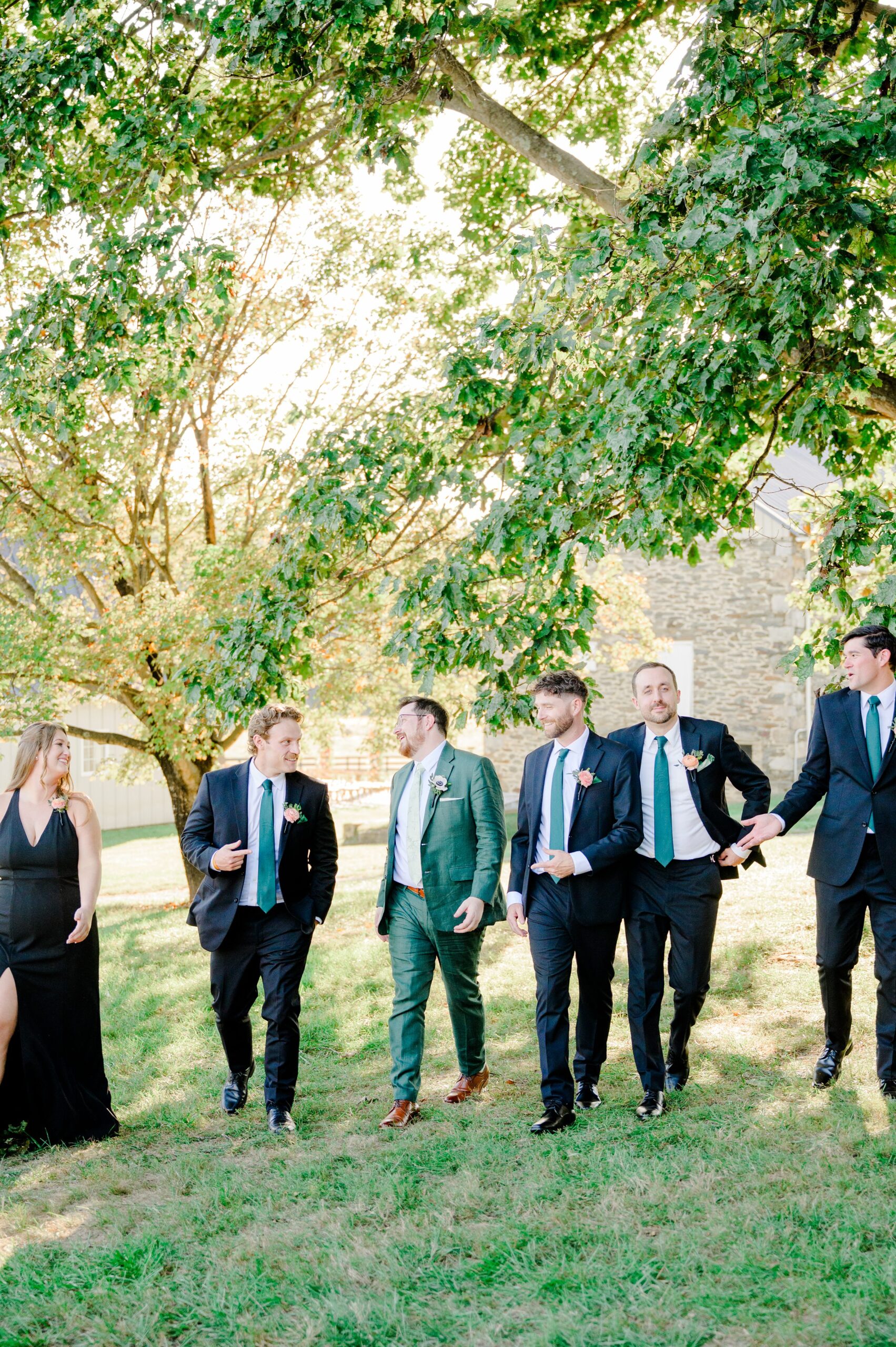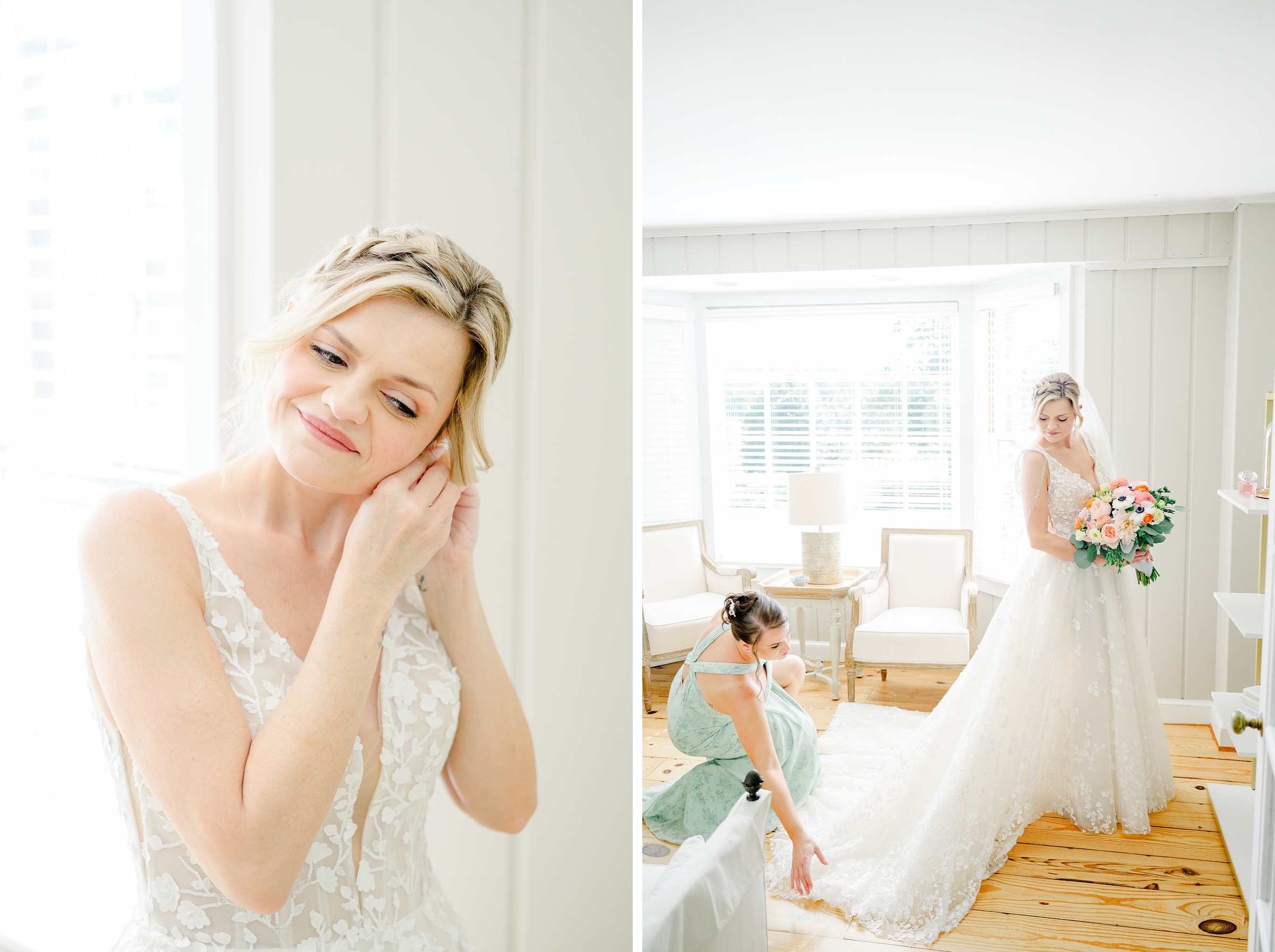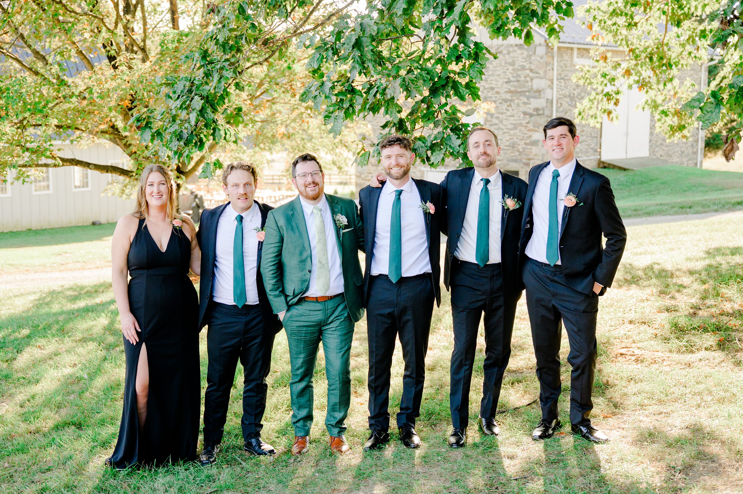 Before long, Madeline slipped into her gown with help from her mom and matron of honor, finishing her look with a delicate veil. Meanwhile, Sam was with Tom and his groomsmen in the reception barn, full of anticipation as everyone prepped for the day ahead!