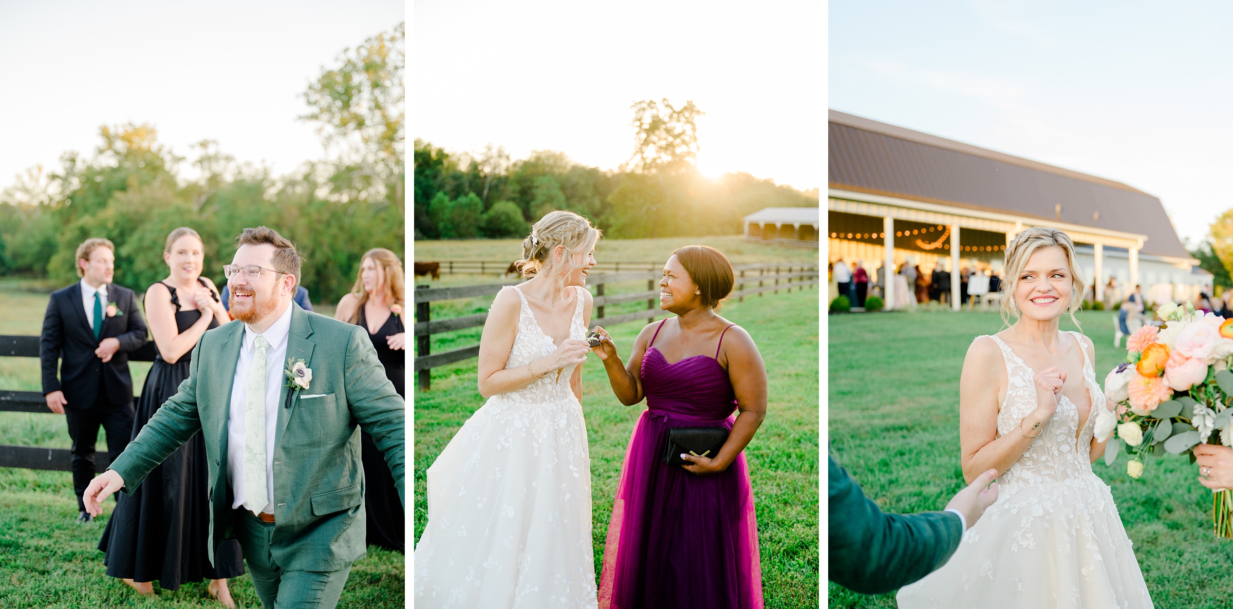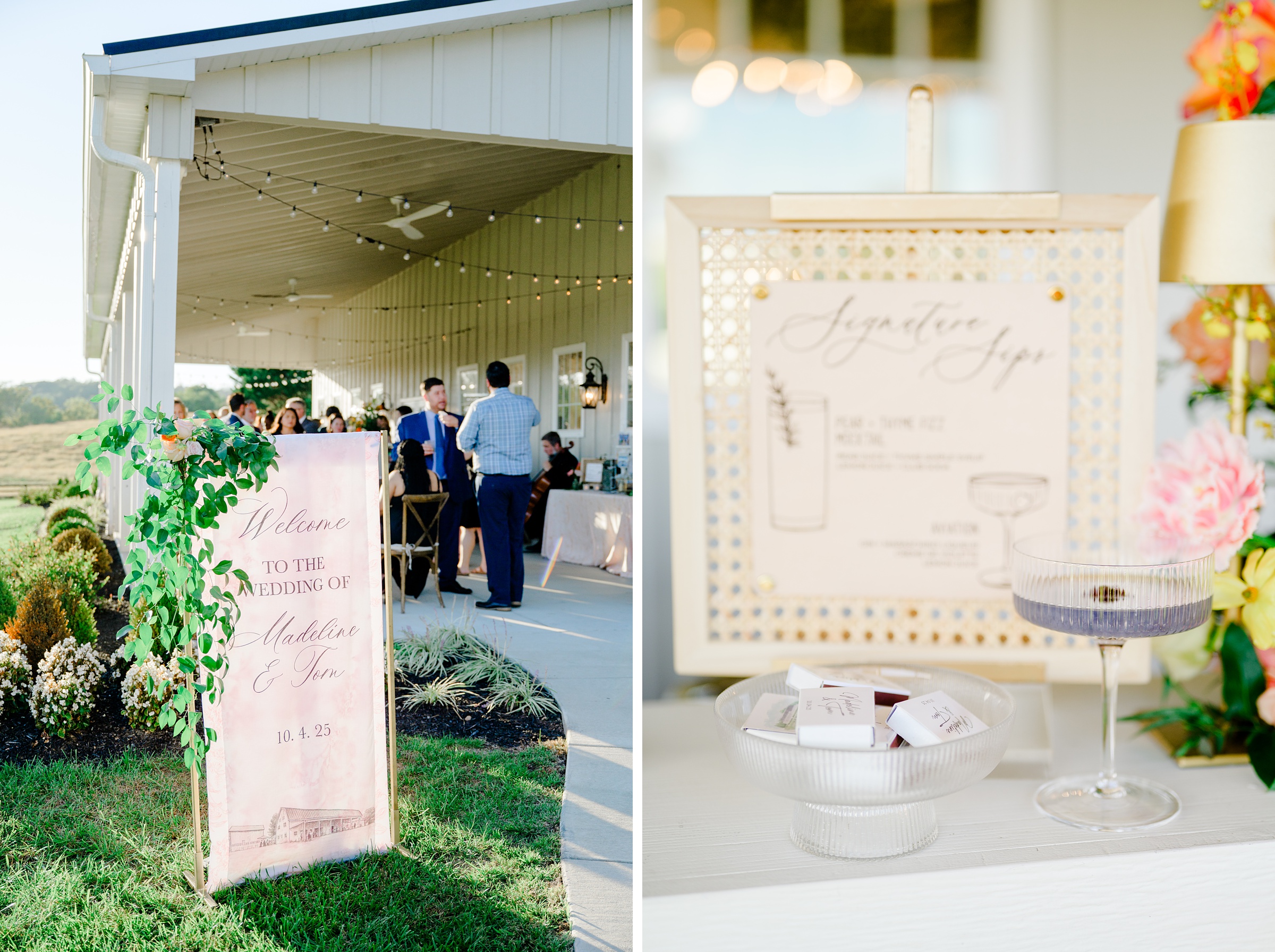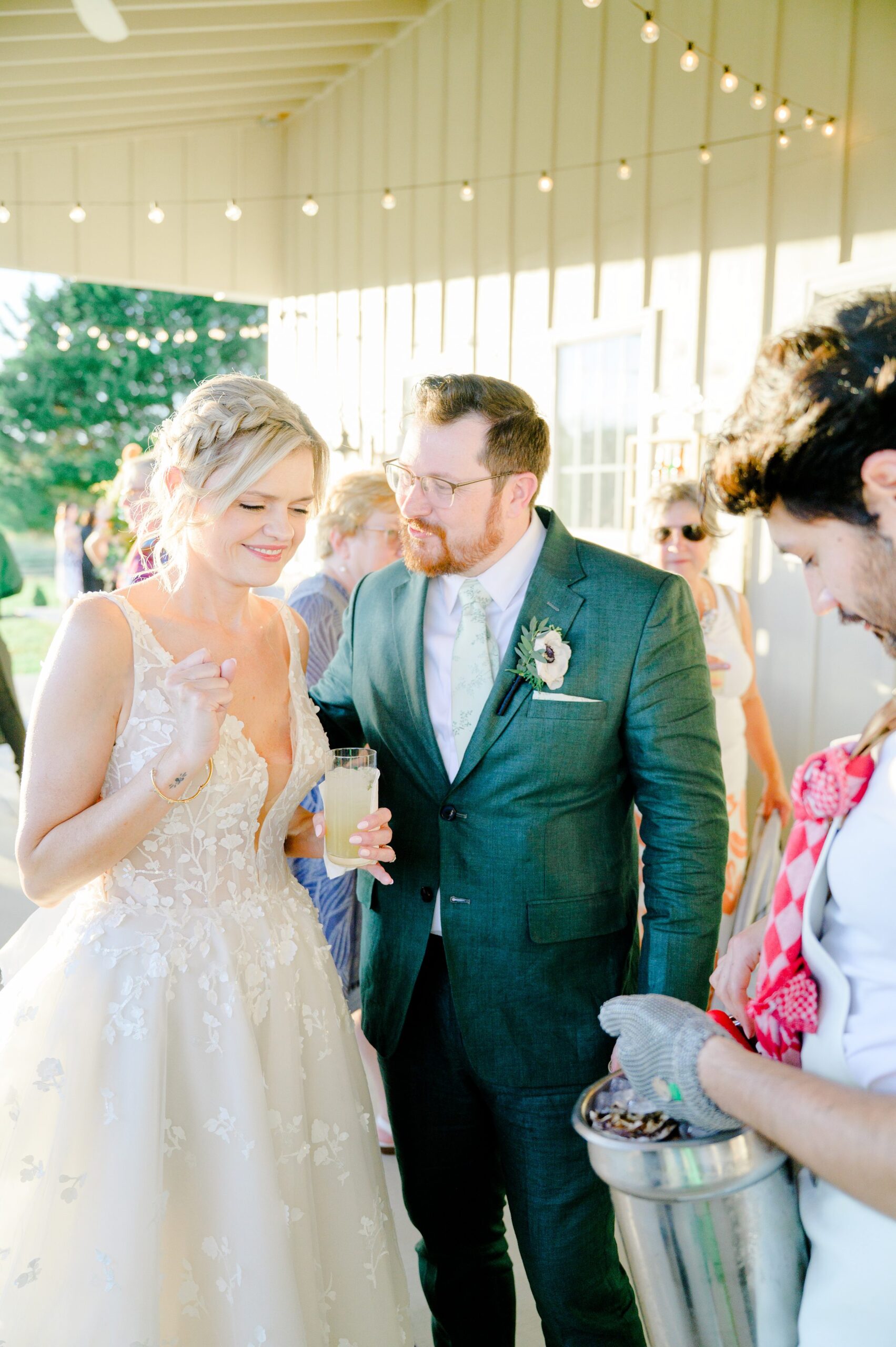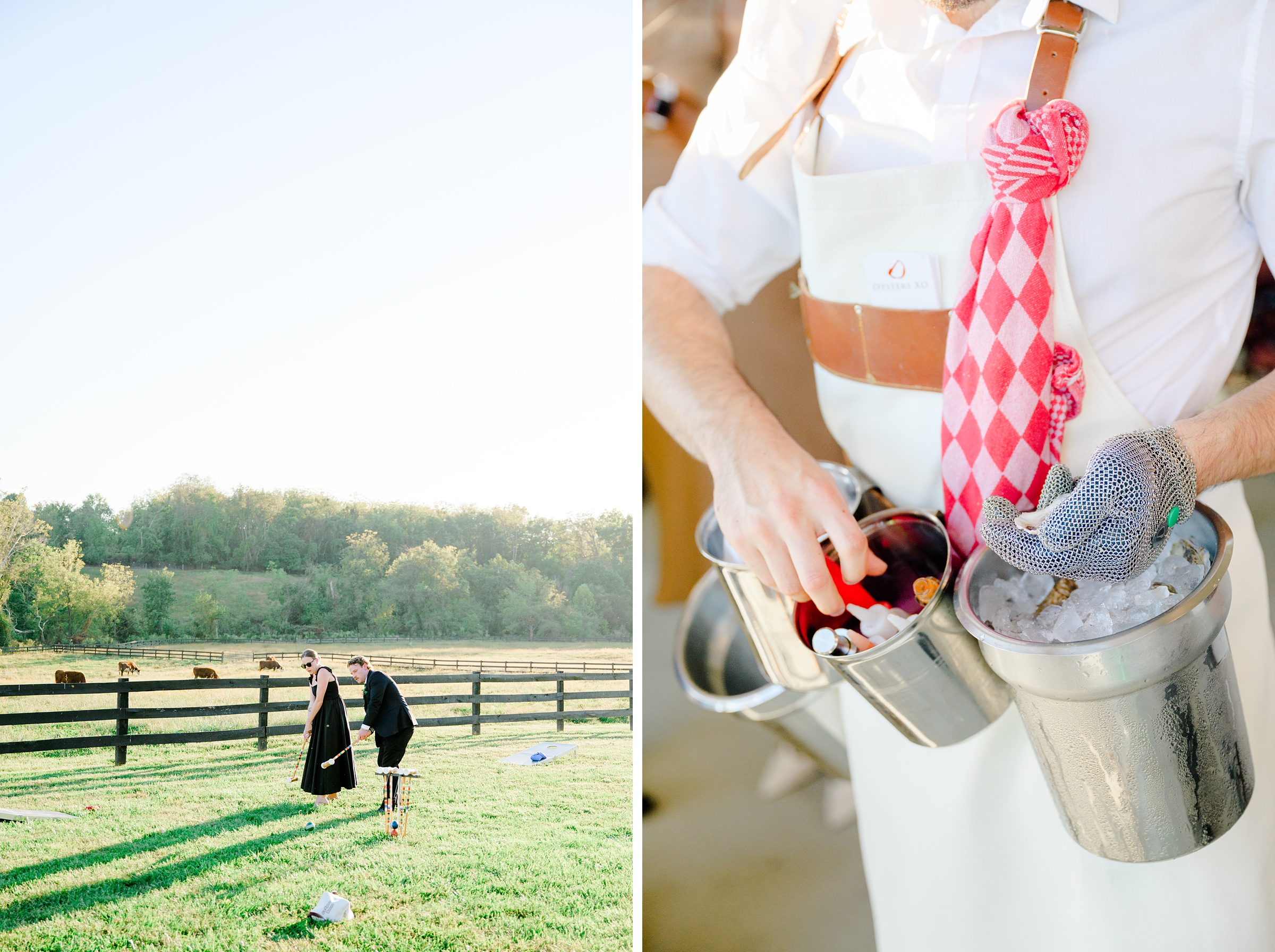 Cocktail hour took place outside with stunning views of the Virginia countryside. Guests enjoyed cocktails, incredible apps, and hand-shucked oysters as golden light poured over the cow pastures (yes, cows!). It was one of those magical moments that made this Still Meadow Farm wedding day feel even more like a dream.