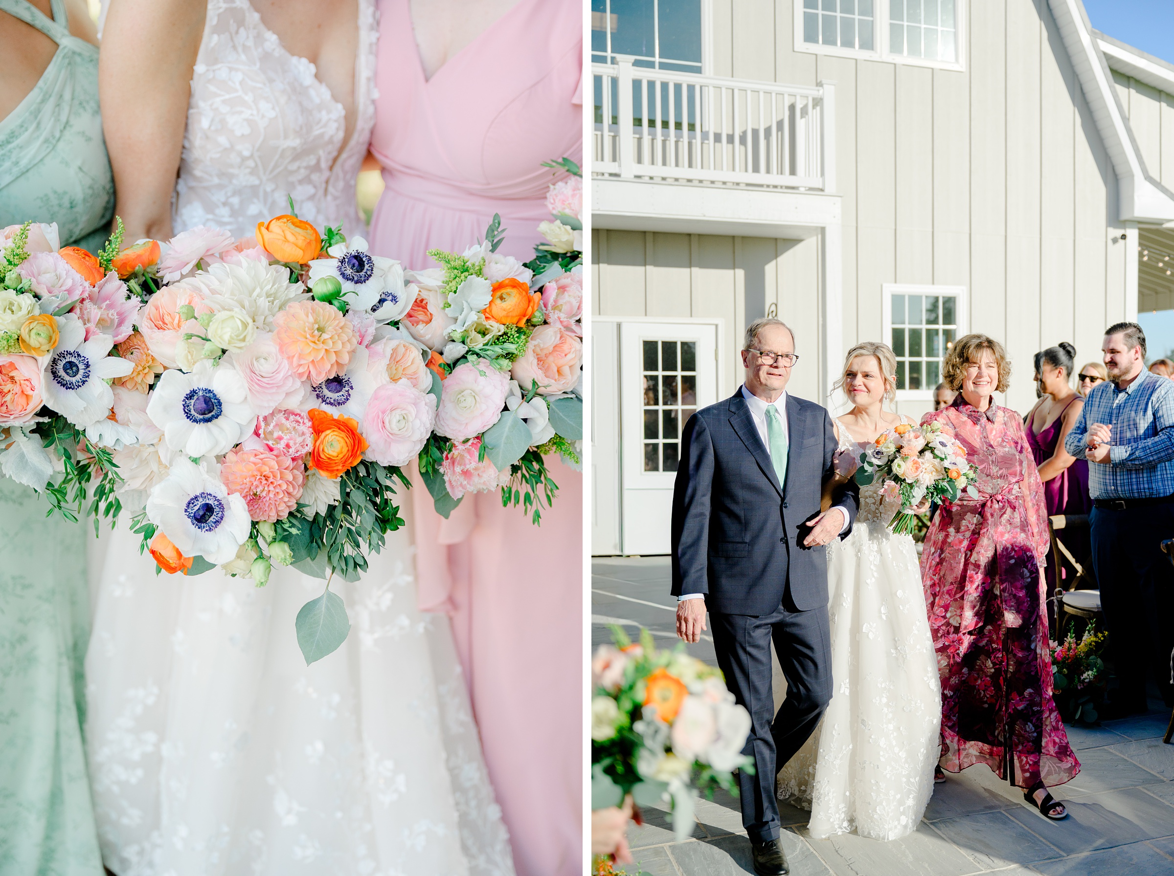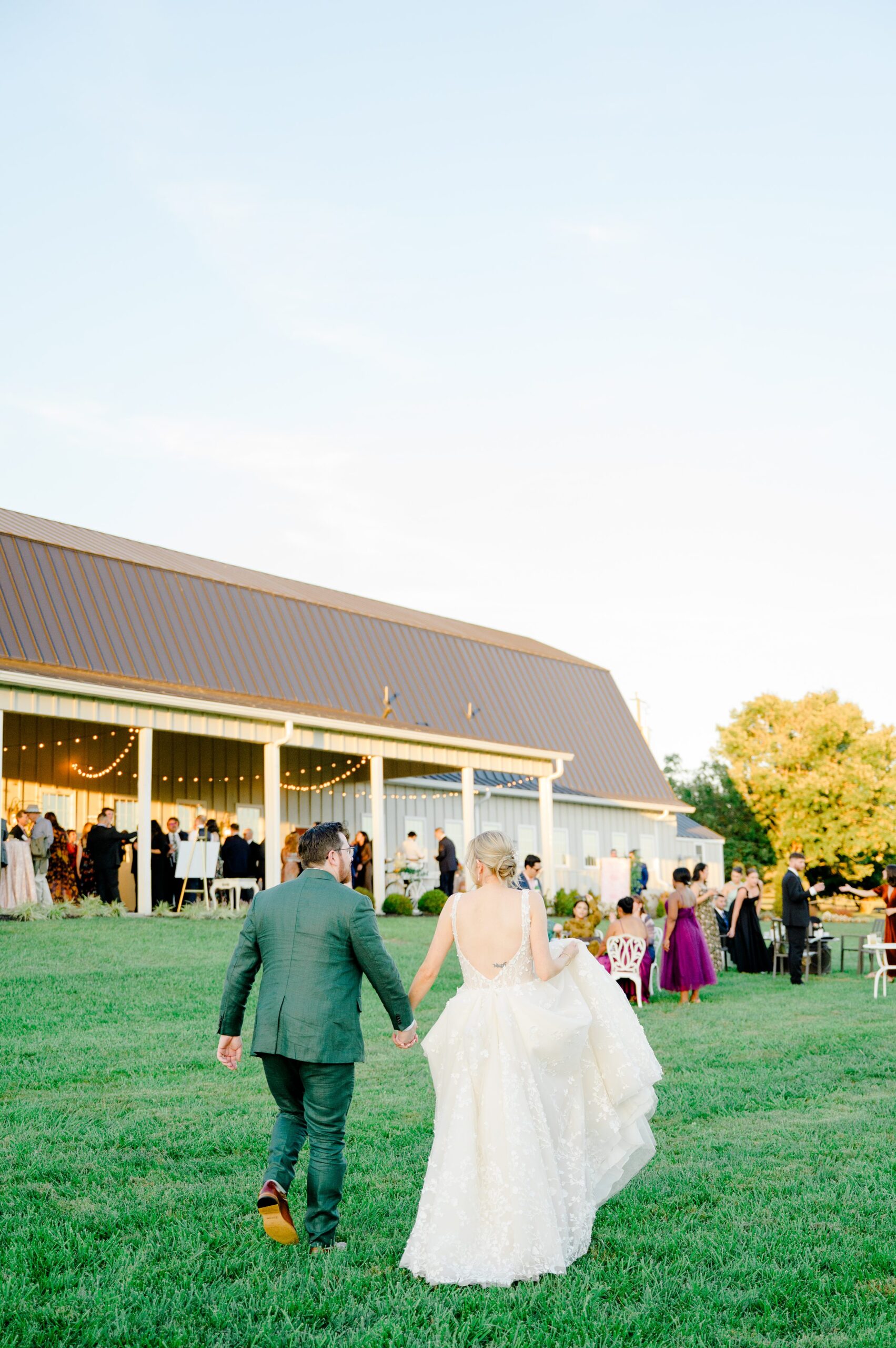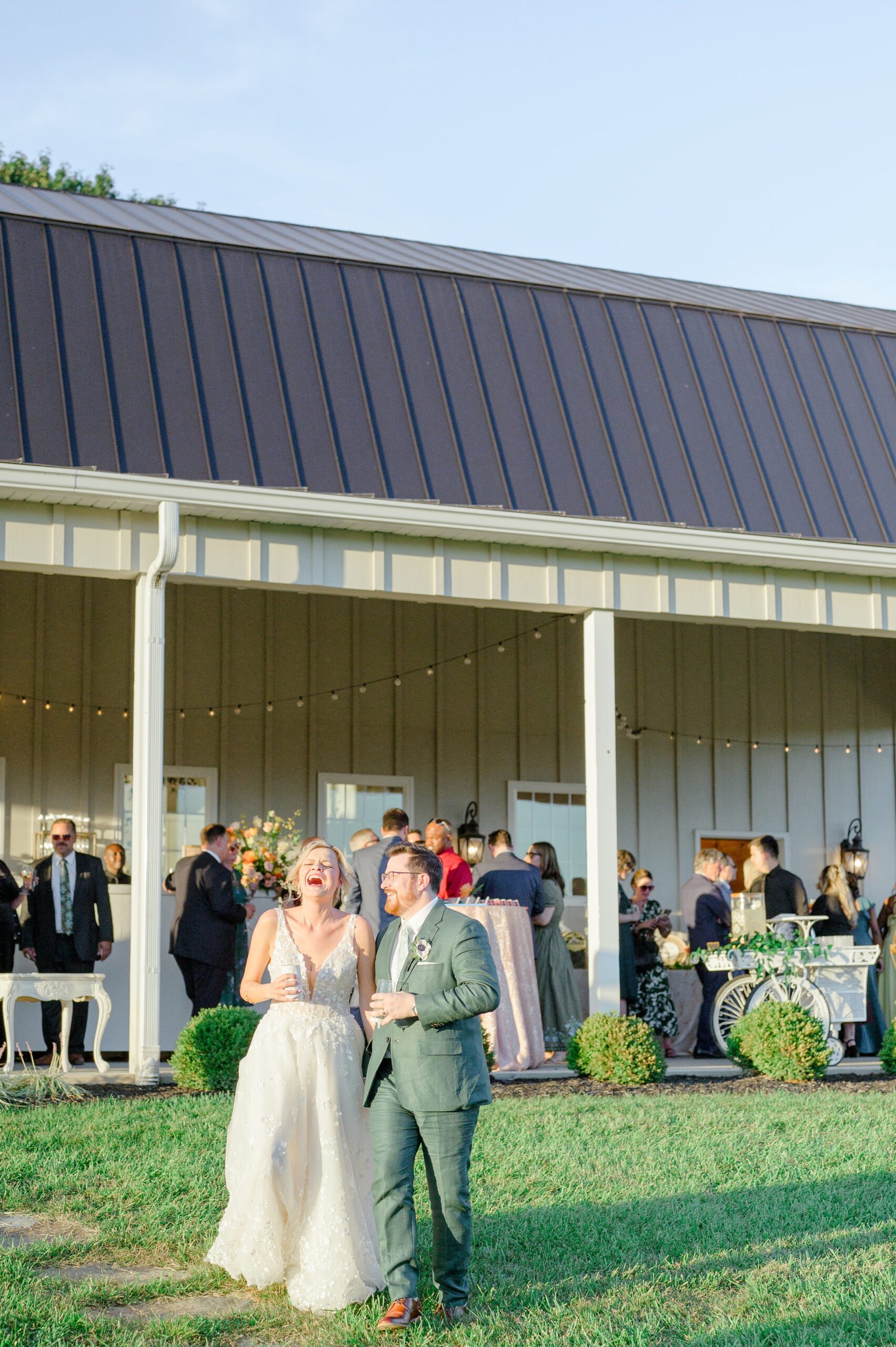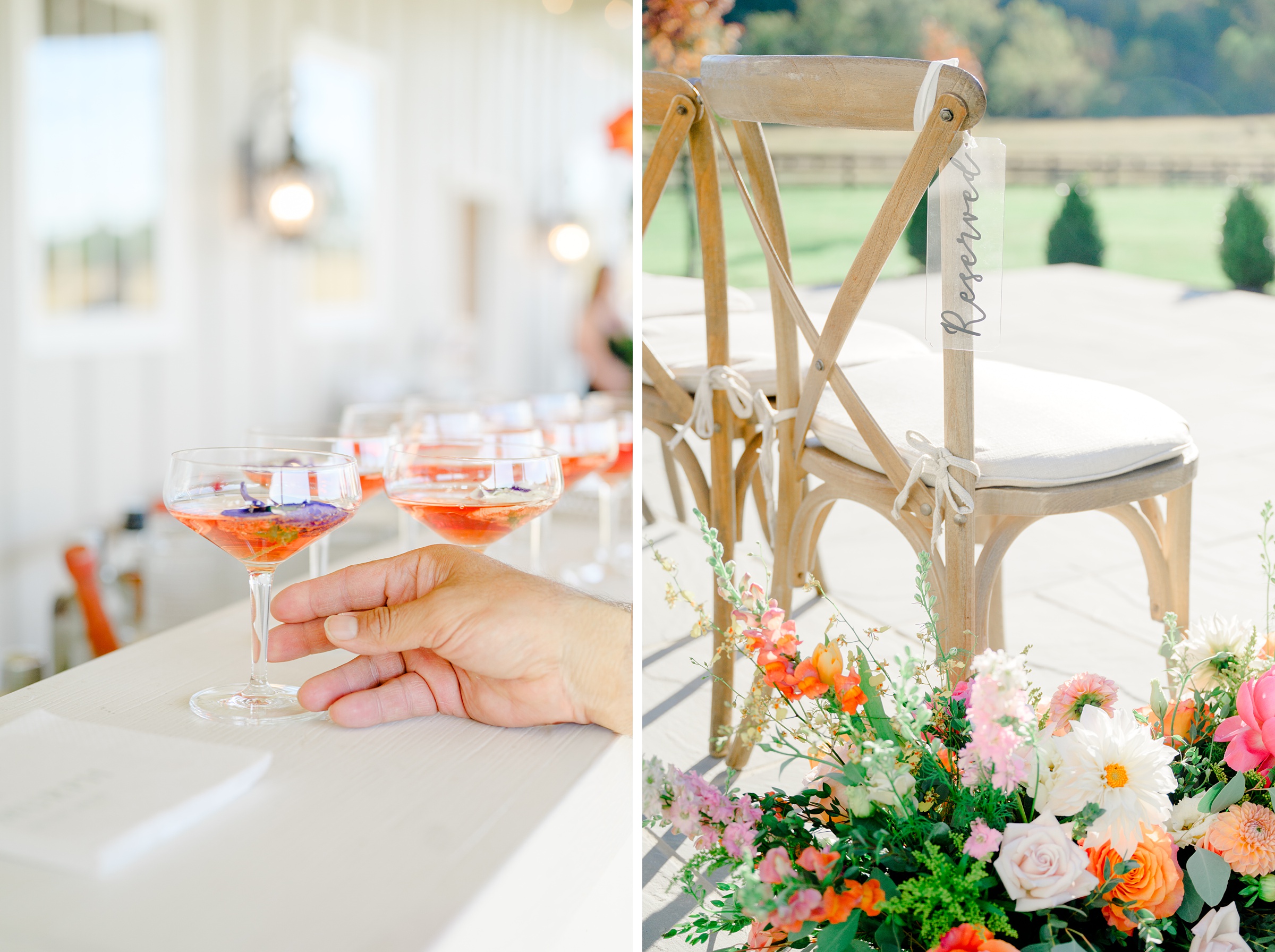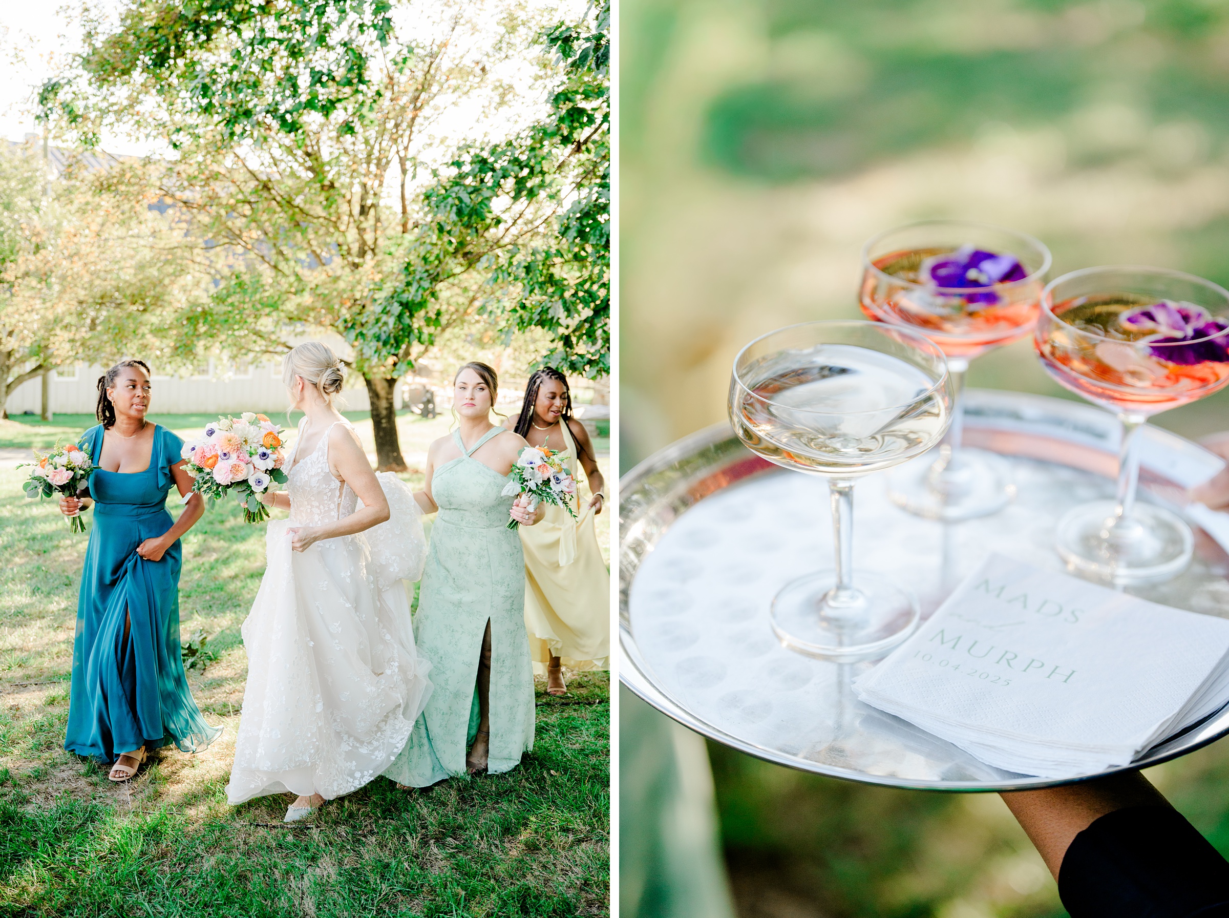 Cocktail hour took place outside with stunning views of the Virginia countryside. Guests enjoyed cocktails, incredible apps, and hand-shucked oysters as golden light poured over the cow pastures (yes, cows!). It was one of those magical moments that made this Still Meadow Farm wedding day feel even more like a dream.