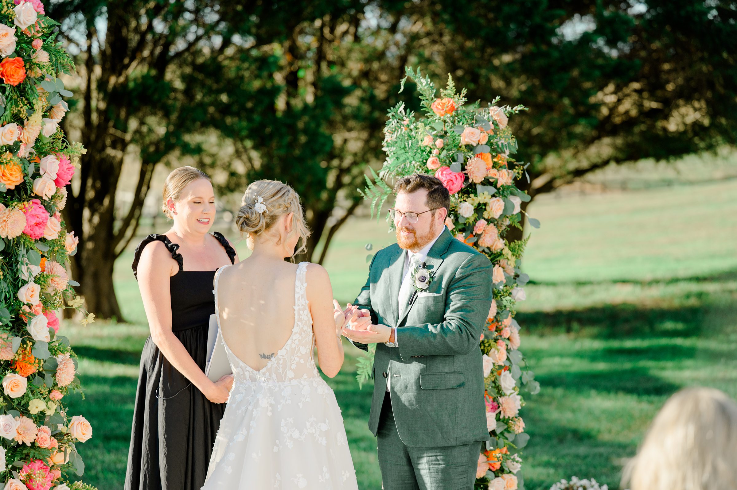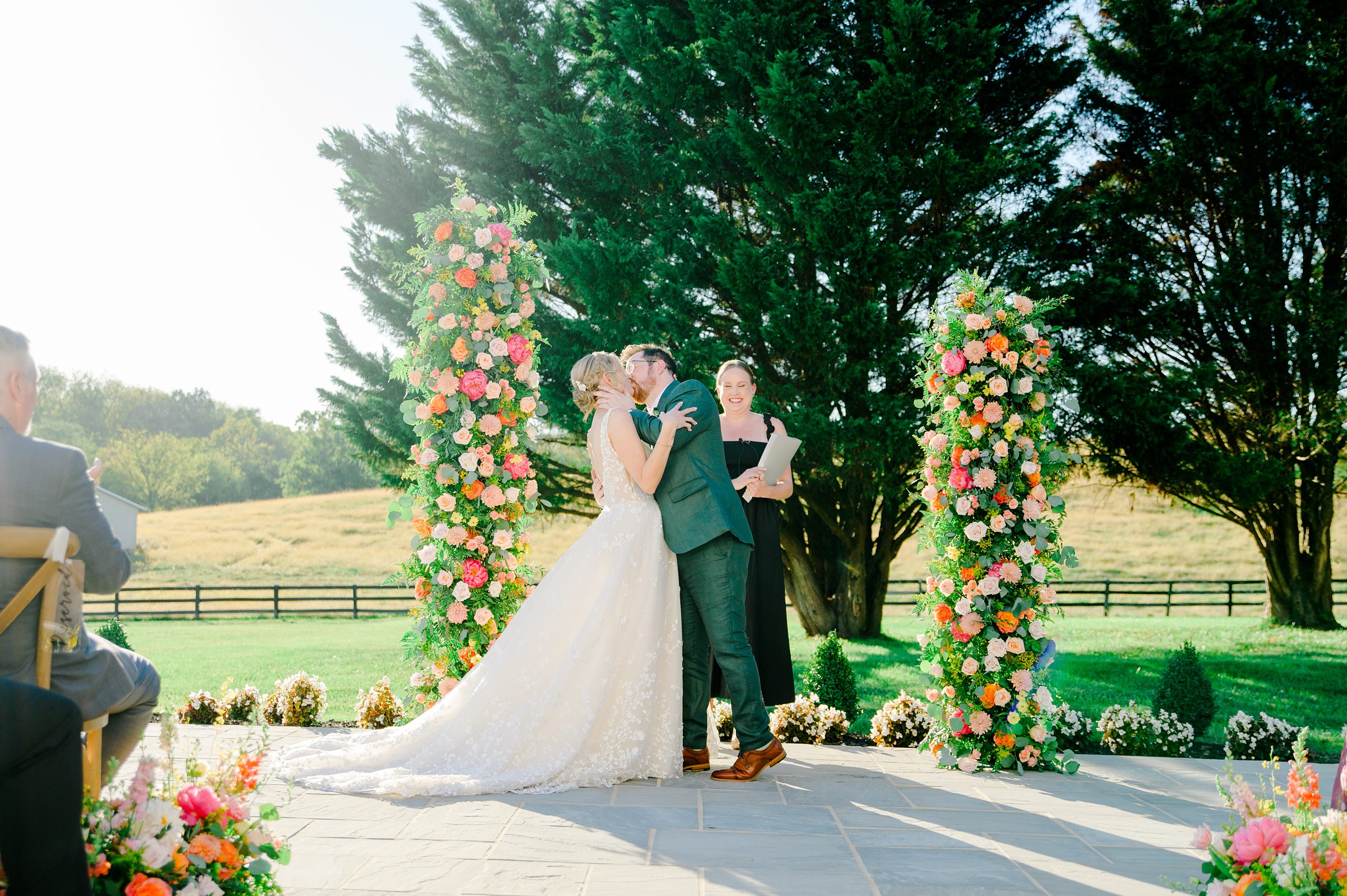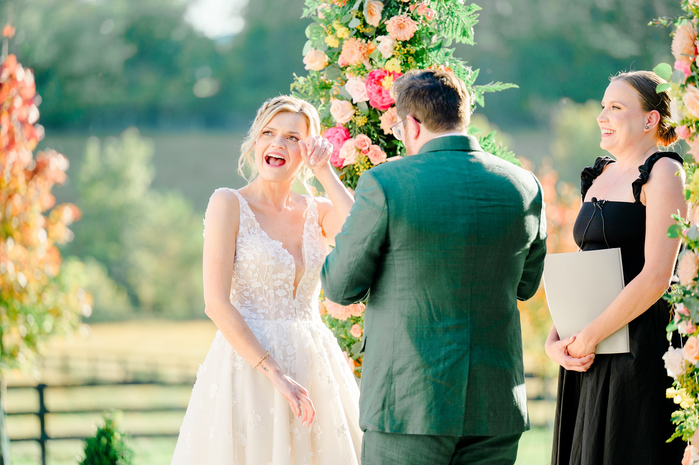 Before we knew it, guests arrived to Still Meadow, greeted with champagne topped with delicate edible flowers—a lovely first touch and nod towards the thoughtful guest experience to come. Their ceremony, officiated by a dear friend, included stories from their relationship, perfectly timed laughs, and even a quick game of Rock, Paper, Scissors to decide who would say vows first. They exchanged personal vows that had everyone tearing up, placed rings on fingers, and sealed it all with a kiss.