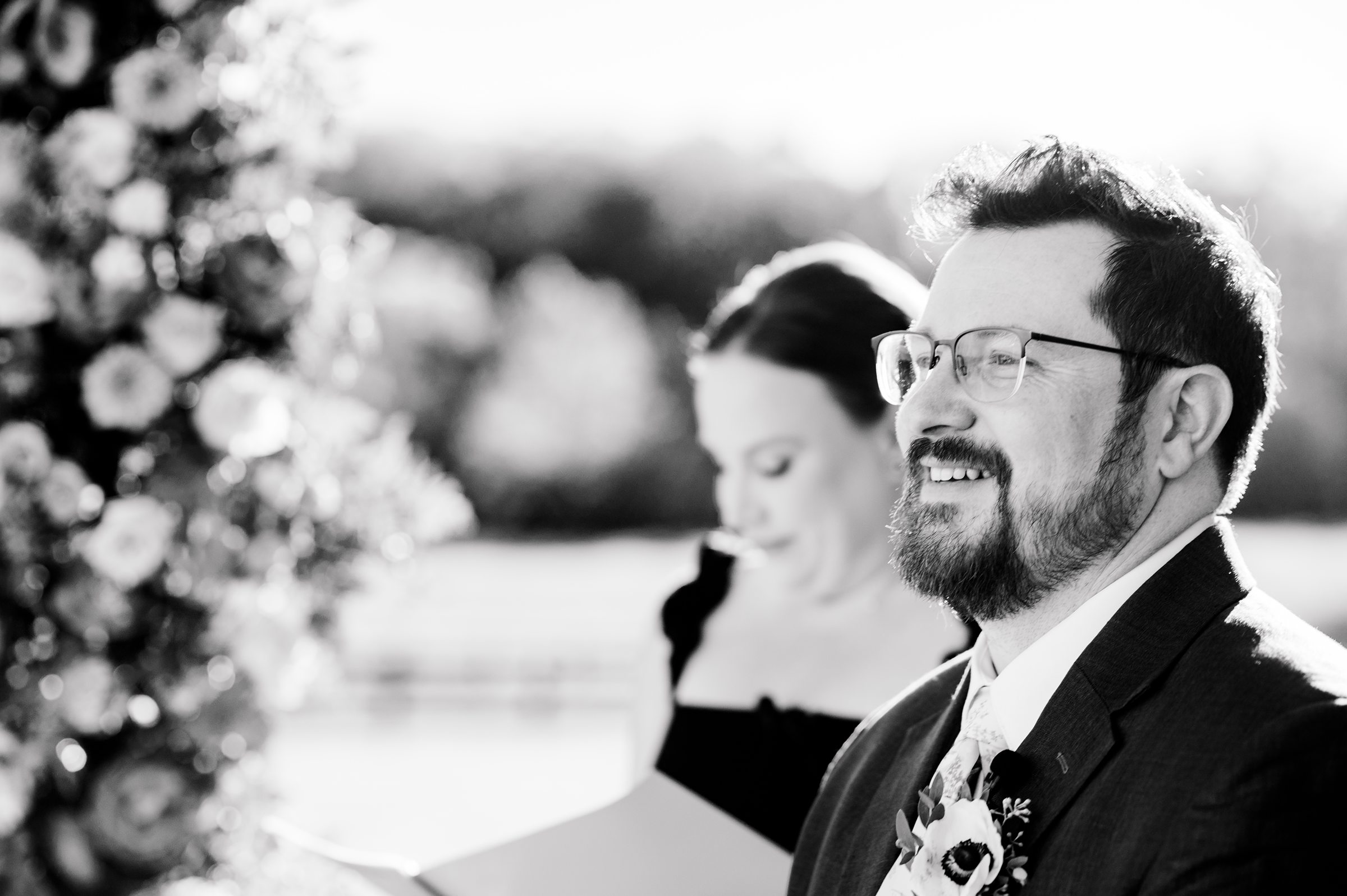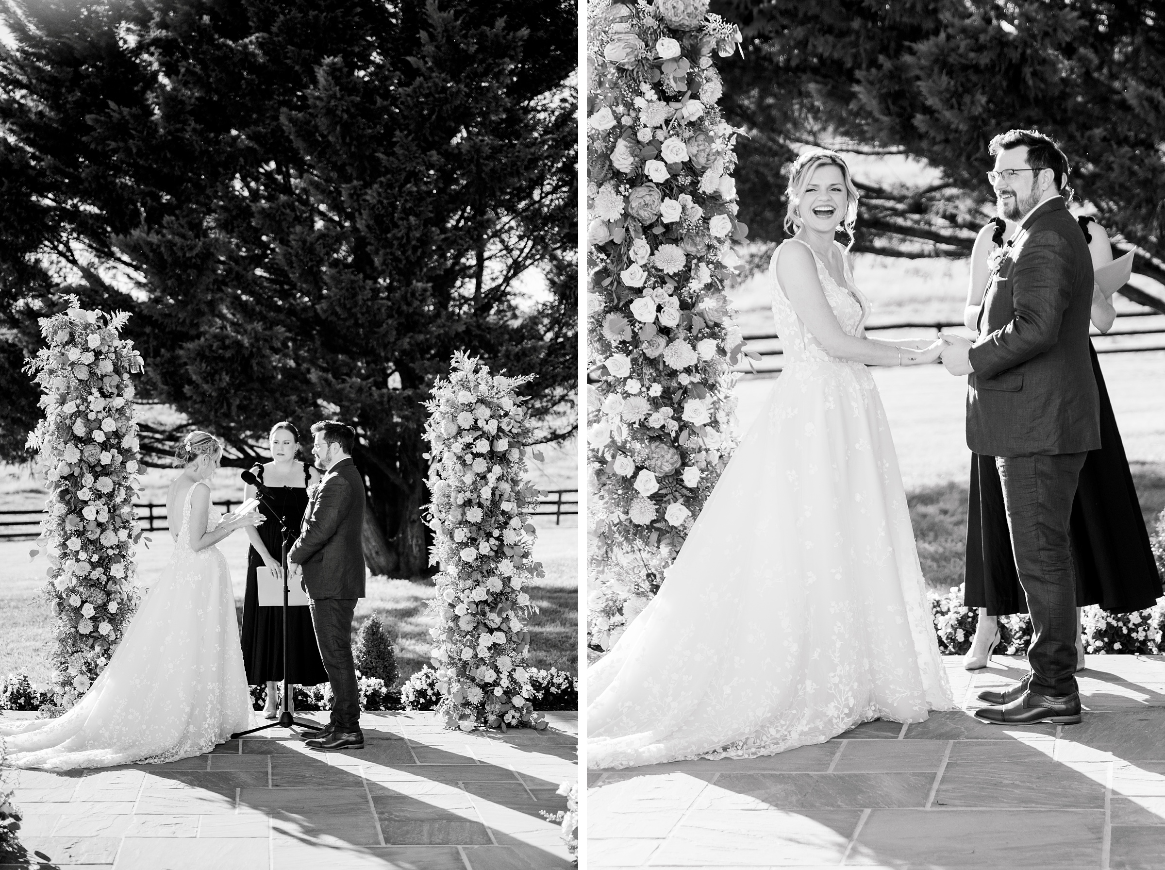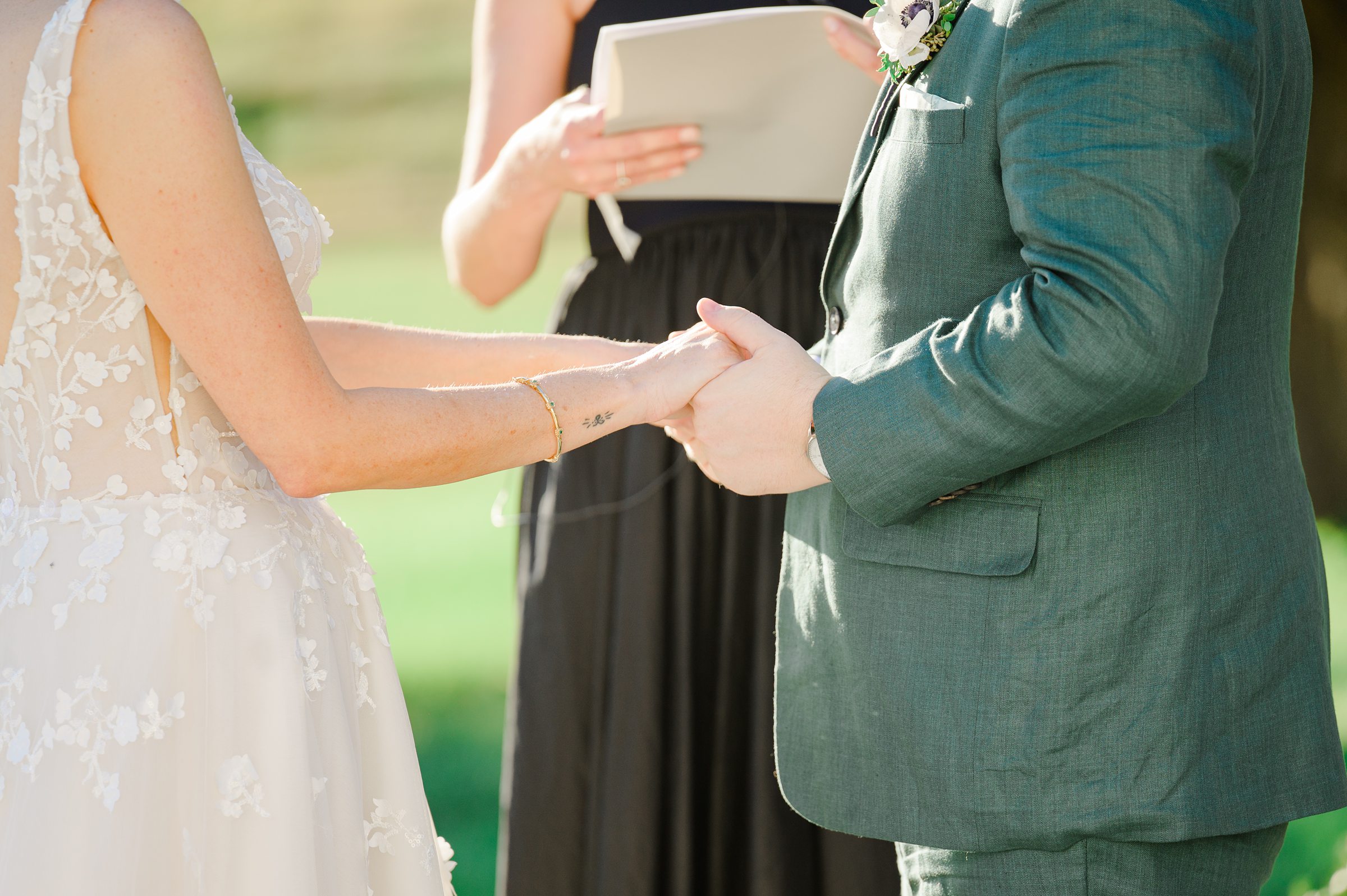 Before we knew it, guests arrived to Still Meadow, greeted with champagne topped with delicate edible flowers—a lovely first touch and nod towards the thoughtful guest experience to come. Their ceremony, officiated by a dear friend, included stories from their relationship, perfectly timed laughs, and even a quick game of Rock, Paper, Scissors to decide who would say vows first. They exchanged personal vows that had everyone tearing up, placed rings on fingers, and sealed it all with a kiss.