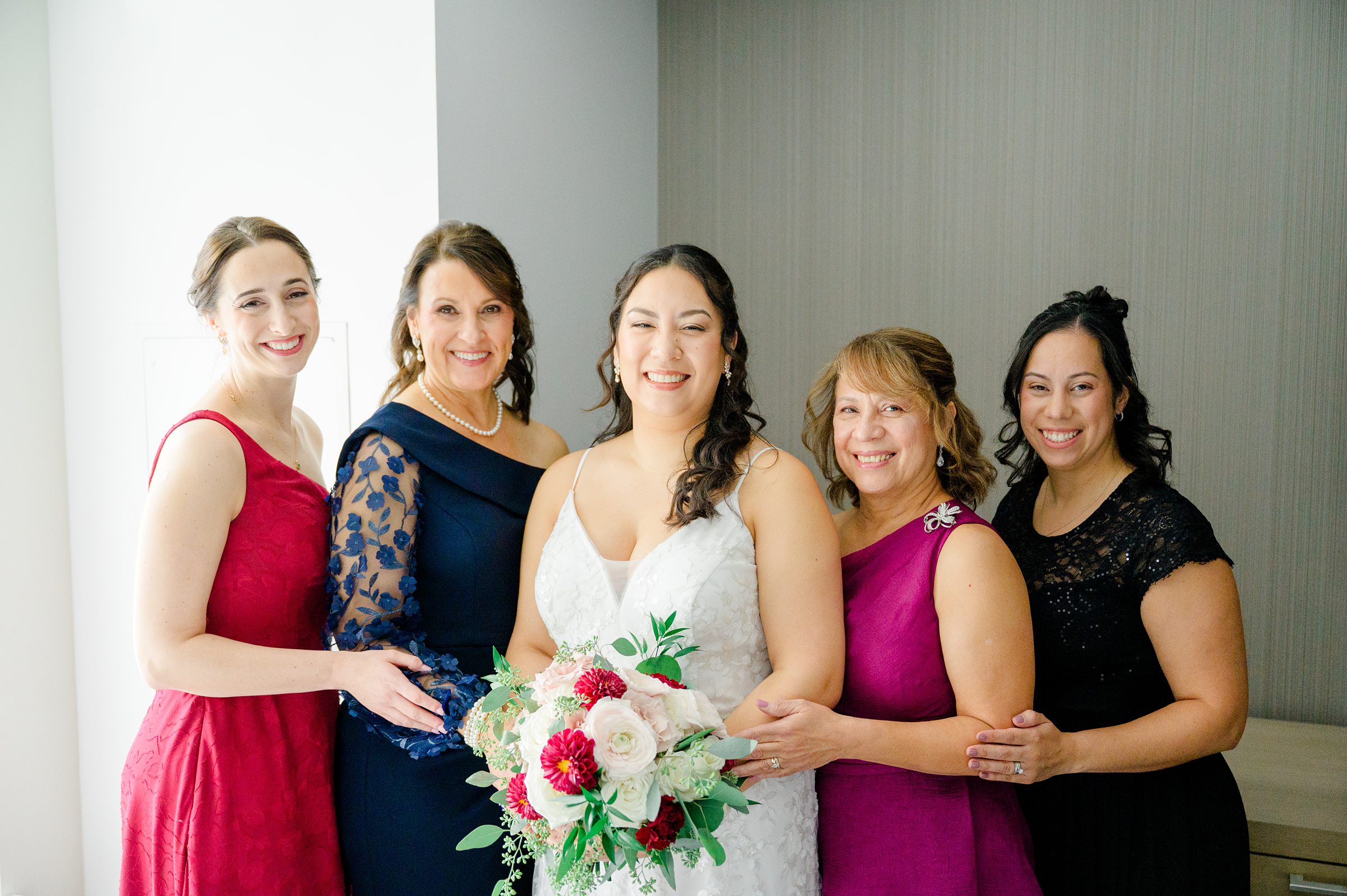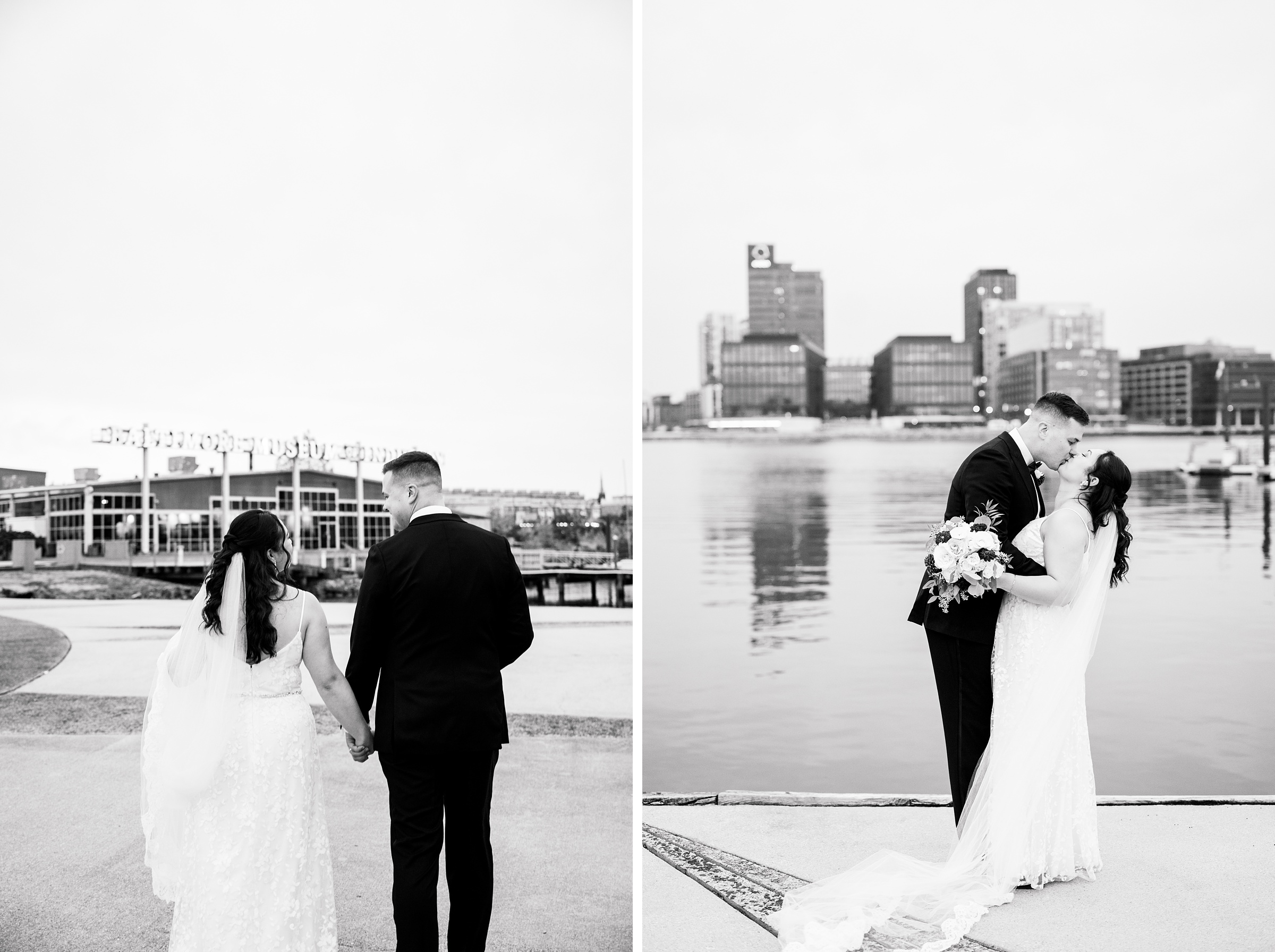 We wandered the waterfront for portraits — and honestly? I didn’t hate the overcast skies one bit… in fact… it was the perfect addition to an already stunning day! The cloudy light made the skyline pop like an absolute dream. Soon their families and wedding party joined us, and the fun kicked up even more. Melissa and Tyler are the kind of people who make you feel at ease instantly, and their family and friends are exactly the same. The energy was warm and playful and full of excitement from start to finish.