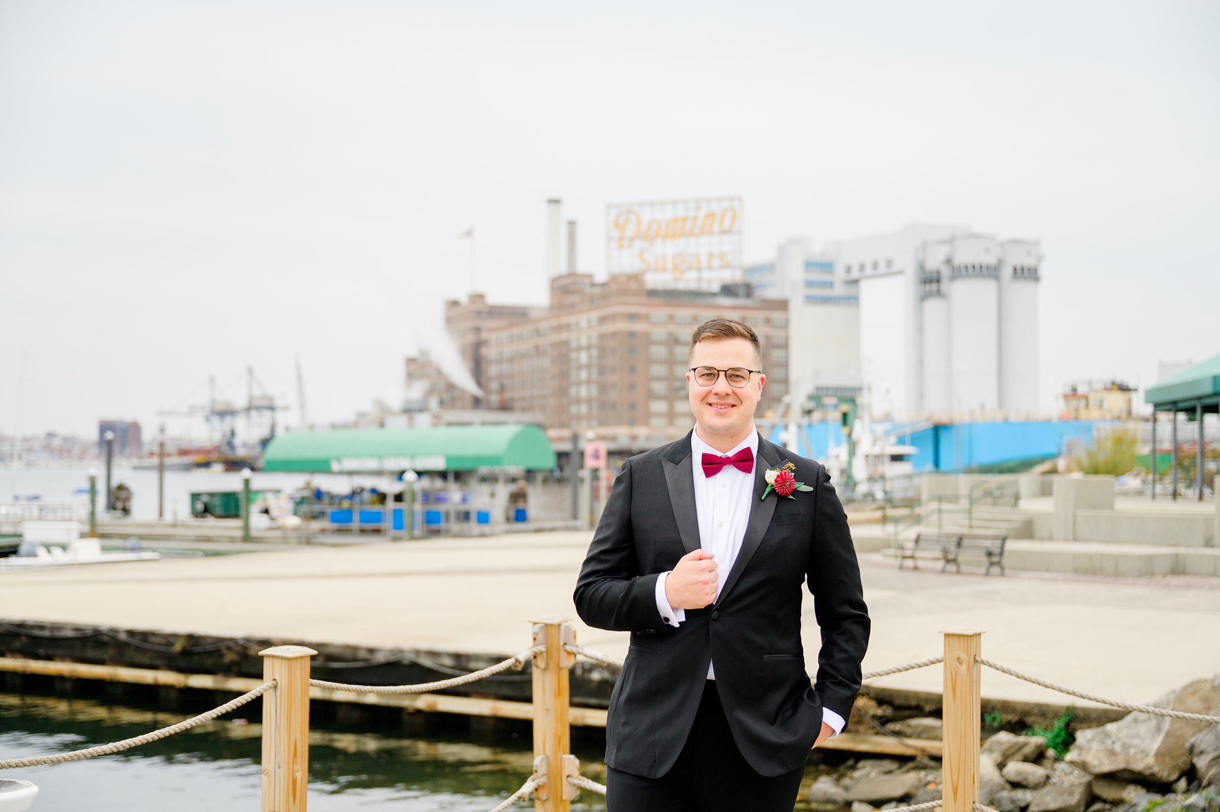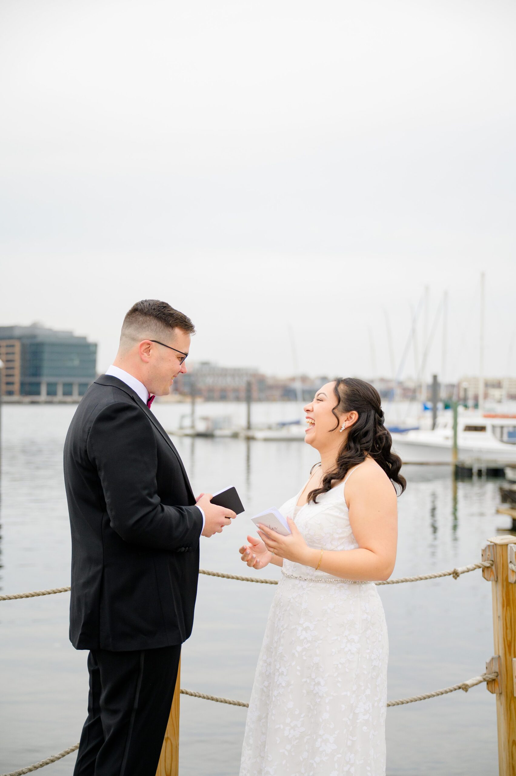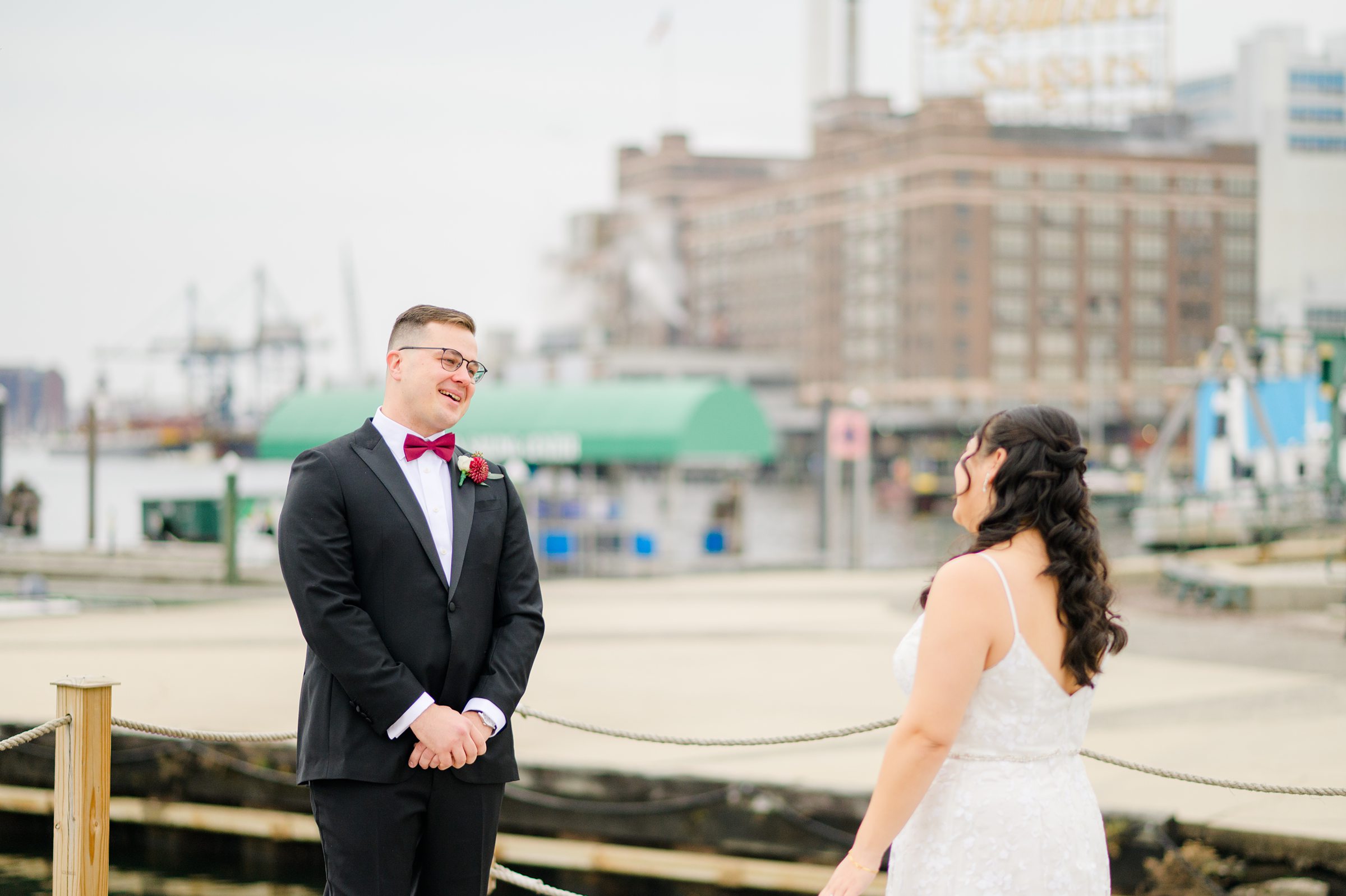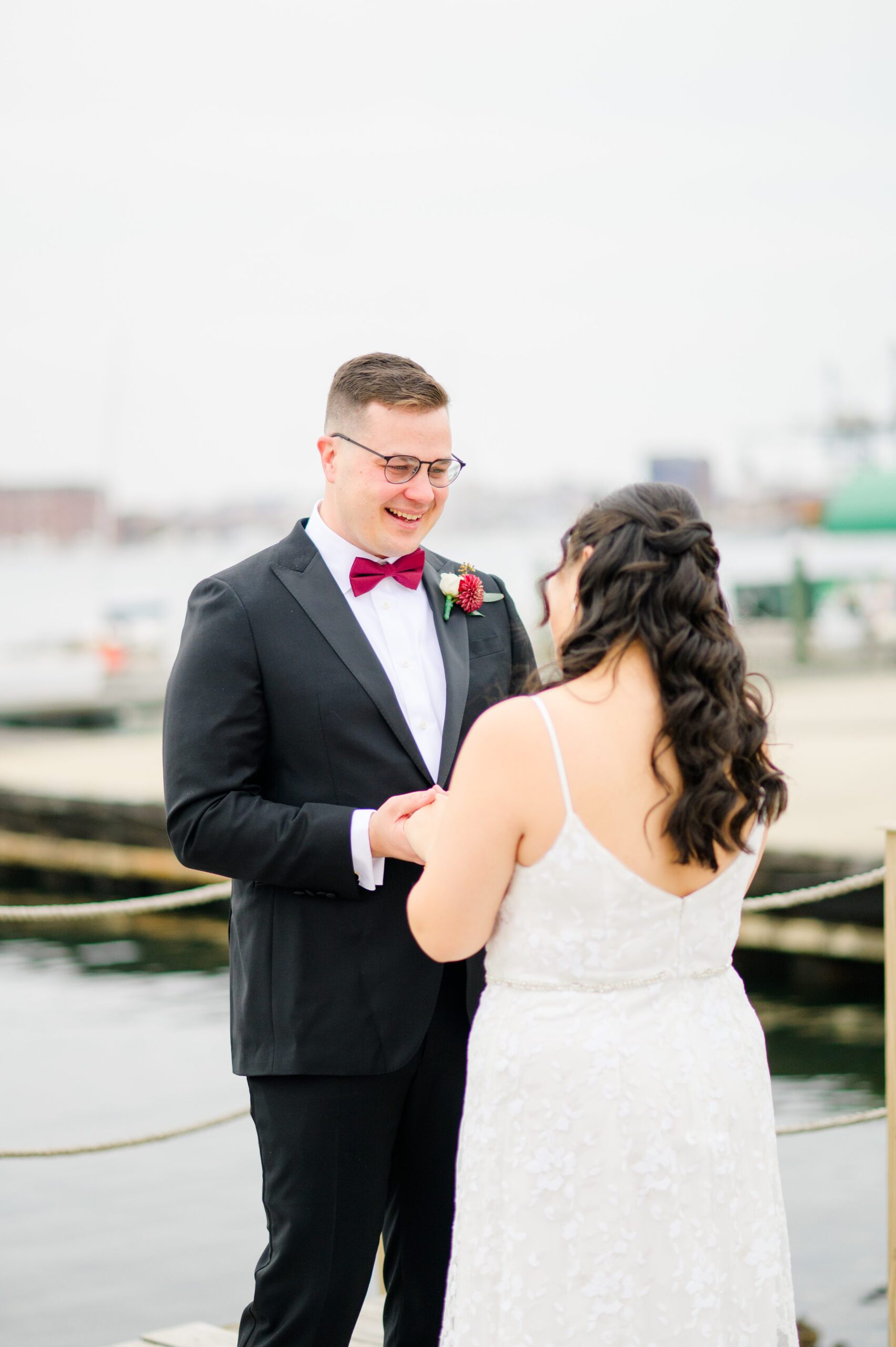 November had officially decided she wanted to lean into winter — it was chilly, cloudy, and breezy in the kind of way that makes you snag a coat, just in case… but somehow still mild enough for outdoor portraits with a few strategic warm-up breaks. These two shared their first look on the Baltimore Harbor with big smiles, a few happy tears, and the sweetest personal vows to follow. Any nerves from before melted instantly and turned straight into joy.