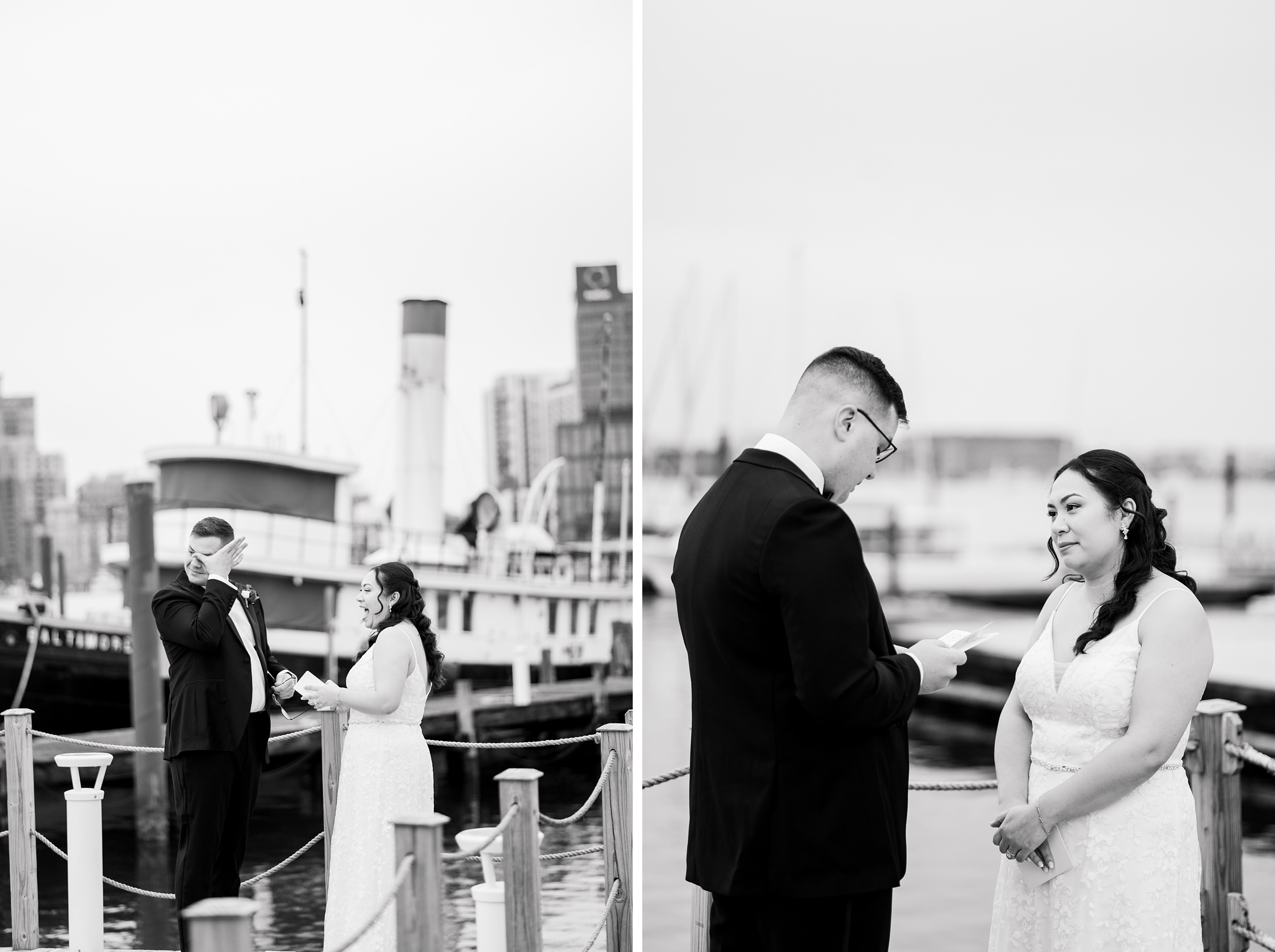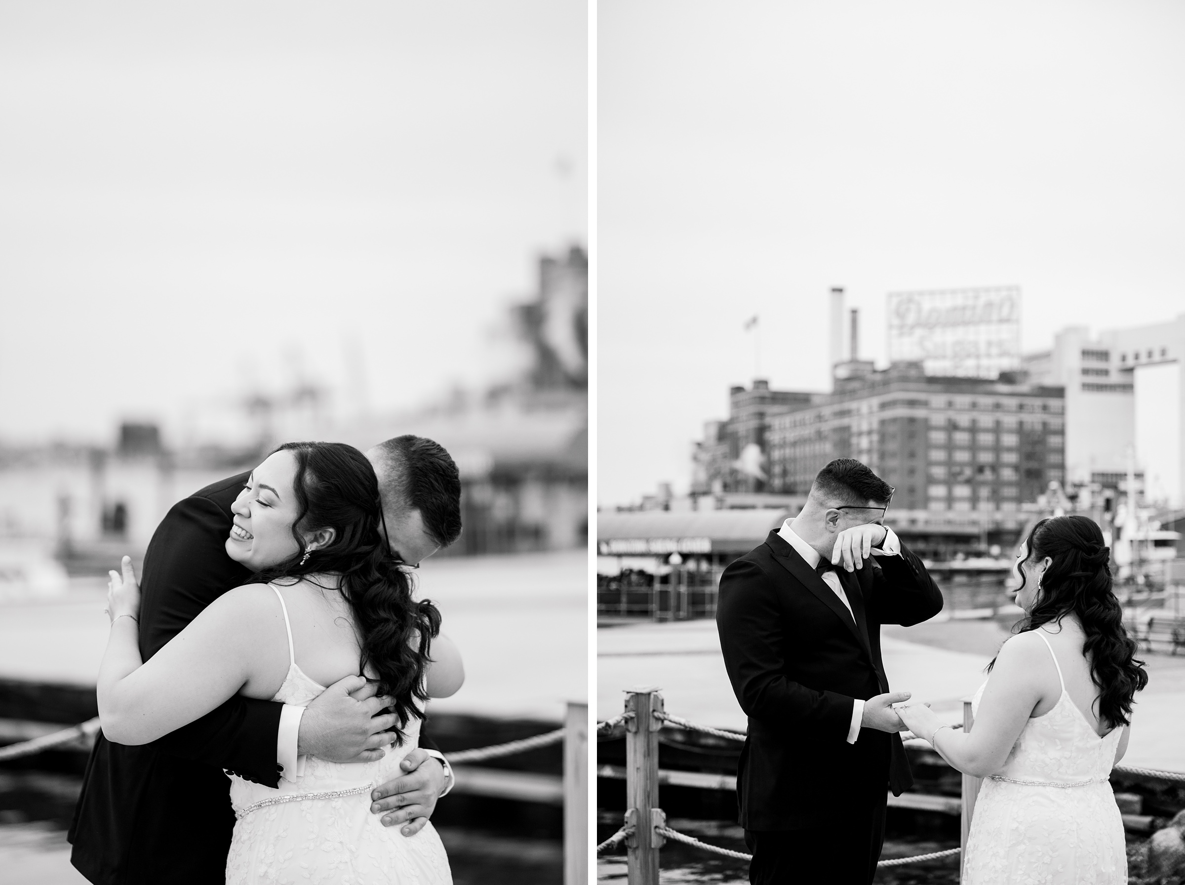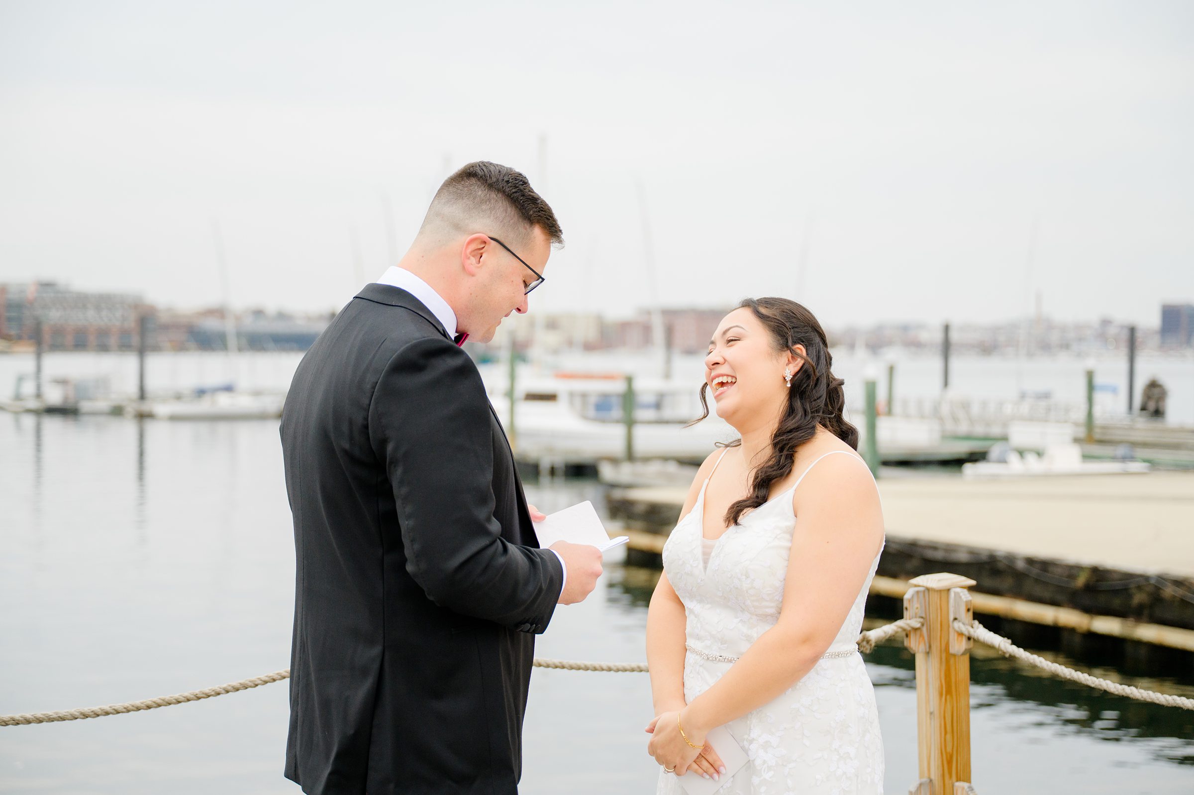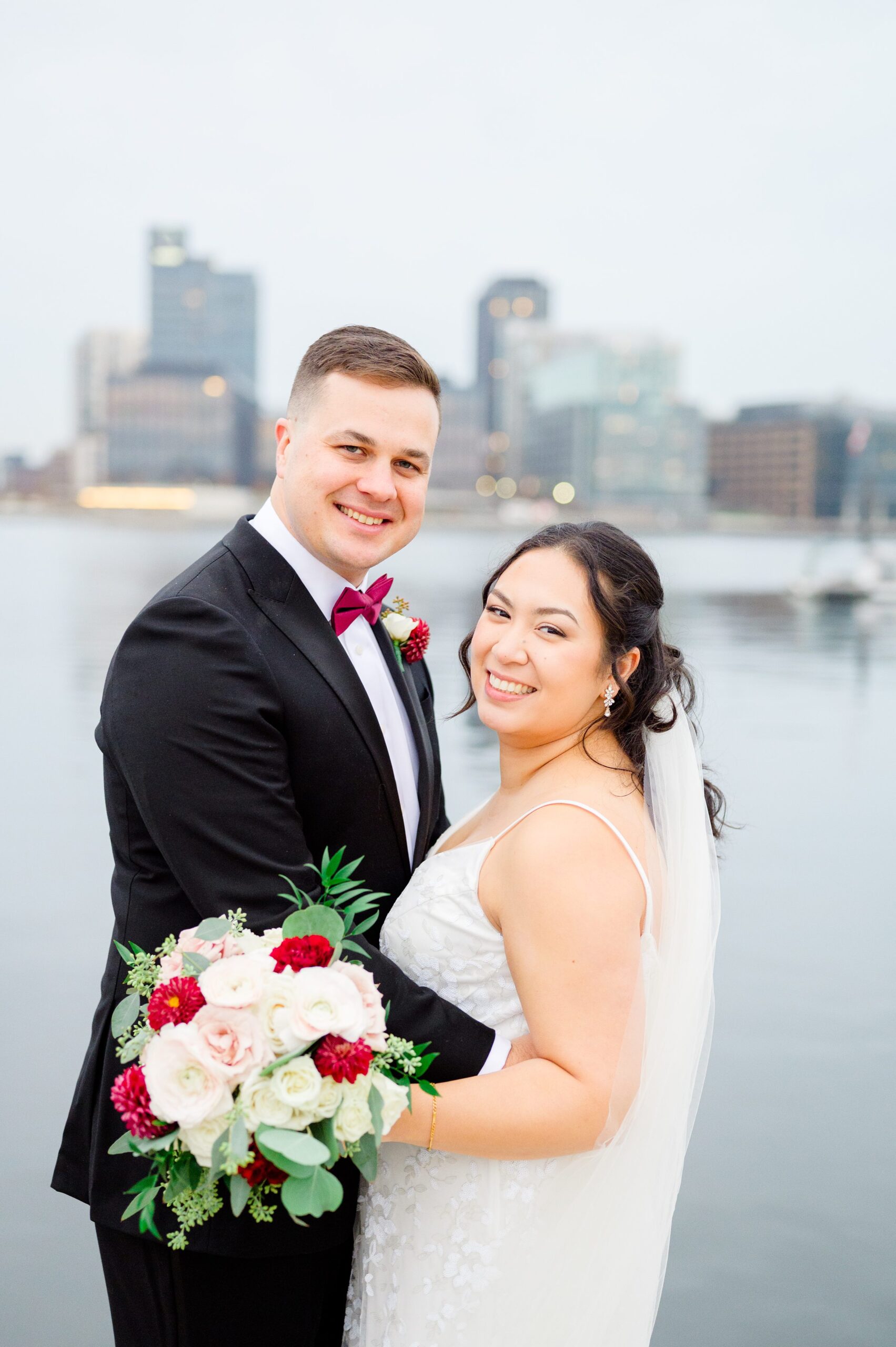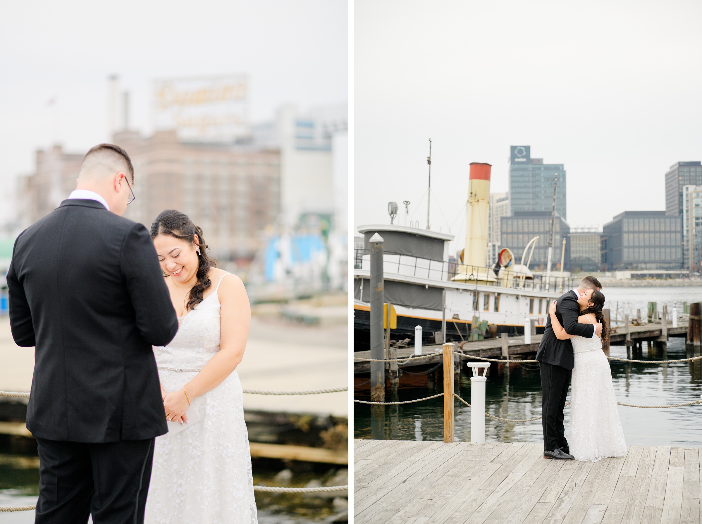 November had officially decided she wanted to lean into winter — it was chilly, cloudy, and breezy in the kind of way that makes you snag a coat, just in case… but somehow still mild enough for outdoor portraits with a few strategic warm-up breaks. These two shared their first look on the Baltimore Harbor with big smiles, a few happy tears, and the sweetest personal vows to follow. Any nerves from before melted instantly and turned straight into joy.
