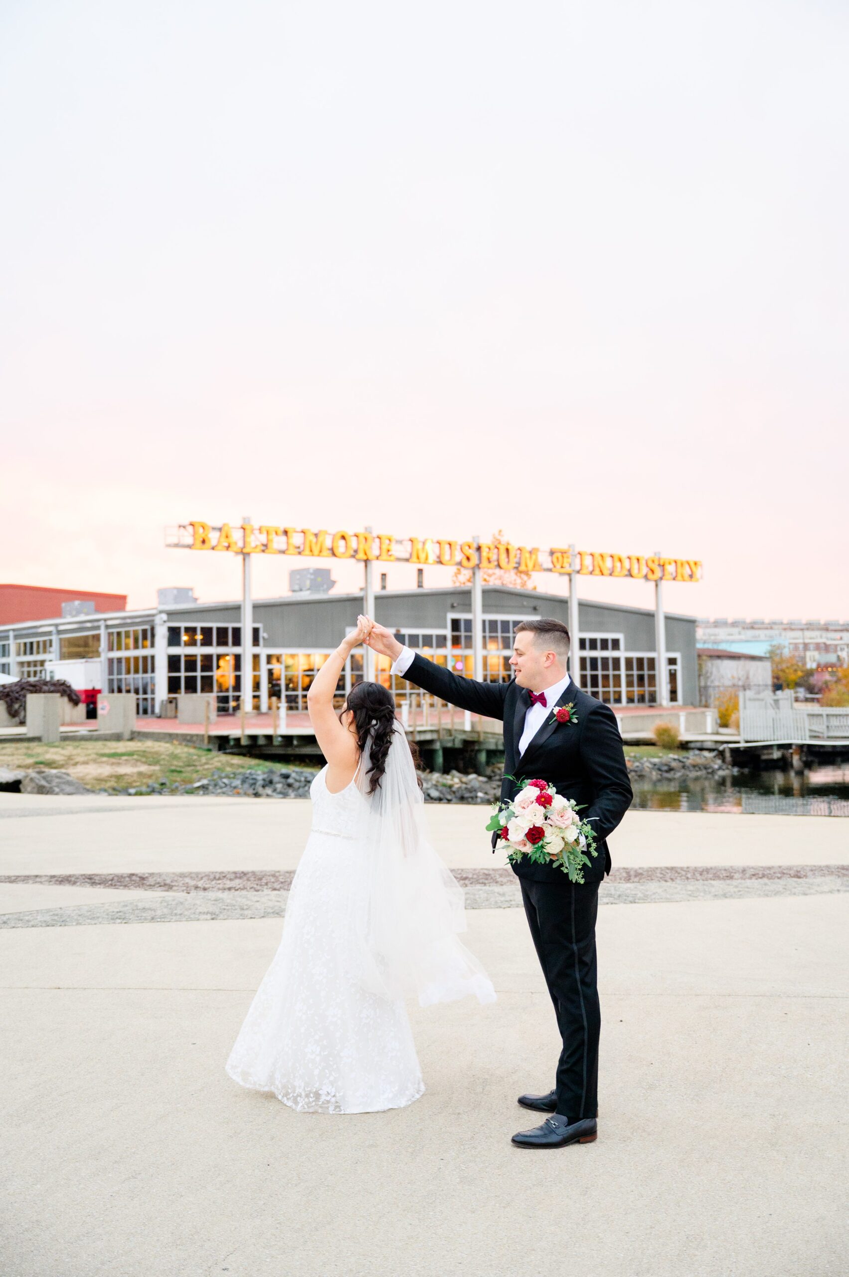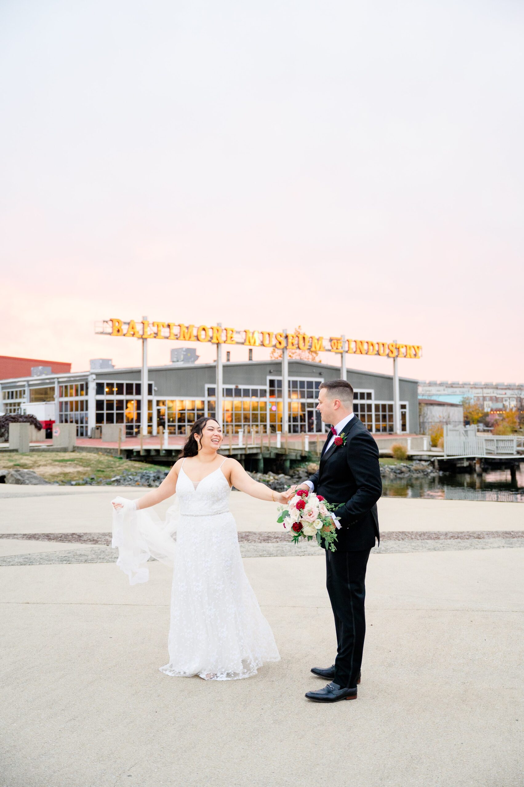 And just when we thought the sky was going to stay grey all day… it decided to surprise us. The clouds opened just enough to bring THE most stunning shades of pink and purple overhead. Melissa is a big Swiftie, so it felt like the most magical little nod to the Lover era… just the universe’s way of saying HECK YES LET’S GET THESE TWO HITCHED! It was the kind of sunset you dream of having for your Baltimore Museum of Industry wedding photos— pure magic!