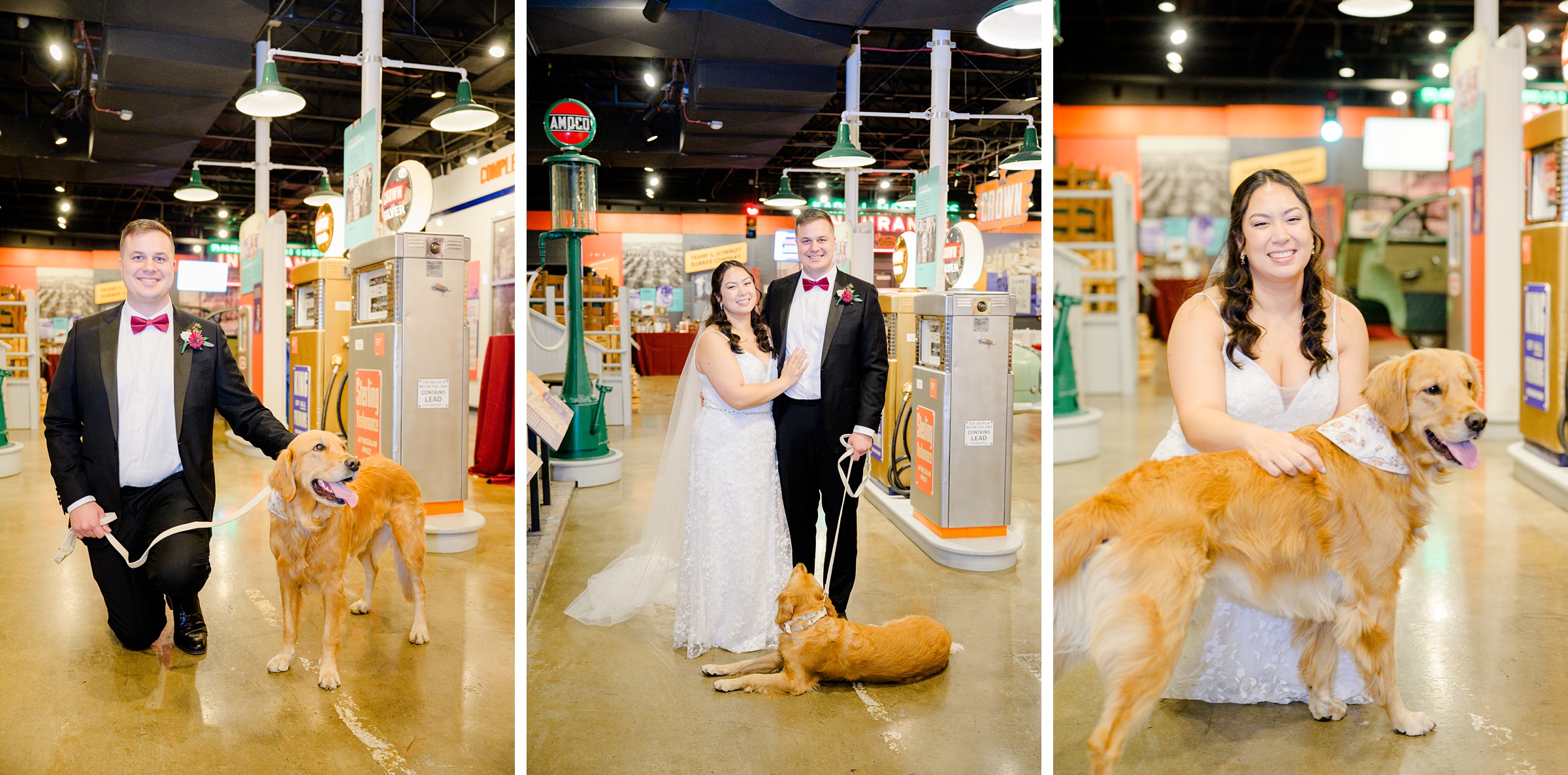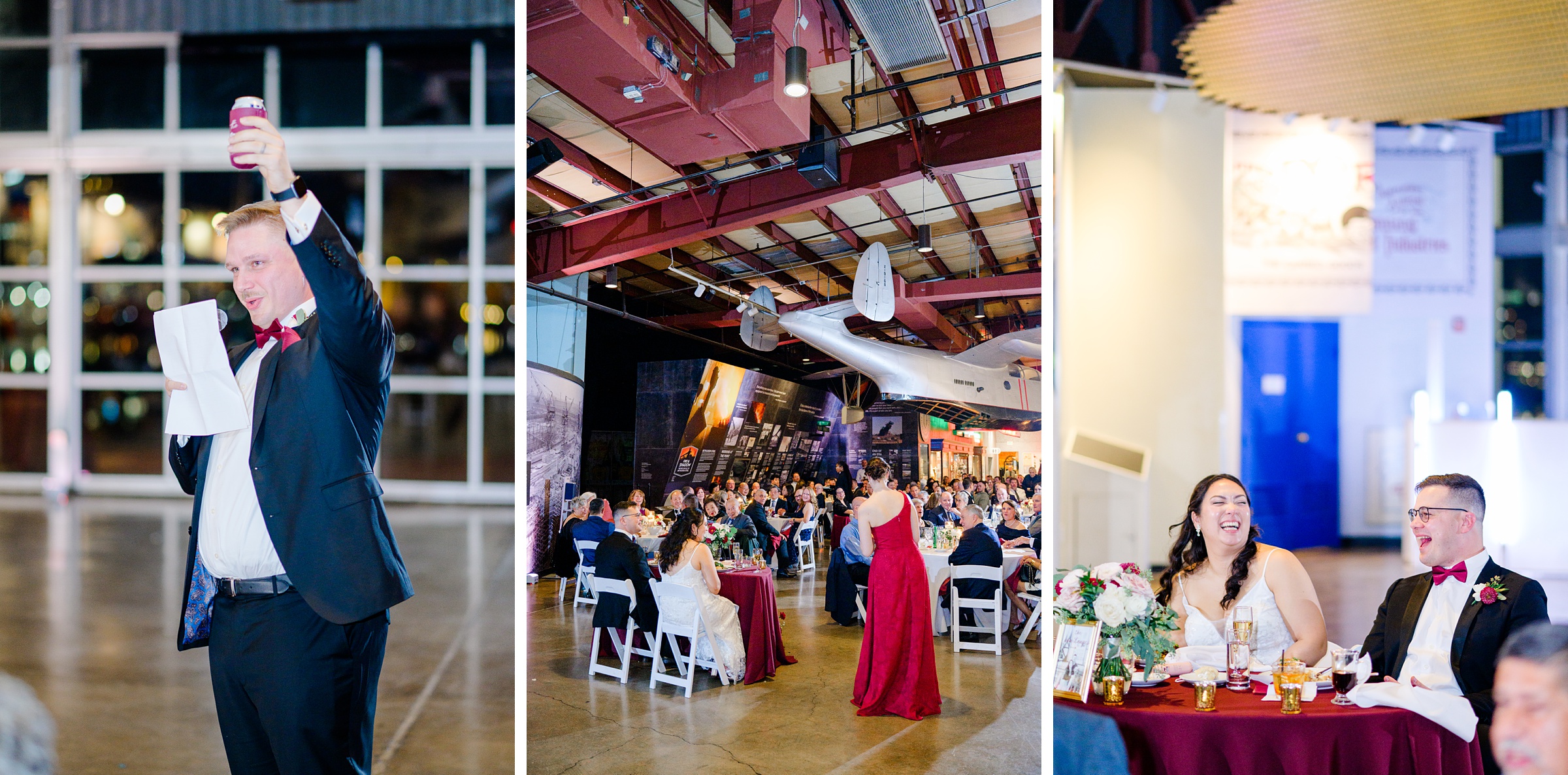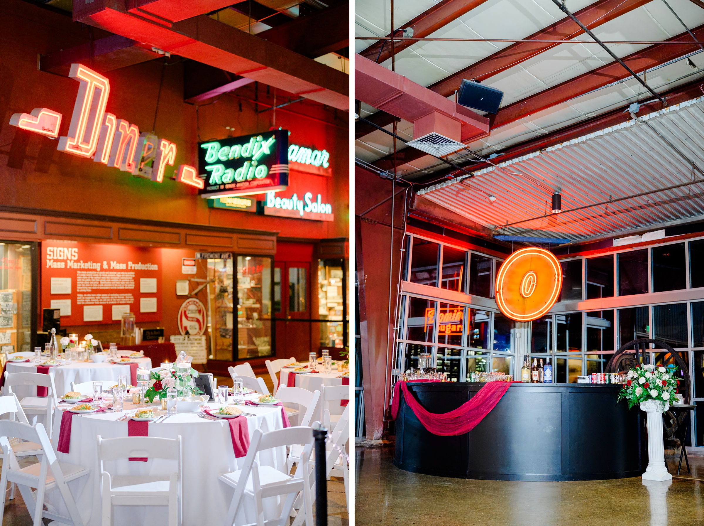 The room was stunning — pops of pink and burgundy woven through their florals (a perfect late-fall palette), sweet framed photos of their pup on each table, and place cards lovingly hand-folded by Melissa herself. Surrounded by museum artifacts — the original O from the Domino Sugar sign, vintage vehicles, neon lights, even a full airplane — the space felt unique, vibrant, and so reflective of who they are.