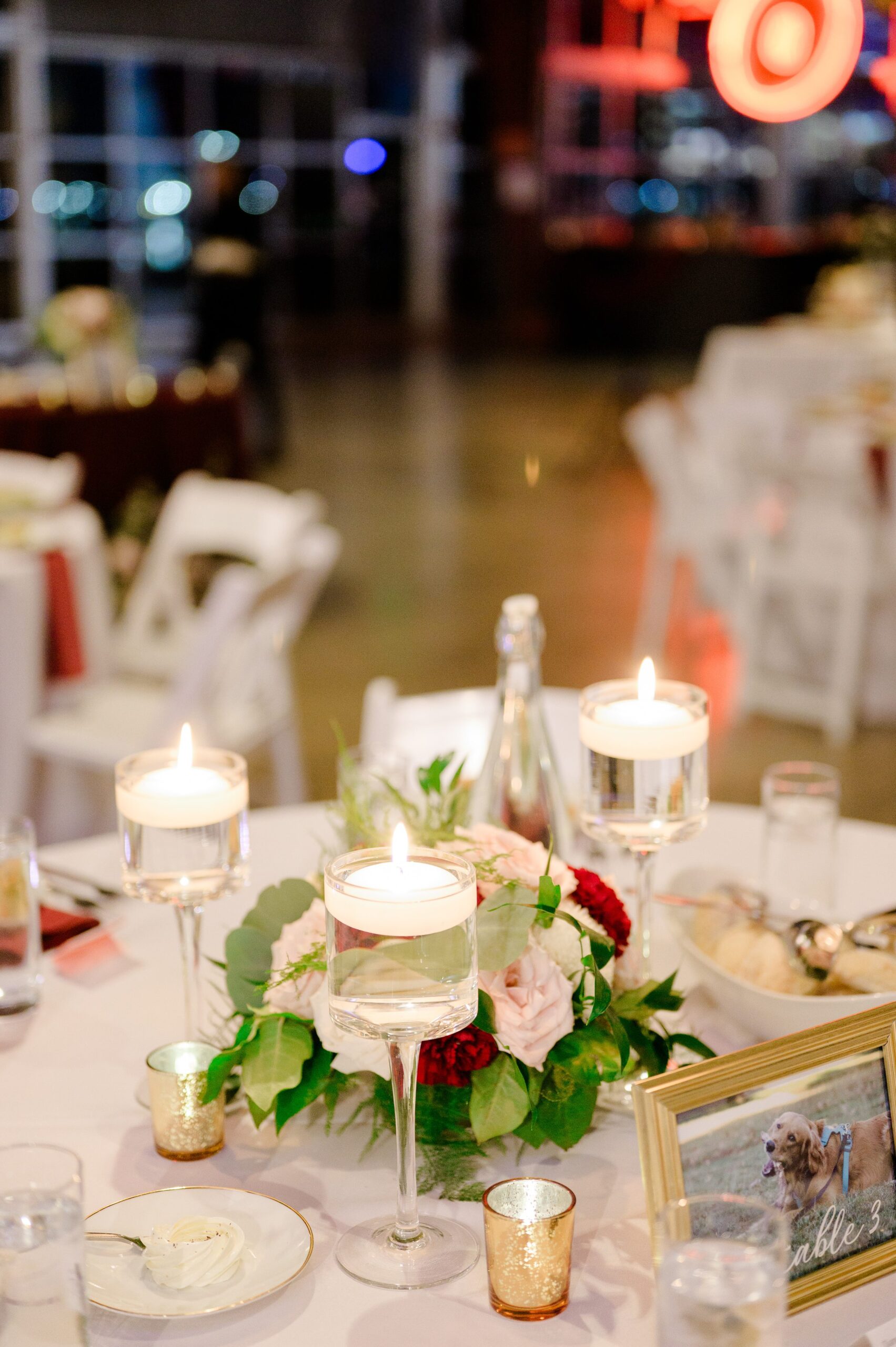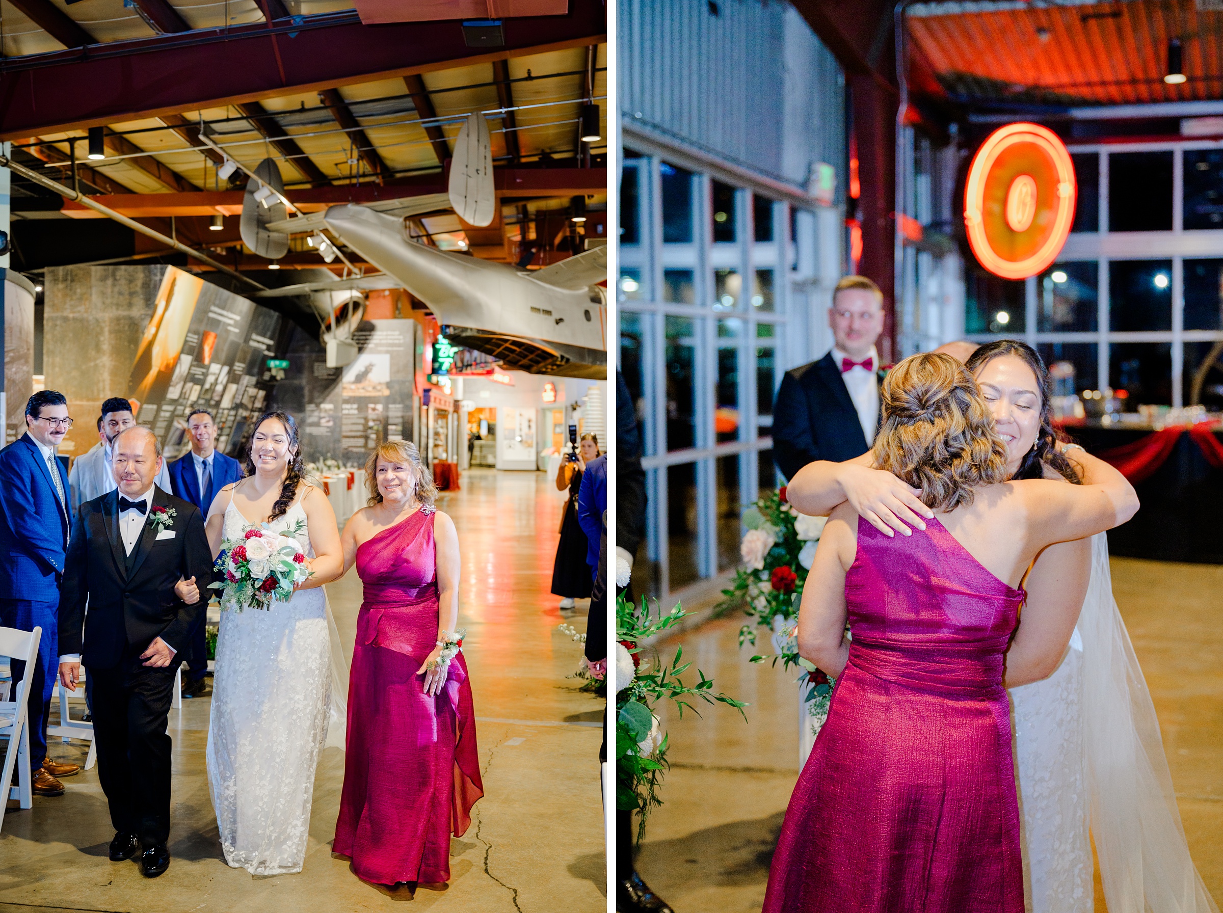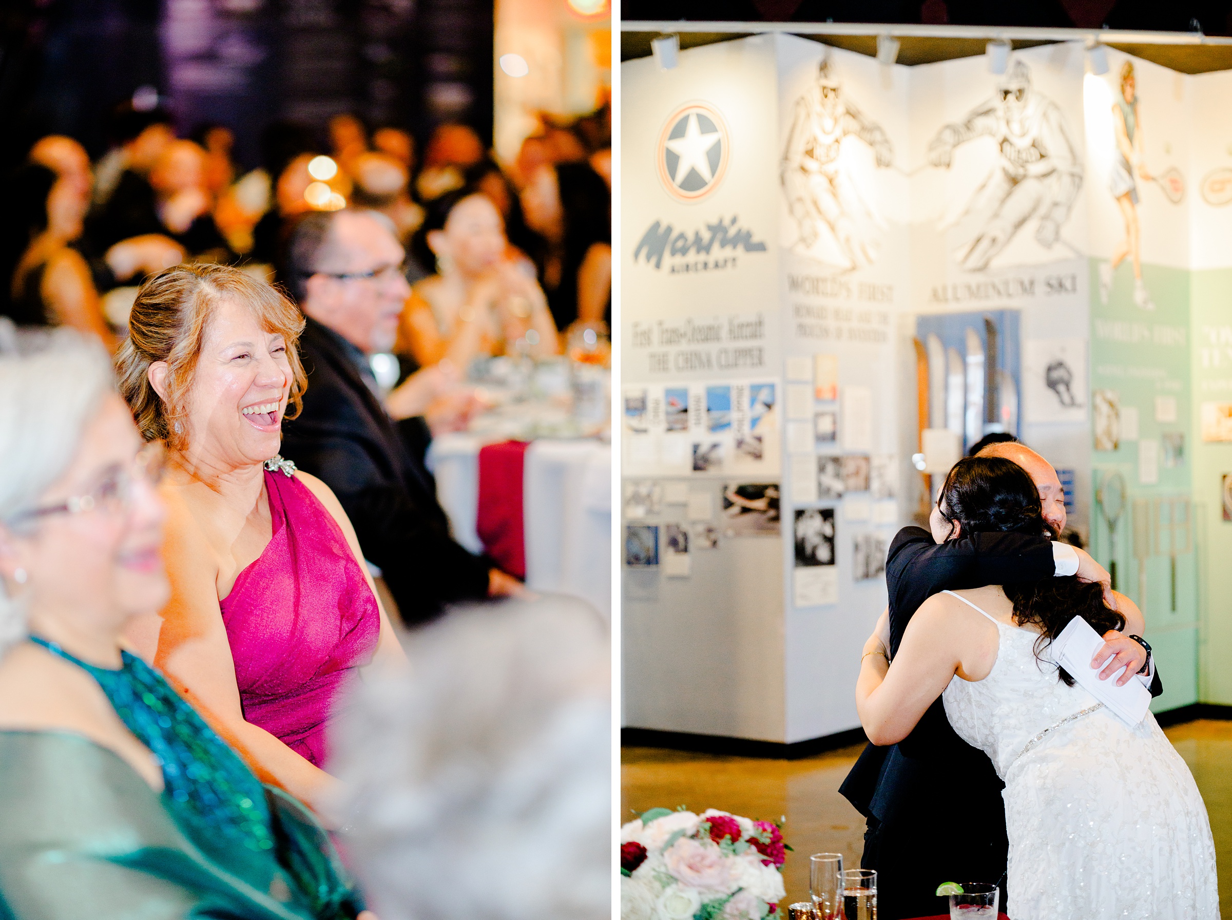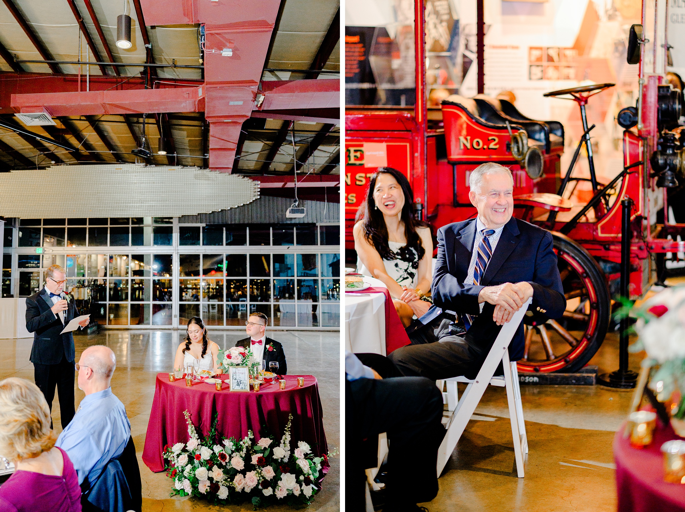 The room was stunning — pops of pink and burgundy woven through their florals (a perfect late-fall palette), sweet framed photos of their pup on each table, and place cards lovingly hand-folded by Melissa herself. Surrounded by museum artifacts — the original O from the Domino Sugar sign, vintage vehicles, neon lights, even a full airplane — the space felt unique, vibrant, and so reflective of who they are.