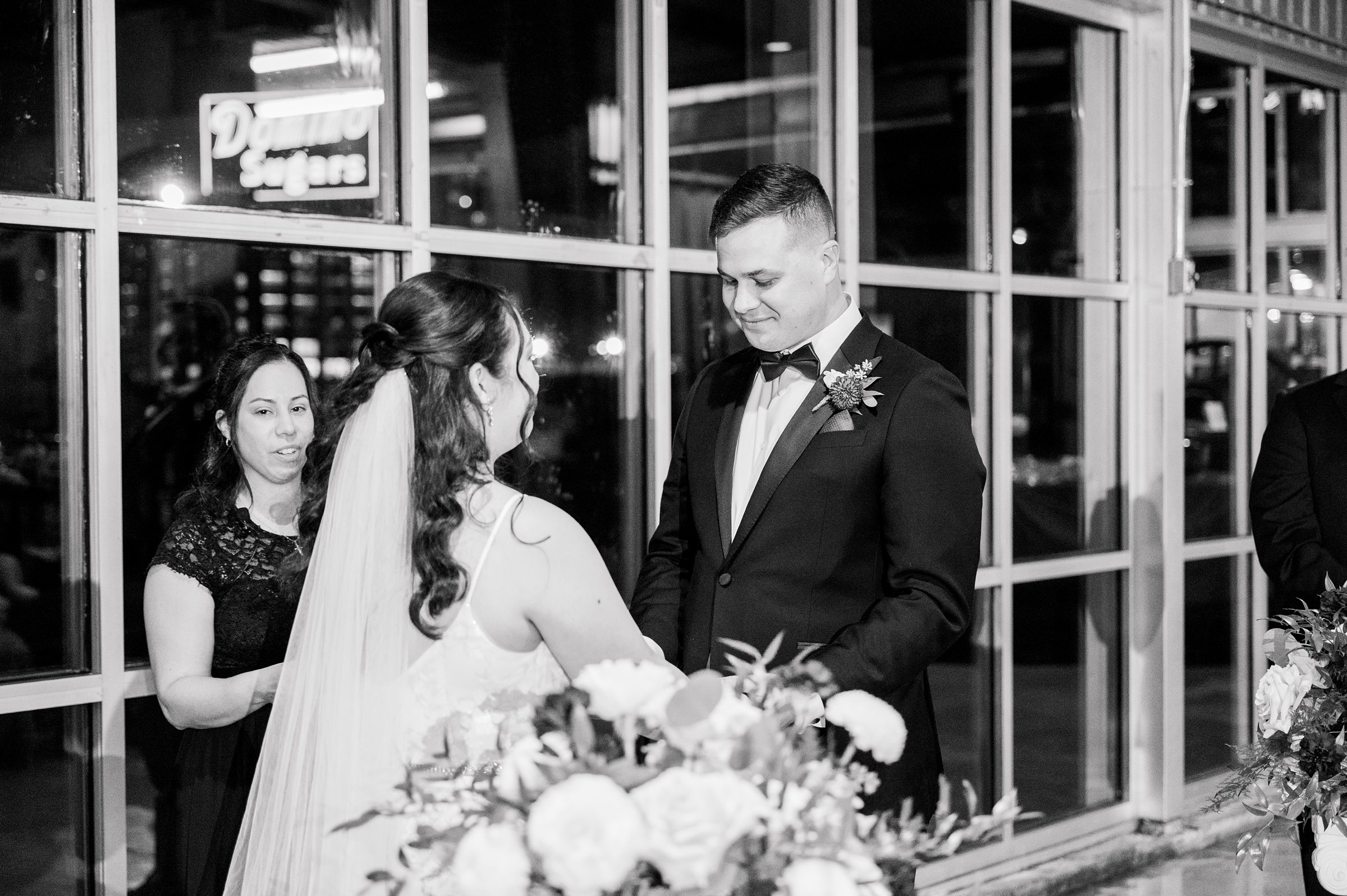 As the sun dipped fully behind the skyline, guests arrived for their post-sunset ceremony. One of the coolest things about having a BMI wedding is the flexibility the venue offers — and Melissa and Tyler used the space perfectly. While their loved ones gathered in the indoor ceremony space overlooking the night-time harbor, they relaxed in a media room tucked back away from the hustle and hugs of guest arrival. Once everyone was seated, the ceremony kicked off with Maia sniffing down the aisle and happy tears from Tyler as his bride made her way to him, escorted by both her mom and dad. The ceremony itself, officiated by Melissa’s cousin, felt intimate, heartfelt, and deeply personal. There wasn’t a dry eye in the room when they sealed it all with a kiss!