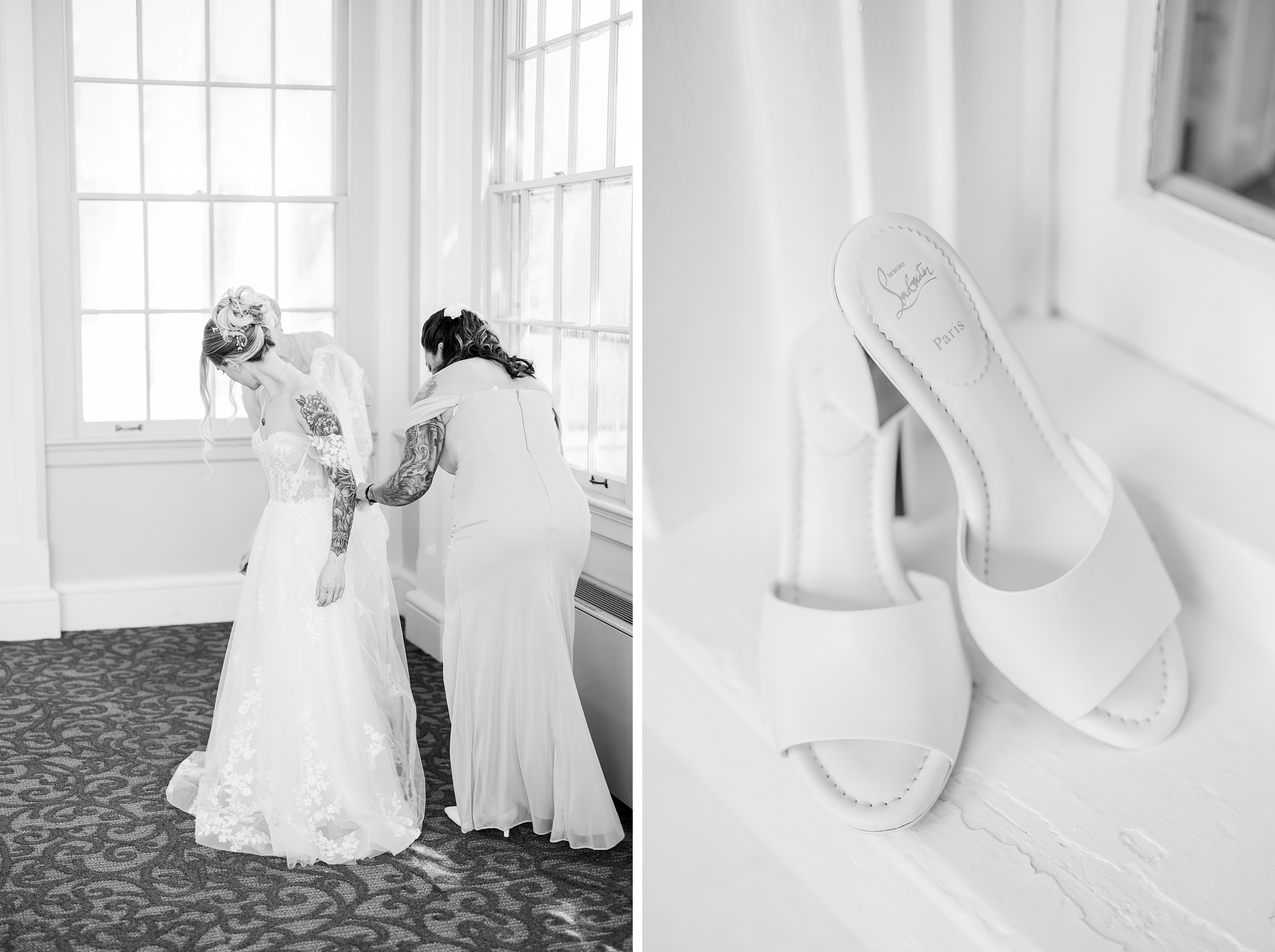 Kourtney would be getting dressed here, so her dress was hanging up and ready with her shoes and accessories close by! Let me tell you, Kourtney’s gown was absolutely breathtaking! The sparkles, the intricate beading—it was a showstopper. And those red bottoms? Oh my goodness. Savannah, my second photographer, and I got everything set up for some gorgeous detail photos before Kourtney arrived to slip into her gown!